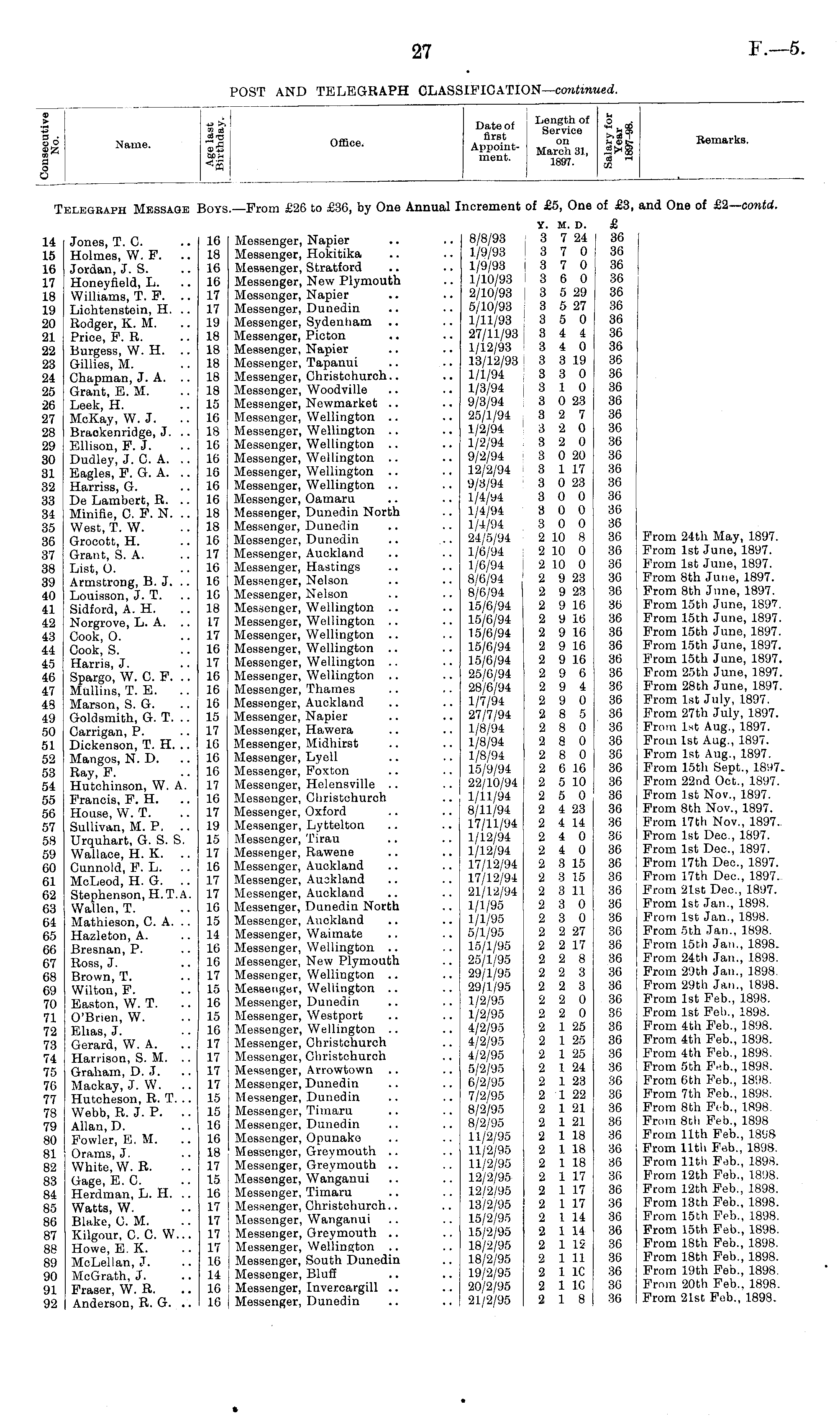 <0 > lo »?. a o o Name. _<■ c_ OjS_ Office. Date of l S_&5' first S ™ JjjT Appoint- March3] d(H§ ment. 18g7 _ _ Remarks. 14 15 16 17 18 19 20 21 22 23 21 25 26 27 28 29 30 31 32 33 34 35 36 37 38 39 40 11 42 43 44 45 46 47 48 49 50 51 52 53 54 55 56 57 58 59 00 61 02 63 64 65 00 67 08 69 70 71 72 73 74 75 76 77 78 79 80 81 82 83 81 85 86 87 88 80 00 91 92 'elegraph Message Jones, T. C. Holmes, W. F. .. Jordan, J. S. Honeyfield, L. Williams, T. F. Lichtenstein, H. .. Rodger, K. M. Price, F. R. Burgess, W. H. Gillies, M. Chapman, J. A. Grant, E. M. Leek, H. McKay, W. J. Brackenridge, J. .. Ellison, F. J. Dudley, J. C A. .. Eagles, F. G. A. .. Harriss, G. De Lambert, R. .. Minifle, C. F. N. West, T. W. Grocott, H. Grant, S. A. List, O. Armstrong, B. J. Louisson, J. T. Sidford, A. H. Norgrove, L. A. Cook, 0. Cook, S. Harris, J. Spargo, W. C. F. Mullins, T. E. Marson, S. G. Goldsmith, G. T. .. Carrigan, P. Dickenson, T. H. .. Mangos, N. D. Ray, F. Hutchinson, W. A. Francis, F. H. House, W. T. Sullivan, M. P. .. Urquhart, G. S. S. Wallace, H. K. Cunnold, F. L. McLeod, H. G. .. Stephenson, H.T. A. Wallen, T. Mathieson, C. A. Hazleton, A. Bresnan, P. Ross, J. Brown, T. Wilton, F. Easton, W. T. O'Brien, W. Ehas, J. Gerard, W. A. Harrison, S. M. .. Graham, D. J. Mackay, J. W. Hutcheson, R. T. .. Webb, R. J. P. .. Allan, D. Fowler, E. M. Orams, J. White, W. R. Gage, E. C. Herdman, L. H. Watts, W. Blake, 0. M. Kilgour, C. C. W... Howe, E. K. McLellan, J. McGrath, J. Eraser, W. R. Anderson, R. G. .. lOYS. 16 18 16 16 17 17 19 18 18 18 18 18 15 16 18 16 16 16 16 16 18 18 16 17 16 16 16 18 17 17 16 17 16 16 16 15 17 16 16 16 17 16 17 19 15 17 16 17 17 16 15 14 16 16 17 15 16 15 16 17 17 17 17 15 15 16 16 18 17 15 16 17 17 ! 17 : 17 16 ■ 14 16 16 i . —From £26 to £36, by One Annual I: Messenger, Napier Messenger, Hokitika Messenger, Stratford Messenger, New Plymouth Messenger, Napier Messenger, Dunedin Messenger, Sydenham Messenger, Picton Messenger, Napier Messenger, Tapanui Messenger, Christchurch.. Messenger, Woodville Messenger, Newmarket Messenger, Wellington Messenger, Wellington Messenger, Wellington Messenger, Wellington Messenger, Wellington Messenger, Wellington Messenger, Oamaru Messenger, Dunedin North Messenger, Dunedin Messenger, Dunedin Messenger, Auckland Messenger, Hastings Messenger, Nelson Messenger, Nelson Messenger, Wellington Messenger, Wellington .. Messenger, Wellington Messenger, Wellington Messenger, Wellington Messenger, Wellington Messenger, Thames Messenger, Auckland Messenger, Napier Messenger, Hawera Messenger, Midhirst Messenger, Lyell Messenger, Foxton Messenger, Helensville Messenger, Christchurch Messenger, Oxford Messenger, Lyttelton Messenger, Tirau Messenger, Rawene Messenger, Auckland Messenger, Auckland Messenger, Auckland Messenger, Dunedin North Messenger, Auckland Messenger, Waimate Messenger, Wellington Messenger, New Plymouth Messenger, Wellington Messenger, Wellington Messenger, Dunedin Messenger, Westport Messenger, Wellington Messenger, Christchurch Messenger, Christchurch Messenger, Arrowtown Messenger, Dunedin Messenger, Dunedin Messenger, Timaru Messenger, Dunedin Messenger, Opunake Messenger, Greymouth Messenger, Greymouth Messenger, Wanganui Messenger, Timaru Messenger, Christchurch.. Messenger, Wanganui Messenger, Greymouth Messenger, Wellington Messenger, South Dunedin Messenger, Bluff Messenger, Invercargill Messenger, Dunedin lcrement of £5, One Y. M. D. 8/8/93 3 7 24 1/9/93 3 7 0 1/9/93 3 7 0 1/10/93 3 6 0 2/10/93 3 5 29 5/10/93 3 5 27 1/11/93 3 5 0 27/11/93 ,344 1/12/93 3 4 0 13/12/93 3 3 19 1/1/94 3 3 0 1/3/94 ,310 9/3/94 3 0 23 25/1/94 3 2 7 1/2/94 3 2 0 1/2/94 3 2 0 9/2/94 3 0 20 12/2/94 3 1 17 9/3/94 3 0 23 1/4/94 3 0 0 1/4/94 3 0 0 1/4/94 3 0 0 24/5/94 2 10 8 1/6/94 2 10 0 1/6/94 2 10 0 8/6/94 2 9 23 8/6/94 2 9 23 15/6/94 2 9 16 15/6/94 2 9 16 15/6/94 2 9 16 15/6/94 2 9 16 15/6/94 2 9 16 25/6/94 2 9 6 28/6/94 2 9 4 1/7/94 2 9 0 27/7/94 2 8 5 1/8/94 2 8 0 1/8/94 2 8 0 1/8/94 2 8 0 15/9/94 2 0 16 22/10/94 2 5 10 1/11/94 2 5 0 8/11/94 2 4 23 17/11/94 2 4 14 1/12/94 2 4 0 1/12/94 2 4 0 17/12/94 2 3 15 17/12/94 2 3 15 21/12/94 2 3 11 1/1/95 2 3 0 1/1/95 2 3 0 5/1/95 2 2 27 15/1/95 2 2 17 25/1/95 2 2 8 29/1/95 2 2 3 29/1/95 2 2 3 1/2/95 2 2 0 1/2/95 2 2 0 4/2/95 2 1 25 4/2/95 2 1 25 4/2/95 2 1 25 5/2/95 2 1 24 6/2/95 2 1 23 7/2/95 2 1 22 8/2/95 2 1 21 8/2/95 2 1 21 11/2/95 2 1 18 11/2/95 2 1 18 11/2/95 2 1 18 12/2/95 2 1 17 12/2/95 2 1 17 13/2/95 2 1 17 15/2/95 2 1 14 15/2/95 2 1 14 18/2/95 2 1 15 18/2/95 2 1 11 19/2/95 2 1 1C 20/2/95 2 1 10 21/2/95 2 18 of £3, £ | 36 36 36 36 36 36 36 36 36 36 36 36 36 36 36 36 36 36 36 36 36 36 36 36 36 36 36 36 36 36 36 36 36 36 36 36 36 30 36 36 36 36 36 36 36 36 36 36 36 36 36 36 36 36 36 36 36 36 36 36 36 36 36 30 36 30 36 36 36 36 36 36 36 36 36 36 36 36 36 and One of £2—contd. From 24th May, 1897. From 1st June, 1897. From 1st June, 1897. From 8th June, 1897. From 8th June, 1897. From 15th June, 189 . From 15th June, 1897. From 15th June, 1897. From 15th June, 1897. From 15th June, 1897. From 25th June, 1897. From 28th June, 1897. From 1st July, 1897. From 27th July, 1897. From 1st Aug., 1897. From 1st Aug., 1897. From 1st Aug., 1897. From 15th Sept., 1897. From 22nd Oct., 1897. From 1st Nov., 1897. From 8th Nov., 1897. From 17th Nov., 1897. From 1st Dec, 1397. From 1st Dec, 1897. From 17th Dec, 1897. From 17th Dec, 1897. From 21st Doc, 1897. From 1st Jan., 1898. From 1st Jan., 1898. From 5th Jan., 1898. From 15th Jan., 1898. From 24th Jan., 1898. From 29th Jan., 1898. From 29th Jan., 1898. From 1st Feb., 1898. From 1st Feb., 1898. From 4th Feb., 1898. From 4th Feb., 1898. From 4th Feb., 1898. From 5th Feb., 1898. From 6th Feb., 1898. From 7th Feb., 1898. From 8th Feb., 1898. From 8th Feb., 1898 From 11th Feb., 1898 From 11th Feb., 1898. From 11th Feb., 1898. From 12th Feb., 1898. From 12th Feb., 1898. From 13th Feb., 1898. From 15th Feb., 1898. From 15th Feb., 1898. From 18th Feb., 1898