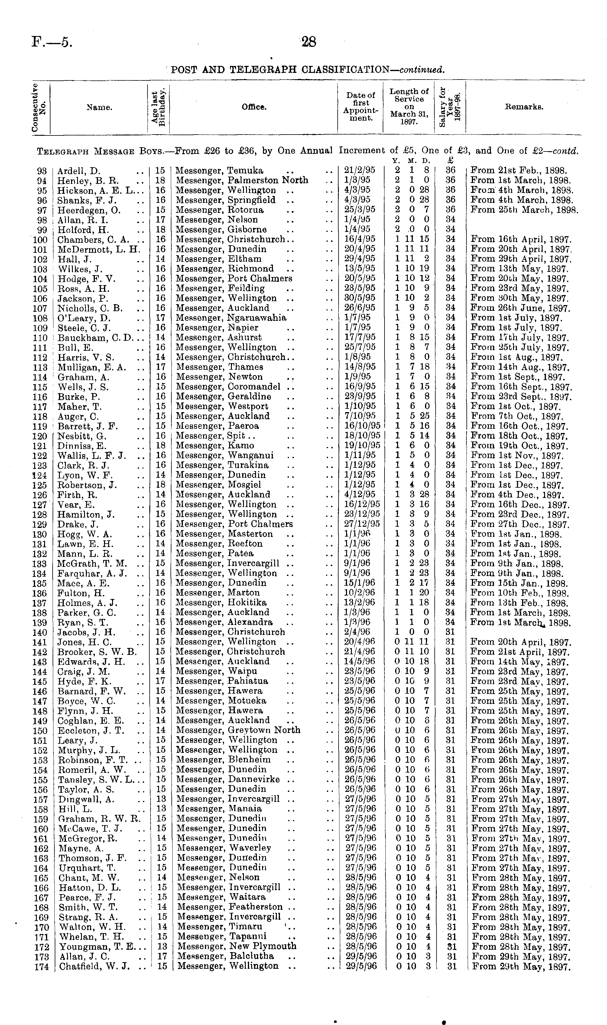 Ch o O cog en" a o o Name. 44 r>. 0J7ODrH Office. Dateof I-J&- y MarJU |«| Remarks. Telegraph Message B, IYS.--From £26 to £36, by One Annual Incromen of £5, On Y. M. D. 2 18 2 10 2 0 28 2 0 28 2 0 7 2 0 0 2 0 0 1 11 15 1 11 11 1 11 2 1 10 19 1 10 12 1 10 9 1 10 2 19 5 19 0 1 9 0 1 8 15 18 7 18 0 1 7 18 17 0 1 6 15 16 8 1 6 0 1 5 25 1 5 10 1 5 14 16 0 15 0 14 0 14 0 14 0 1 3 28 1 3 16 1 3 9 13 5 13 0 13 0 13 0 1 2 23 1 2 23 1 2 17 1 1 20 1 1 18 1 1 0 110 10 0 0 11 11 0 11 10 0 10 18 0 10 9 0 10 9 0 10 7 0 10 7 0 10 7 0 10 8 0 10 6 0 10 6 0 10 6 0 10 6 0 10 6 0 10 0 0 10 6 0 10 5 0 10 5 0 10 5 0 10 5 0 10 5 0 10 5 0 10 5 0 10 5 0 10 4 0 10 4 0 10 4 0 10 4 0 10 4 0 10 4 0 10 4 0 10 4 0 10 3 0 10 3 of £a £ 36 36 36 36 36 34 34 34 34 34 34 34 34 34 34 34 34 34 34 34 34 34 34 34 34 34 34 34 34 34 34 34 34 34 81 34 | 34 34 i 34 34 34 34 34 34 34 34 34 31 31 31 31 31 31 31 31 31 31 31 31 31 31 31 31 31 31 31 31 31 81 81 31 31 31 31 31 31 31 31 31 31 31 81 I, and One of £2— contd. 93 | Ardell, D. 94 ! Henley, B. R. 95 : Hickson, A. E. L... 96 , Shanks, F. J. 97 ! Heerdegen, O. 98 Allan, R. I. 99 Holford, H. 100 Chambers, C. A. 101 MoDermott, L. H. 102 ' Hall, J. 103 Wilkes, J. 104 Hodge, P. V. 105 ] Ross, A. H. 106 Jackson, P. 107 : Nicholls, OB. 108 O'Leary, D. 109 ' Steele, C. J. 110 Bauckham, C. D. .. 111 Bull, E. 112 Harris, V. S. 113 Mulligan, E. A. 114 Graham, A. 115 Wells, J. S. 116 Burke, P. 117 Maher, T. 118 Auger, C. 119 Barrett, J. P. 120 Nesbitt, G. 121 Dinniss, E. 122 Wallis, L. P. J. 123 Clark, R. J. 124 Lyon, W. P. 125 Robertson, J. 126 Pirth, R. 127 Vear, E. 128 Hamilton, J. 129 Drake. J. 130 Hogg, W. A. 131 Lawn, E. H. 132 Mann, L. R. 133 McGrath, T. M. 134 Farquhar, A. J. 135 Mace, A. E. 136 Fulton, H. 137 Holmes, A. J. 138 Parker, G. C. 139 Ryan, S. T. 140 Jacobs, J. H. 141 Jones, H. C. 142 Brooker, S. W. B. 143 Edwards, J. H. 144 Craig, J. M. 145 Hyde, P. K. 146 Barnard, P. W. 147 Boyce, W. C. 148 I Plynn, J. H. 149 Coghlan, E. E. 150 Eccleton, J. T. .. 151 Leary, J. 152 Murphy, J. L. 153 Robinson, F. T. 154 Romeril, A. W. .. 155 Tansley, S. W. L. .. 156 Taylor, A. S. 157 Dingwall, A. 158 Hill, L. 159 Graham, R. W. R. 160 McCawe, T. J. 161 I McGregor, R. 162 I Mayne. A. 163 Thomson, J. P. 164 ! Urquhart, T. 165 Chant, M. W. 166 Hatton, D. L. 167 Pearce, P. J. 168 Smith, W. T. 169 Strang, R. A. 170 Walton, W. H. .. 171 Whelan, T. H. .. 172 Youngman, T. E... 173 Allan, J. C. 174 Chatfield, W. J. .. 15 18 16 16 15 17 18 16 16 14 16 16 16 16 16 17 16 14 16 14 17 16 15 16 15 15 15 16 18 16 16 14 18 14 16 15 16 16 14 14 15 14 16 16 16 14 16 16 15 15 15 14 17 15 14 15 14 14 15 15 15 15 15 15 13 13 ' 15 I 15 I 14 15 15 ! 15 14 15 15 14 15 14 15 13 17 15 Messenger, Temuka Messenger, Palmerston North Messenger, Wellington Messenger, Springfield Messenger, Rotorua Messenger, Nelson Messenger, Gisborne Messenger, Christchurch Messenger, Dunedin Messenger, Eltham Messenger, Richmond Messenger, Port Chalmers Messenger, Peilding Messenger, Wellington Messenger, Auckland Messenger, Ngaruawahia Messenger, Napier Messenger, Ashurst Messenger, Wellington Messenger, Christchurch.. Messenger, Thames Messenger, Newton Messenger, Coromandel Messenger, Goraldine Messenger, Westport Messenger, Auckland Messenger, Paeroa Messenger, Spit Messenger, Kamo Messenger, Wanganui Messenger, Turakina Messenger, Dunedin Messenger, Mosgiel Messenger, Auckland Messenger, Wellington Messenger, Wellington Messenger, Port Chalmers Messenger, Masterton Messenger, Reefton Messenger, Patea Messenger, Invercargill Messenger, Wellington Messenger, Dunedin Messenger, Marton Messenger, Hokitika Messenger, Auckland Messenger, Alexandra Messenger, Christchurch Messenger, Wellington .. Messenger, Christchurch Messenger, Auckland Messenger, Waipu Messenger, Pahiatua Messenger, Hawera Messenger, Motueka Messenger, Hawera Messenger, Auckland Messenger, Greytown North Messenger, Wellington Messenger, Wellington Messenger, Blenheim Messenger, Dunedin Messenger, Dannevirke Messenger, Dunedin Messenger, Invercargill Messenger, Manaia Messenger, Dunedin Messenger, Dunedin Messenger, Dunedin Messenger, Waverley Messenger, Dunedin Messenger, Dunedin Messenger, Nelson Messenger, Invercargill Messenger, Waitara Messenger, Featherston Messenger, Invercargill Messenger, Timaru ',, Messenger, Tapanui Messenger, New Plymouth Messenger, Balclutha Messenger, Wellington 21/2/95 1/3/95 4/3/95 4/3/95 25/3/95 1/4/95 1/4/95 16/4/95 20/4/95 29/4/95 13/5/95 20/5/95 23/5/95 30/5/95 20/6/95 1/7/95 1/7/95 17/7/95 25/7/95 1/8/95 14/8/95 1/9/95 16/9/95 23/9/95 1/10/95 7/10/95 16/10/95 18/10/95 19/10/95 1/11/95 1/12/95 1/12/95 1/12/95 4/12/95 10/12/95 23/12/95 27/12/95 1/1/96 1/1/96 1/1/96 9/1/96 9/1/96 15/1/96 10/2/90 13/2/96 1/3/96 1/3/96 2/4/96 20/4/96 21/4/96 14/5/96 23/5/96 23/5/96 25/5/96 25/5/96 25/5/96 26/5/96 26/5/96 26/5/96 26/5/96 26/5/96 26/5/96 26/5/96 26/5/96 27/5/96 27/5/96 27/5/96 27/5/96 27/5/96 27/5/90 27/5/96 27/5/96 28/5/96 28/5/96 28/5/96 28/5/96 28/5/96 28/5/96 28/5/96 28/5/96 29/5/96 29/5/96 Prom 21st Feb., 1898. From 1st March, 1898. From 4th March, 1898. Prom 4th March, 1898. From 25th March, 1898. From 16th April, 1897. From 20th April, 1897. From 29th April, 1897. From 13th May, 1897. From 20th May, 1897. Prom 23rd Mav, 1897. Prom 30th May, 1897. From 26th June, 1897. From 1st July, 1897. From 1st July, 1897. From 17th July, 1897. From 25th July, 1897. From 1st Aug., 1897. From 14th Aug., 1897. From 1st Sept., 1897. From 16th Sept., 1897. From 23rd Sept.. 1897. From 1st Oct., 1897. From 7th Oct., 1897. From 16th Oct., 1897. From 18th Oct., 1897. From 19th Oct., 1897. From 1st Nov., 1897. From 1st Dec, 1897. From 1st Dec, 1897. From 1st Dec, 1897. From 4th Dec, 1897. From 16th Dec, 1897. From 23rd Dec, 1897. From 27th Dec, 1897. Prom 1st Jan., 1898. From 1st Jan., 1898. From 1st Jan., 1898. From 9th Jan., 1898. From 9th Jan., 1898. From 15th Jan., 1898. From 10th Feb., 1898. From 13th Feb., 1898. From 1st March, 1898. Pro
