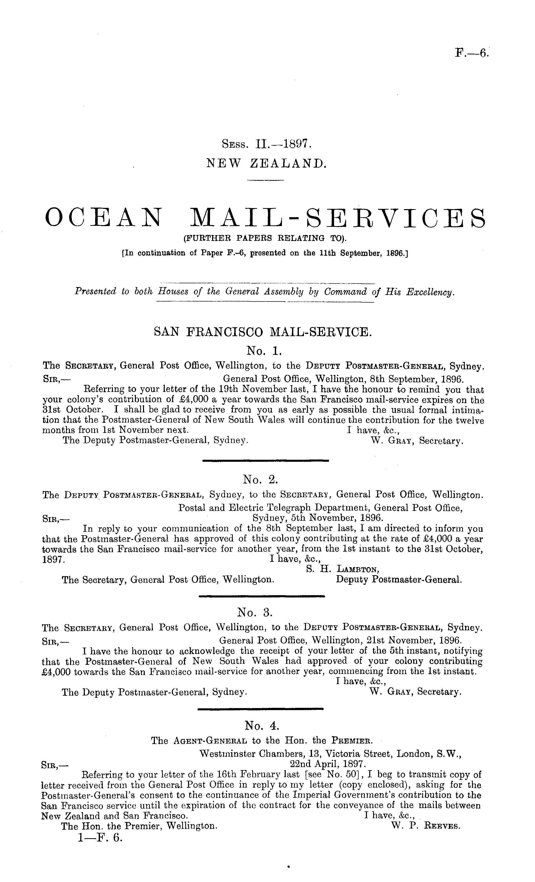 No. 4. The Agent-General to the Hon. the Premier. Westminster Chambers, 13, Victoria Street, London, S.W., Sir — 22nd April, 1897. Referring to your letter of the 16th February last [see No. 50], I beg to transmit copy of letter received from the General Post Office in reply to my letter (copy enclosed), asking for the Postmaster-General's consent to the continuance of the Imperial Government's contribution to the San Francisco service until the expiration of the contract for the conveyance of the mails between New Zealand and San Francisco. I have, &c, The Hon. the Premier, Wellington. W. P. Reeves. I—F. 6.