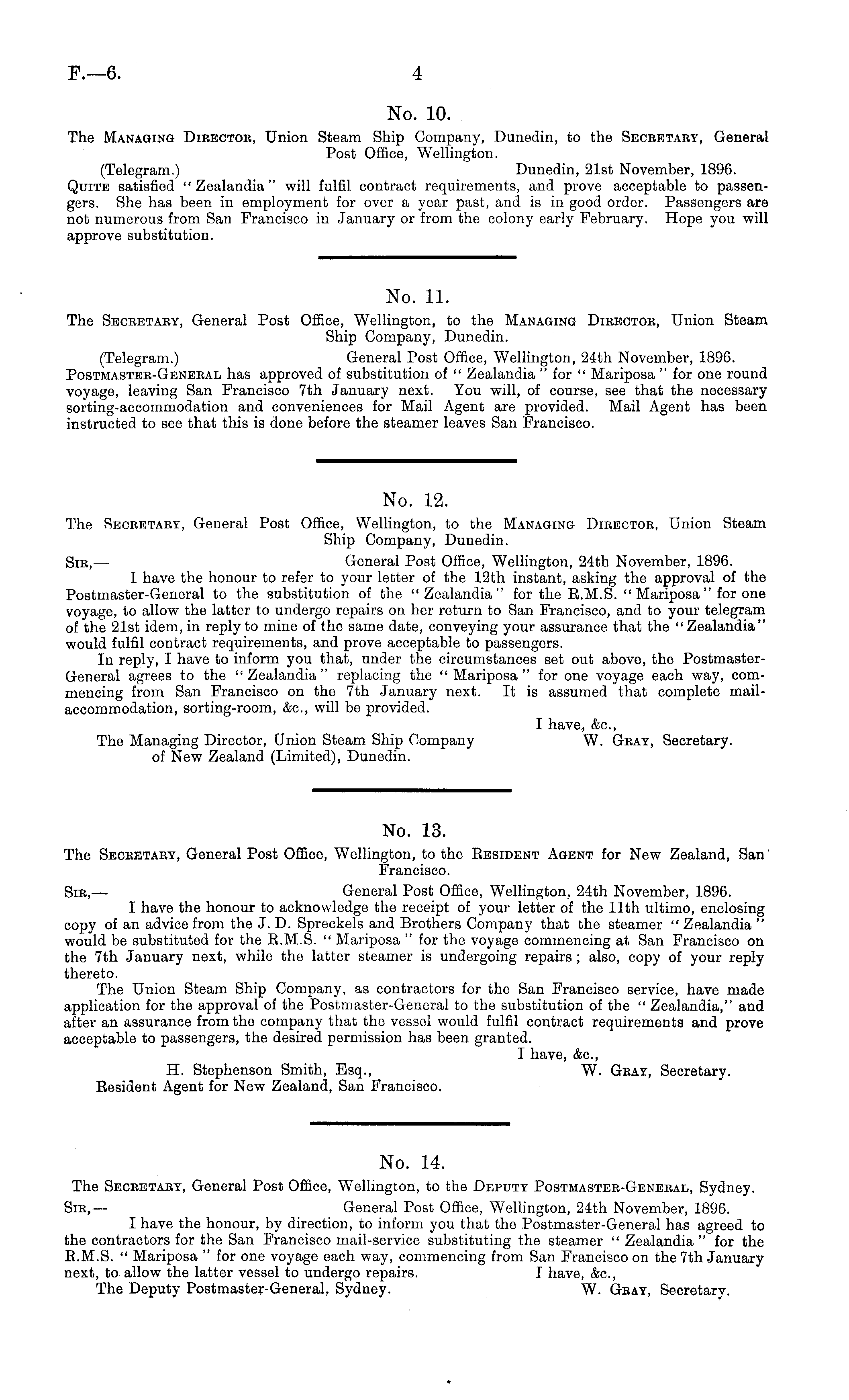 No. 13. The Secretary, General Post Office, Wellington, to the Resident Agent for New Zealand, San Francisco. Sir, — General Post Office, Wellington, 24th November, 1896. I have the honour to acknowledge the receipt of your letter of the 11th ultimo, enclosing copy of an advice from the J. D. Spreckels and Brothers Company that the steamer " Zealandia " would be substituted for the R.M.S. " Mariposa " for the voyage commencing at San Francisco on the 7th January next, while the latter steamer is undergoing repairs; also, copy of your reply thereto. The Union Steam Ship Company, as contractors for the San Francisco service, have made application for the approval of the Postmaster-General to the substitution of the " Zealandia," and after an assurance from the company that the vessel would fulfil contract requirements and prove acceptable to passengers, the desired permission has been granted. I have, &c, H. Stephenson Smith, Esq., W. Gray, Secretary. Resident Agent for New Zealand, San Francisco.