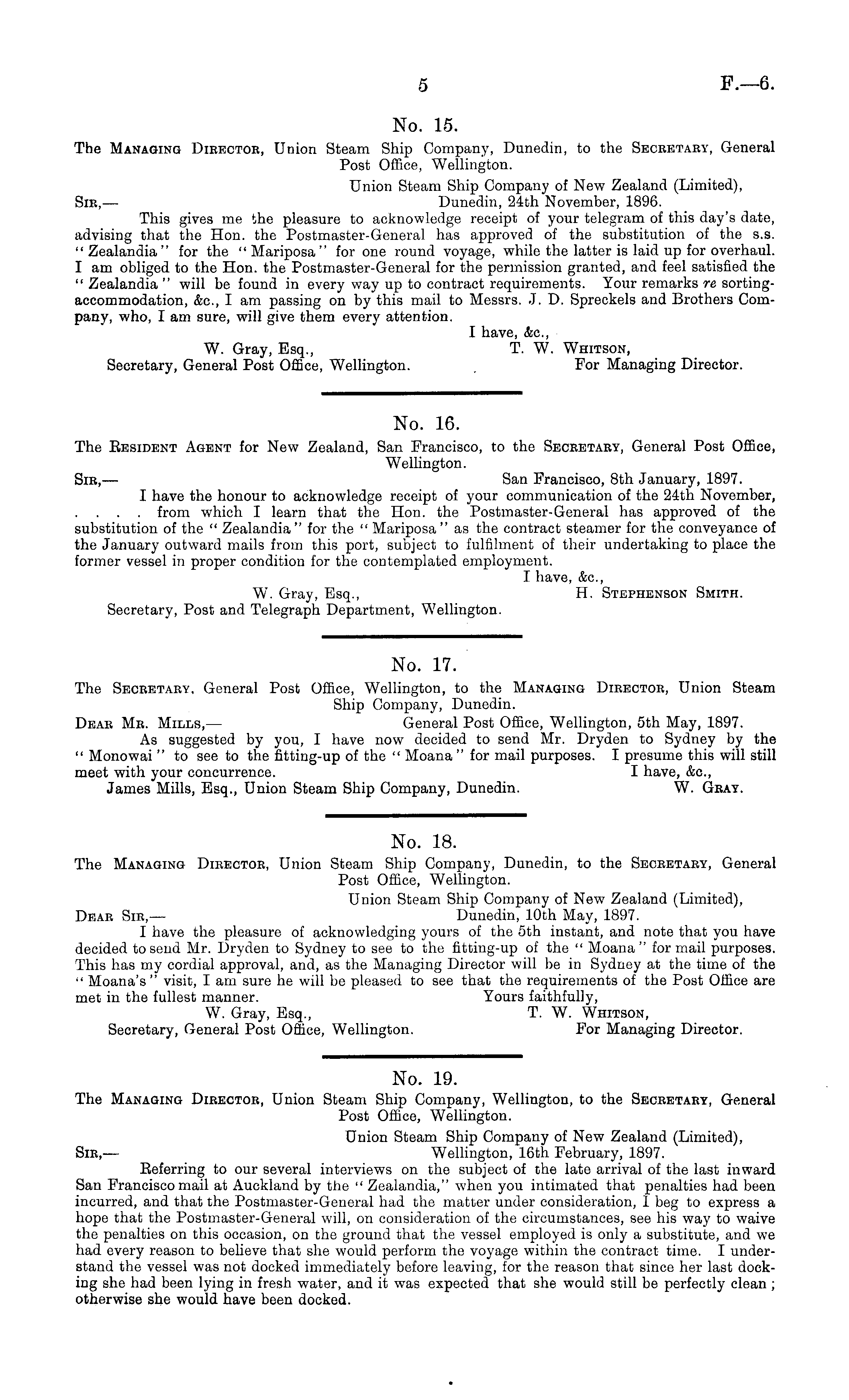 No. 19. The Managing Director, Union Steam Ship Company, Wellington, to the Secretary, General Post Office, Wellington. Union Steam Ship Company of New Zealand (Limited), Sir,— Wellington, 16th February, 1897. Referring to our several interviews on the subject of the late arrival of the last inward San Francisco mail at Auckland by the " Zealandia," when you intimated that penalties had been incurred, and that the Postmaster-General had the matter under consideration, I beg to express a hope that the Postmaster-General will, on consideration of the circumstances, see his way to waive the penalties on this occasion, on the ground that the vessel employed is only a substitute, and we had every reason to believe that she would perform the voyage within the contract time. I understand the vessel was not docked immediately before leaving, for the reason that since her last docking she had been lying in fresh water, and it was expected that she would still be perfectly clean ; otherwise she would have been docked.