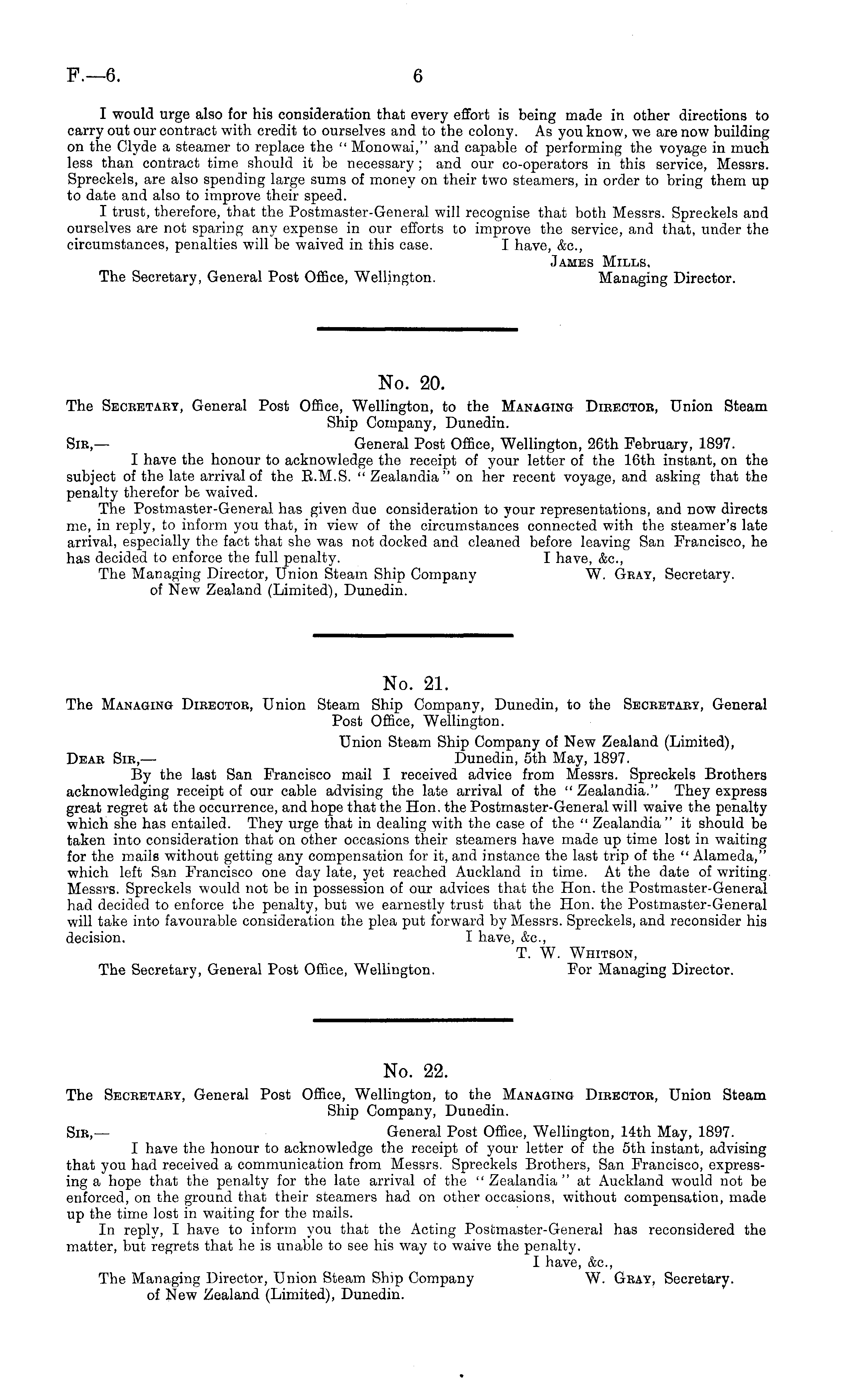 No. 21. The Managing Director, Union Steam Ship Company, Dunedin, to the Secretary, General Post Office, Wellington. Union Steam Ship Company of New Zealand (Limited), Dear Sir,— Dunedin, sth May, 1897. By the last San Francisco mail I received advice from Messrs. Spreckels Brothers acknowledging receipt of our cable advising the late arrival of the "Zealandia." They express great regret at the occurrence, and hope that the Hon. the Postmaster-General will waive the penalty which she has entailed. They urge that in dealing with the case of the " Zealandia " it should be taken into consideration that on other occasions their steamers have made up time lost in waiting for the mails without getting any compensation for it, and instance the last trip of the " Alameda," which left San Francisco one day late, yet reached Auckland in time. At the date of writing Messrs. Spreckels would not be in possession of our advices that the Hon. the Postmaster-General had decided to enforce the penalty, but we earnestly trust that the Hon. the Postmaster-General will take into favourable consideration the plea put forward by Messrs. Spreckels, and reconsider his decision. I have, &c, T. W. Whitson, The Secretary, General Post Office, Wellington. For Managing Director.