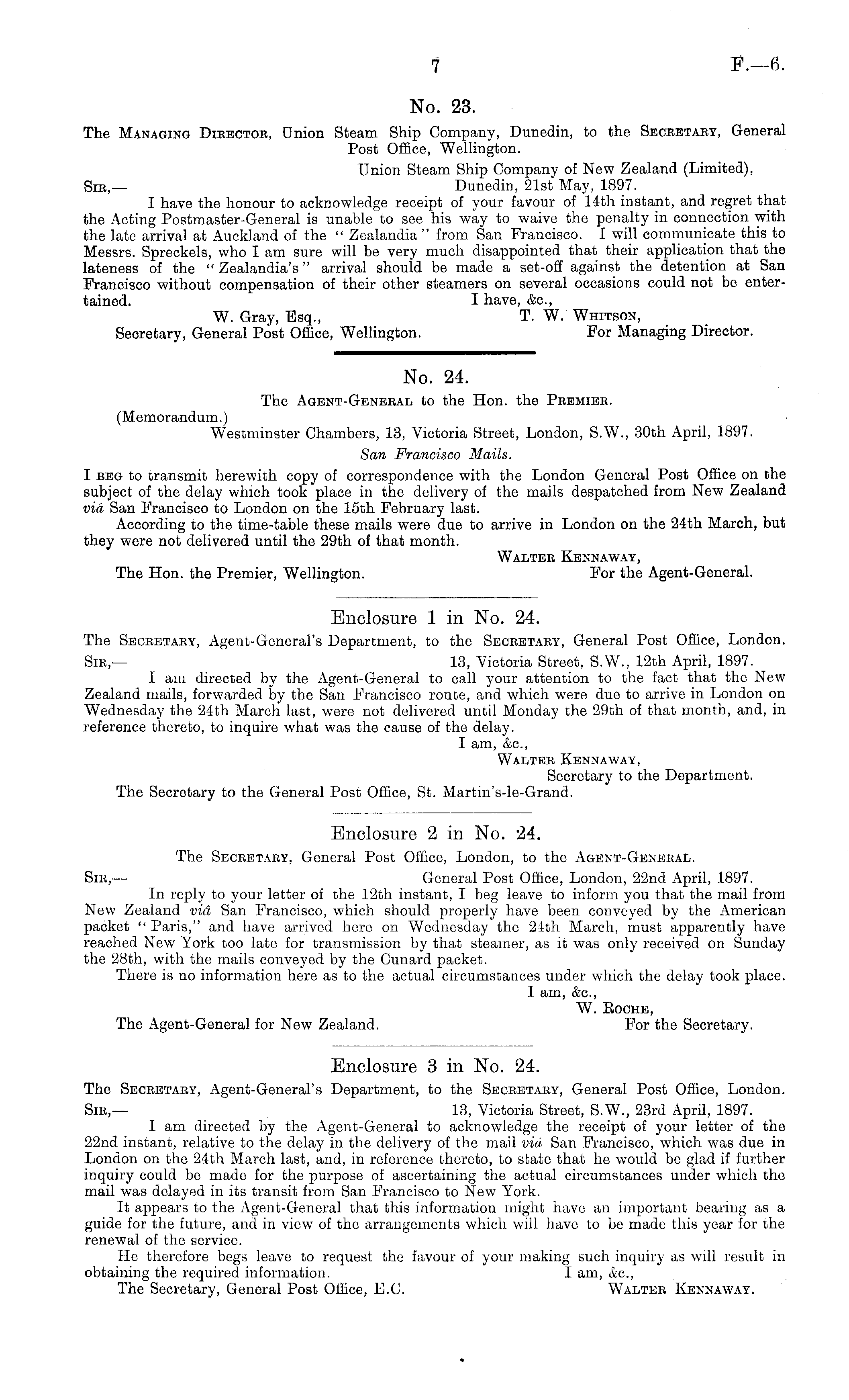 No. 24. The Agent-General to the Hon. the Premier. (Memorandum.) Westminster Chambers, 13, Victoria Street, London, S.W., 30th April, 1897. San Francisco Mails. I beg to transmit herewith copy of correspondence with the London General Post Office on the subject of the delay which took place in the delivery of the mails despatched from New Zealand vid San Francisco to London on the 15th February last. According to the time-table these mails were due to arrive in London on the 24th March, but they were not delivered until the 29th of that month. Walter Kennaway, The Hon. the Premier, Wellington. For the Agent-General.
