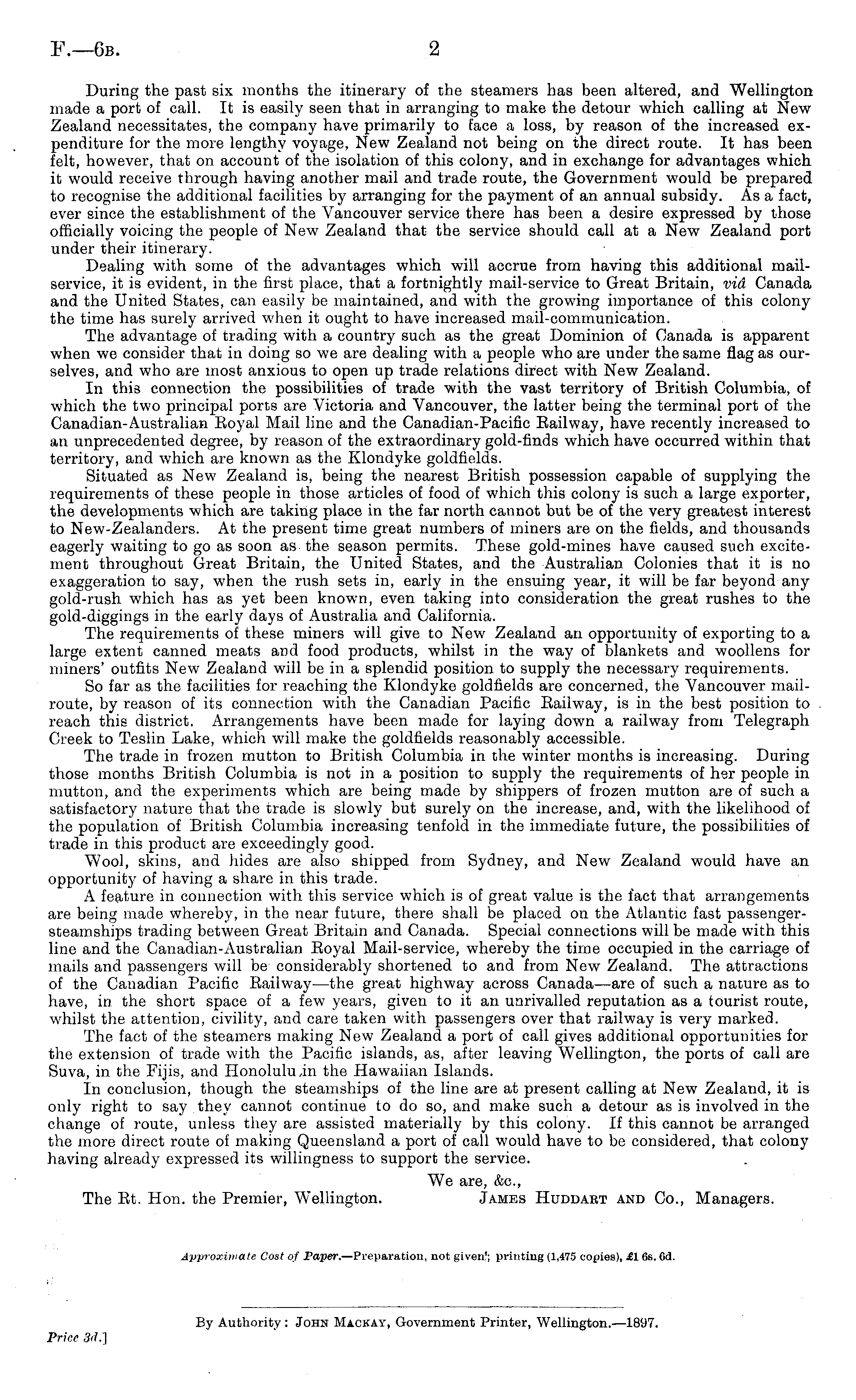 During the past six months the itinerary of the steamers has been altered, and Wellington made a port of call. It is easily seen that in arranging to make the detour which calling at New Zealand necessitates, the company have primarily to face a loss, by reason of the increased expenditure for the more lengthy voyage, New Zealand not being on the direct route. It has been felt, however, that on account of the isolation of this colony, and in exchange for advantages which it would receive through having another mail and trade route, the Government would be prepared to recognise the additional facilities by arranging for the payment of an annual subsidy. As a fact, ever since the establishment of the Vancouver service there has been a desire expressed by those officially voicing the people of New Zealand that the service should call at a New Zealand port under their itinerary. Dealing with some of the advantages which will accrue from having this additional mailservice, it is evident, in the first place, that a fortnightly mail-service to Great Britain, via Canada and the United States, can easily be maintained, and with the growing importance of this colony the time has surely arrived when it ought to have increased mail-communication. The advantage of trading with a country such as the great Dominion of Canada is apparent when we consider that in doing so we are dealing with a people who are under the same flag as ourselves, and who are most anxious to open up trade relations direct with New Zealand. In this connection the possibilities of trade with the vast territory of British Columbia, of which the two principal ports are Victoria and Vancouver, the latter being the terminal port of the Canadian-Australian Eoyal Mail line and the Canadian-Pacific Eailway, have recently increased to an unprecedented degree, by reason of the extraordinary gold-finds which have occurred within that territory, and which are known as the Klondyke goldfields. Situated as New Zealand is, being the nearest British possession capable of supplying the requirements of these people in those articles of food of which this colony is such a large exporter, the developments which are taking place in the far north cannot but be of the very greatest interest to New-Zealanders. At the present time great numbers of miners are on the fields, and thousands eagerly waiting to go as soon as the season permits. These gold-mines have caused such excitement throughout Great Britain, the United States, and the Australian Colonies that it is no exaggeration to say, when the rush sets in, early in the ensuing year, it will be far beyond any gold-rush which has as yet been known, even taking into consideration the great rushes to the gold-diggings in the early days of Australia and California. The requirements of these miners will give to New Zealand an opportunity of exporting to a large extent canned meats and food products, whilst in the way of blankets and woollens for miners' outfits New Zealand will be in a splendid position to supply the necessary requirements. So far as the facilities for reaching the Klondyke goldfields are concerned, the Vancouver mailroute, by reason of its connection with the Canadian Pacific Eailway, is in the best position to reach this district. Arrangements have been made for laying down a railway from Telegraph Creek to Teslin Lake, which will make the goldfields reasonably accessible. The trade in frozen mutton to British Columbia in the winter months is increasing. During those months British Columbia is not in a position to supply the requirements of her people in mutton, and the experiments which are being made by shippers of frozen mutton are of such a satisfactory nature that the trade is slowly but surely on the increase, and, with the likelihood of the population of British Columbia increasing tenfold in the immediate future, the possibilities of trade in this product are exceedingly good. Wool, skins, and hides are also shipped from Sydney, and New Zealand would have an opportunity of having a share in this trade. A feature in connection with this service which is of great value is the fact that arrangements are being made whereby, in the near future, there shall be placed on the Atlantic fast passengersteamships trading between Great Britain and Canada. Special connections will be made with this line and the Canadian-Australian Eoyal Mail-service, whereby the time occupied in the carriage of mails and passengers will be considerably shortened to and from New Zealand. The attractions of the Canadian Pacific Eailway—the great highway across Canada—are of such a nature as to have, in the short space of a few years, given to it an unrivalled reputation as a tourist route, whilst the attention, civility, and care taken with passengers over that railway is very marked. The fact of the steamers making New Zealand a port of call gives additional opportunities for the extension of trade with the Pacific islands, as, after leaving Wellington, the ports of call are Suva, in the Fijis, and Honolulu in the Hawaiian Islands. In conclusion, though the steamships of the line are at present calling at New Zealand, it is only right to say they cannot continue to do so, and make such a detour as is involved in the change of route, unless they are assisted materially by this colony. If this cannot be arranged the more direct route of making Queensland a port of call would have to be considered, that colony having already expressed its willingness to support the service. We are, &c, The Et. Hon. the Premier, Wellington. James Huddart and Co., Managers. Approximate Cost of Paper. —Preparation, not given'; printing (1,475 copies), £1 6s. Gd.