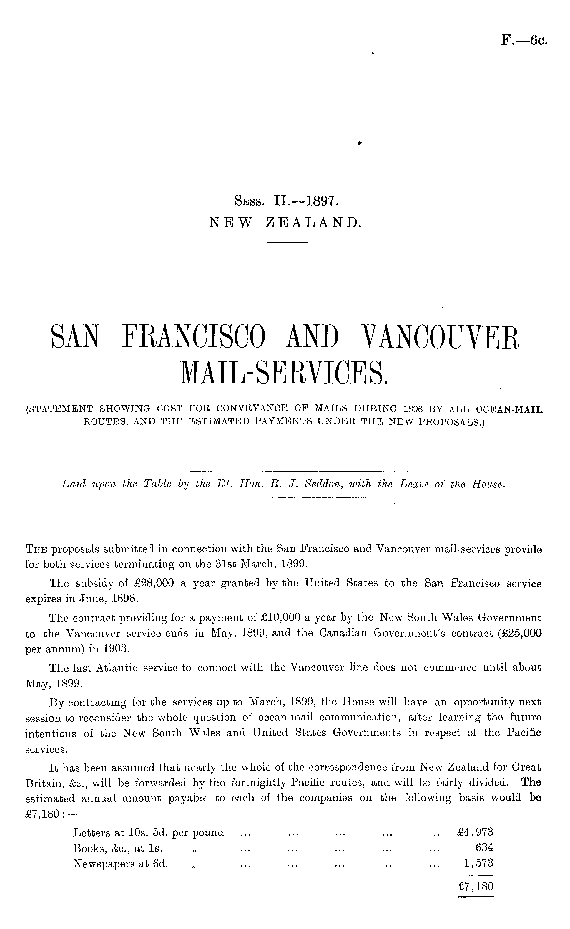 The proposals submitted in connection with the San Francisco and Vancouver mail-services provide for both services terminating on the 31st March, 1899. The subsidy of £28,000 a year granted by the United States to the San Francisco service expires in June, 1898. The contract providing for a payment of £10,000 a year by the New South Wales Government to the Vancouver service ends in May, 1899, and the Canadian Government's contract (£25,000 per annum) in 1903. The fast Atlantic service to connect with the Vancouver line does not commence until about May, 1899. By contracting for the services up to March, 1899, the House will have an opportunity next session to reconsider the whole question of ocean-mail communication, after learning the future intentions of the New South Wales and United States Governments in respect of the Pacific services. It has been assumed that nearly the whole of the correspondence from New Zealand for Great Britain, &c, will be forwarded by the fortnightly Pacific routes, and will be fairly divided. The estimated annual amount payable to each of the companies on the following basis would be £7,180 :— Letters at 10s. sd. per pound ... ... ... ... ... £4,973 Books, &c, at Is. „ ... ... ... ... ... 634 Newspapers at 6d. „ ... ... ... ... ... 1,573 £7,180