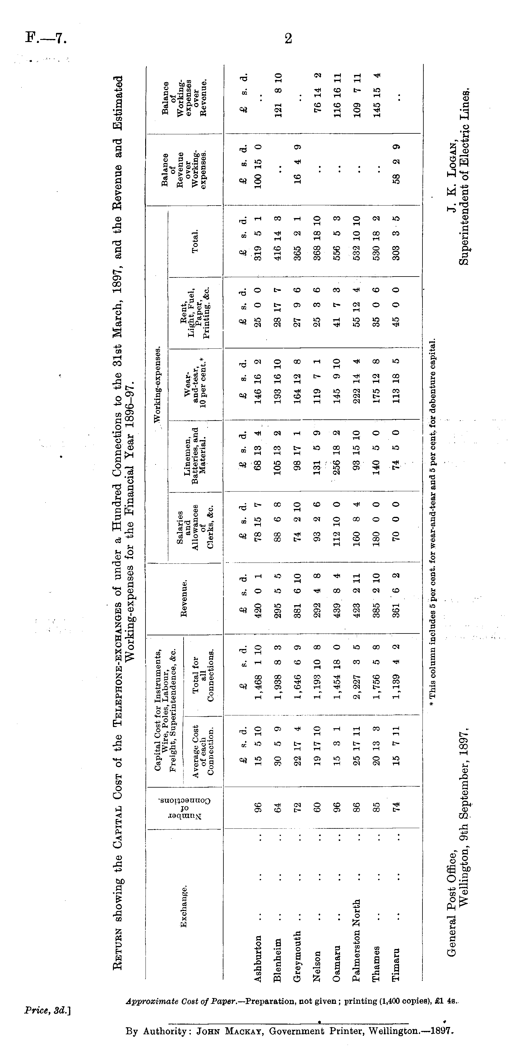 S 2 O Capital Cost 1 Wire, Pol Freight, Supe for Instruments, les, Labour, irintendence, &c. orking-expenses Balance of Revenue over Workingexpenses. Balance of Workingexpenses over Revenue. Exchange. Average Cost of each Connection. Total for all Connections. Salaries and Allowances of Clerks, &e. Linemen, Batteries, and Material. Wear-and-tear, 10 per cent.* Kent, Light, Fuel, Paper, Printing. &c. Total. £ s. a. ' £ s. a. £ s. d. £ s. a. £ 9. a. 68 13 4 £ s. a. £ s. a. £ s. a. 319 5 1 £ S. d. £ s. a. Ashburton 96 15 5 10 1,468 1 10 420 0 1 78 15 7 146 16 2 25 0 0 100 15 0 Blenheim 64 30 5 9 1,938 8 3 295 5 5 88 6 8 105 13 2 193 16 10 28 17 7 416 14 3 121 8 10 Greymouth .. 72 22 17 4 1,646 6 9 381 6 10 74 2 10 98 17 1 164 12 8 27 9 6 365 2 1 16 4 9 Nelson 60 19 17 10 1,193 10 8 292 4 8 93 2 6 131 5 9 119 7 1 25 3 6 368 18 10 76 14 2 Oamaru 96 15 3 1 1,454 18 0 439 8 4 112 10 0 256 18 2 145 9 10 41 7 3 556 5 3 116 16 11 Palmerston North 86 25 17 11 20 13 3 2,227 3 5 1,756 5 8 423 2 11 160 8 4 93 15 10 222 14 4 55 12 4 532 10 10 109 7 11 Thames 85 385 2 10 180 0 0 140 5 0 175 12 8 35 0 6 530 18 2 145 15 4 Timaru 74 15 7 11 1,139 4 2 361 6 2 70 0 0 74 5 0 113 18 5 45 0 0 303 3 5 58 2 9 * This column includes 5 per cent, for wear-and-tear and 5 per cent, for debenture capital.