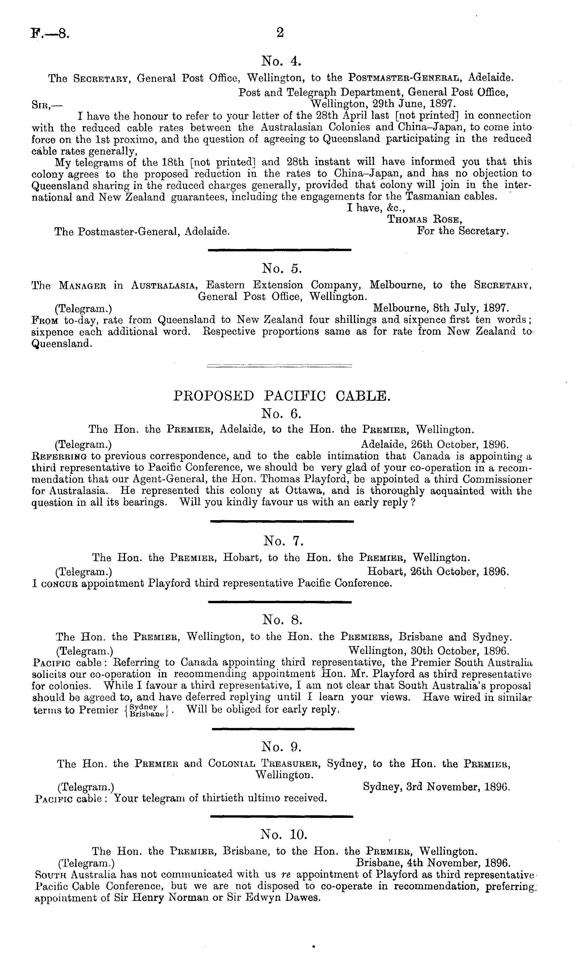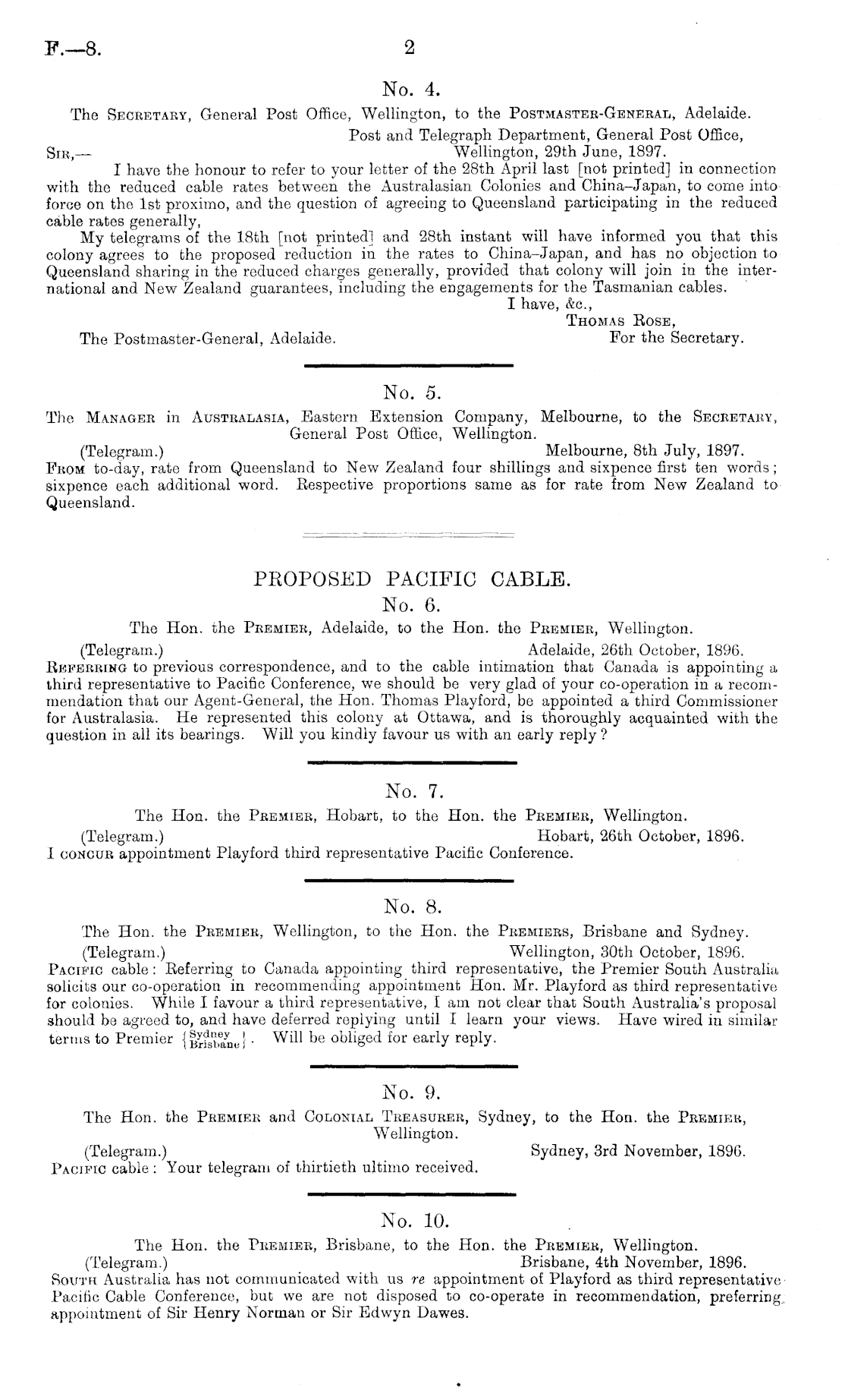 No. 9. The Hon. the Premier and Colonial Treasurer, Sydney, to the Hon. the Premier, Wellington. (Telegram.) Sydney, 3rd November, 1896. Pacific cable : Your telegram of thirtieth ultimo received.