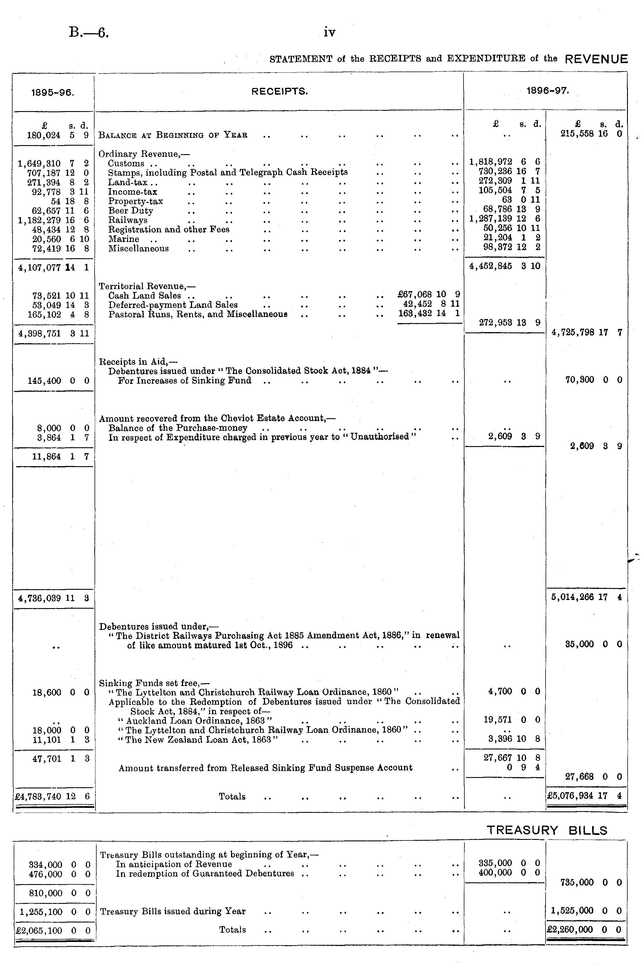 1895-96. RECEIPTS. 189 i-97. £ s. d. 180,024 5 9 £ s. d. £ s. d. 215,558 16 0 Balance at Beginning op Year 1,649,310 7 2 707,187 12 0 271,394 8 2 92,778 3 11 54 18 8 62,657 11 6 1,182,279 16 6 48,434 12 8 20,560 6 10 72,419 16 8 Ordinary Bevenue, — Customs Stamps, including Postal and Telegraph Cash Beceipts Land-tax Income-tax Property-tax Beer Duty Bailways Begistration and other Pees Marine Miscellaneous 1,818,972 6 6 730,236 16 7 272,309 1 11 105,504 7 5 63 0 11 68,786 18 9 1,287,139 12 6 50,256 10 11 21,204 1 2 98,372 12 2 4,107,077 14 1 Territorial Bevenue, — Cash Land Sales .. .. .. .. .. .. £67,068 10 9 Deferred-payment Land Sales .. .. .. .. 42,452 8 11 Pastoral Buns, Bents, and Miscellaneous .. .. .. 163,432 14 1 4,452,845 3 10 73,521 10 11 53,049 14 3 165,102 4 8 272,953 13 9 4,398,751 3 11 Beceipts in Aid, —■ Debentures issued under " The Consolidated Stock Act, 1884 " — For Increases of Sinking Fund 4,725,798 17 1 145,400 0 0 70,800 0 0 11,864 1 7 8,000 0 0 3,864 1 7 Amount recovered from the Cheviot Estate Account, — Balance of the Purchase-money In respect of Expenditure charged in previous year to " Unauthorised " 2,609 3 9 2,609 3 9 4,736,039 11 3 Debentures issued under, — " The District Bailways Purchasing Act 1885 Amendment Act, 1886," in renewal of like amount matured 1st Oct., 1896 .. 5,014,266 17 4 35,000 0 0 18,600 0 0 Sinking Funds set free, — " The Lyttelton and Christchurch Bailway Loan Ordinance, 1860 " Applicable to the Bedemption of Debentures issued under " The Consolidated Stock Act, 1884," in respect of— " Auckland Loan Ordinance, 1863 " " The Lyttelton and Christchurch Bailway Loan Ordinance, 1860 " .. " The New Zealand Loan Act, 1863 " 4,700 0 0 19,571 0 0 18,000 0 0 11,101 1 3 3,396 10 8 47,701 1 3 Amount transferred from Beleased Sinking Fund Suspense Account 27,667 10 8 0 9 4 27,668 0 0 Totals £4,783,740 12 6 £5,076,934 17 4 TREASURY BILLS 334,000 0 0 476,000 0 0 Treasury Bills outstanding at beginning of Year, — In anticipation of Bevenue In redemption of Guaranteed Debentures .. 335,000 0 0 400,000 0 0 735,000 0 0 810,000 0 0 Treasury Bills issued during Year 1,525,000 0 0 1,255,100 0 0 Totals £2,260,000 0 0 £2,065,100 0 0