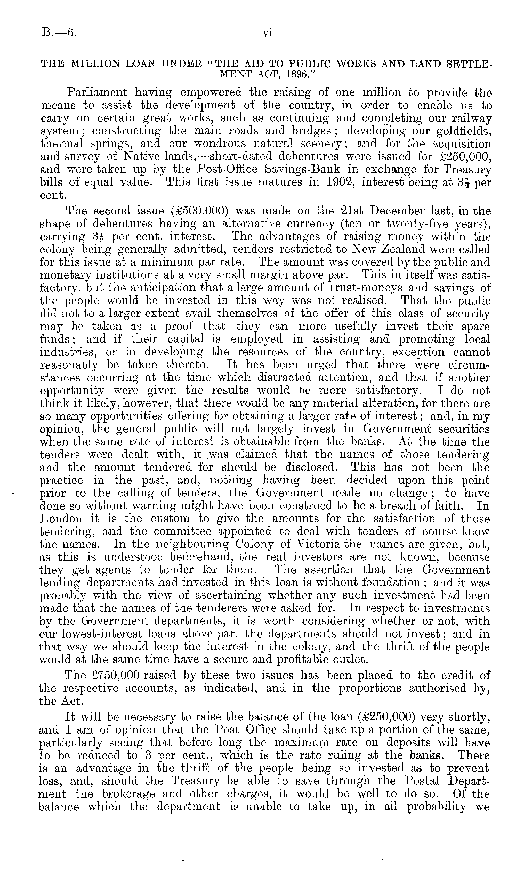 THE MILLION LOAN UNDEE "THE AID TO PUBLIC WOEKS AND LAND SETTLEMENT ACT, 1896." Parliament having empowered the raising of one million to provide the means to assist the development of the country, in order to enable us to carry on certain great works, such as continuing and completing our railway system; constructing the main roads and bridges ; developing our goldfields, thermal springs, and our wondrous natural scenery; and for the acquisition and survey of Native lands,—short-dated debentures were issued for and were taken up by the Post-Office Savings-Bank in exchange for Treasury bills of equal value. This first issue matures in 1902, interest being at 3 \ per cent. The second issue (,£500,000) was made on the 21st December last, in the shape of debentures having an alternative currency (ten or twenty-five years), carrying 3 J per cent, interest. The advantages of raising money within the colony being generally admitted, tenders restricted to New Zealand were called for this issue at a minimum par rate. The amount was covered by the public and monetary institutions at a very small margin above par. This in itself was satisfactory, but the anticipation that a large amount of trust-moneys and savings of the people would be invested in this way was not realised. That the public did not to a larger extent avail themselves of the offer of this class of security may be taken as a proof that they can more usefully invest their spare funds; and if their capital is employed in assisting and promoting local industries, or in developing the resources of the country, exception cannot reasonably be taken thereto. It has been urged that there were circumstances occurring at the time which distracted attention, and that if another opportunity were given the results would be more satisfactory. I do not think it likely, however, that there would be any material alteration, for there are so many opportunities offering for obtaining a larger rate of interest; and, in my opinion, the general public will not largely invest in Government securities when the same rate of interest is obtainable from the banks. At the time the tenders were dealt with, it was claimed that the names of those tendering and the amount tendered for should be disclosed. This has not been the practice in the past, and, nothing having been decided upon this point prior to the calling of tenders, the Government made no change ; to have done so without warning might have been construed to be a breach of faith. In London it is the custom to give the amounts for the satisfaction of those tendering, and the committee appointed to deal with tenders of course know the names. In the neighbouring Colony of Victoria the names are given, but, as this is understood beforehand, the real investors are not known, because they get agents to tender for them. The assertion that the Government lending departments had invested in this loan is without foundation ; and it was probably with the view of ascertaining whether any such investment had been made that the names of the tenderers were asked for. In respect to investments by the Government departments, it is worth considering whether or not, with our lowest-interest loans above par, the departments should not invest; and in that way we should keep the interest in the colony, and the thrift of the people would at the same time have a secure and profitable outlet. The £750,000 raised by these two issues has been placed to the credit of the respective accounts, as indicated, and in the proportions authorised by, the Act. It will be necessary to raise the balance of the loan (£250,000) very shortly, and I am of opinion that the Post Office should take up a portion of the same, particularly seeing that before long the maximum rate on deposits will have to be reduced to 3 per cent., which is the rate ruling at the banks. There is an advantage in the thrift of the people being so invested as to prevent loss, and, should the Treasury be able to save through the Postal Department the brokerage and other charges, it would be well to do so. Of the balance which the department is unable to take up, in all probability we