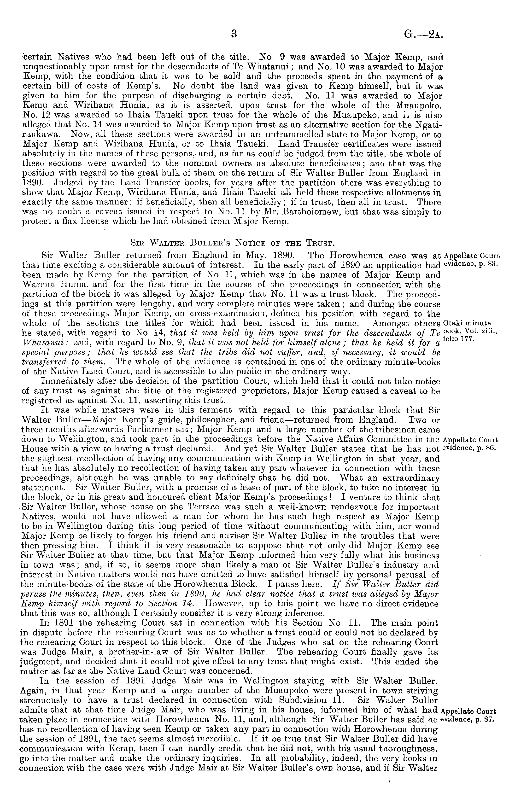 certain Natives who had been left out of the title. No. 9 was awarded to Major Kemp, and unquestionably upon trust for the descendants of Te Whatanui; and No. 10 was awarded to Major Kemp, with the condition that it was to be sold and the proceeds spent in the payment of a certain bill of costs of Kemp's. No doubt the land was given to Kemp himself, but it was given to him for the purpose of discharging a certain debt. No. 11 was awarded to Major Kemp and Wirihana Hunia, as it is asserted, upon trust for the whole of the Muaupoko. No. 12 was awarded to Ihaia Taueki upon trust for the whole of the Muaupoko, and it is also alleged that No. 14 was awarded to Major Kemp upon trust as an alternative section for the Ngatiraukawa. Now, all these sections were awarded in an untrammelled state to Major Kemp, or to Major Kemp and Wirihana Hunia, or to Ihaia Taueki. Land Transfer certificates were issued absolutely in the names of these persons,-and, as far as could be judged from the title, the whole of these sections were awarded to the nominal owners as absolute beneficiaries; and that was the position with regard to the great bulk of them on the return of Sir Walter Buller from England in 1890. Judged by the Land Transfer books, for years after the partition there was everything to show that Major Kemp, Wirihana Hunia, and Ihaia Taueki all held these respective allotments in exactly the same manner: if beneficially, then all beneficially; if in trust, then all in trust. There was no doubt a caveat issued in respect to No. 11 by Mr. Bartholomew, but that was simply to protect a flax license which he had obtained from Major Kemp. Sir Walter Buller's Notice of the Trust. Sir Walter Buller returned from England in May, 1890. The Horowhenua case was at t that time exciting a considerable amount of interest. In the early part of 1890 an application had l been made by Kemp for the partition of No. 11, which was in the names of Major Kemp and W arena Hunia, and for the first time in the course of the proceedings in connection with the partition of the block it was alleged by Major Kemp that No. 11 was a trust block. The proceedings at this partition were lengthy, and very complete minutes were taken; and during the course of these proceedings Major Kemp, on cross-examination, defined his position with regard to the whole of the sections the titles for which had been issued in his name. Amongst others C he stated, with regard to No. 14, that it was held by him upon trust for the descendants of Te J Whatanui : and, with regard to No. 9, that it was not held for himself alone ; that he held it for a special purpose; that he would see that the tribe did not suffer, and, if necessary, it ivould be transferred to them. The whole of the evidence is contained in one of the ordinary minute-books of the Native Land Court, and is accessible to the public in the ordinary way. Immediately after the decision of the partition Court, which held that it could not take notice of any trust as against the title of the registered proprietors, Major Kemp caused a caveat to be registered as against No. 11, asserting this trust. It was while matters were in this ferment with regard to this particular block that Sir Walter Buller —Major Kemp's guide, philosopher, and friend —returned from England. Two or three months afterwards Parliament sat; Major Kemp and a large number of the tribesmen came down to Wellington, and took part in the proceedings before the Native Affairs Committee in the i House with a view to having a trust declared. And yet Sir Walter Buller states that he has not e the slightest recollection of having any communication with Kemp in Wellington in that year, and that he has absolutely no recollection of having taken any part whatever in connection with these proceedings, although he was unable to say definitely that he did not. What an extraordinary statement. Sir Walter Buller, with a promise of a lease of part of the block, to take no interest in the block, or in his great and honoured client Major Kemp's proceedings ! I venture to think that Sir Walter Buller, whose house on the Terrace was such a well-known rendezvous for important Natives, would not have allowed a man for whom he has such high respect as Major Kemp to be in Wellington during this long period of time without communicating with him, nor would Major Kemp be likely to forget his friend and adviser Sir Walter Buller in the troubles that were then pressing him. I think it is very reasonable to suppose that not only did Major Kemp see Sir Walter Buller at that time, but that Major Kemp informed him very fully what his business in town was; and, if so, it seems more than likely a man of Sir Walter Buller's industry and interest in Native matters would not have omitted to have satisfied himself by personal perusal of the minute-books of the state of the Horowhenua Block. I pause here. If Sir Walter Buller did peruse the minutes, then, even then in 1890, he had clear notice that a trust was alleged by Major Kemp himself ivith regard to Section 14. However, up to this point we have no direct evidence that this was so, although I certainly consider it a very strong inference. In 1891 the rehearing Court sat in connection with his Section No. 11. The main point in dispute before the rehearing Court was as to whether a trust could or could not be declared by the rehearing Court in respect to this block. One of the Judges who sat on the rehearing Court was Judge Mair, a brother-in-law of Sir Walter Buller. The rehearing Court finally gave its judgment, and decided that it could not give effect to any trust that might exist. This ended the matter as far as the Native Land Court was concerned. In the session of 1891 Judge Mair was in Wellington staying with Sir Walter Buller. Again, in that year Kemp and a large number of the Muaupoko were present in town striving strenuously to have a trust declared in connection with Subdivision 11. Sir Walter Bul