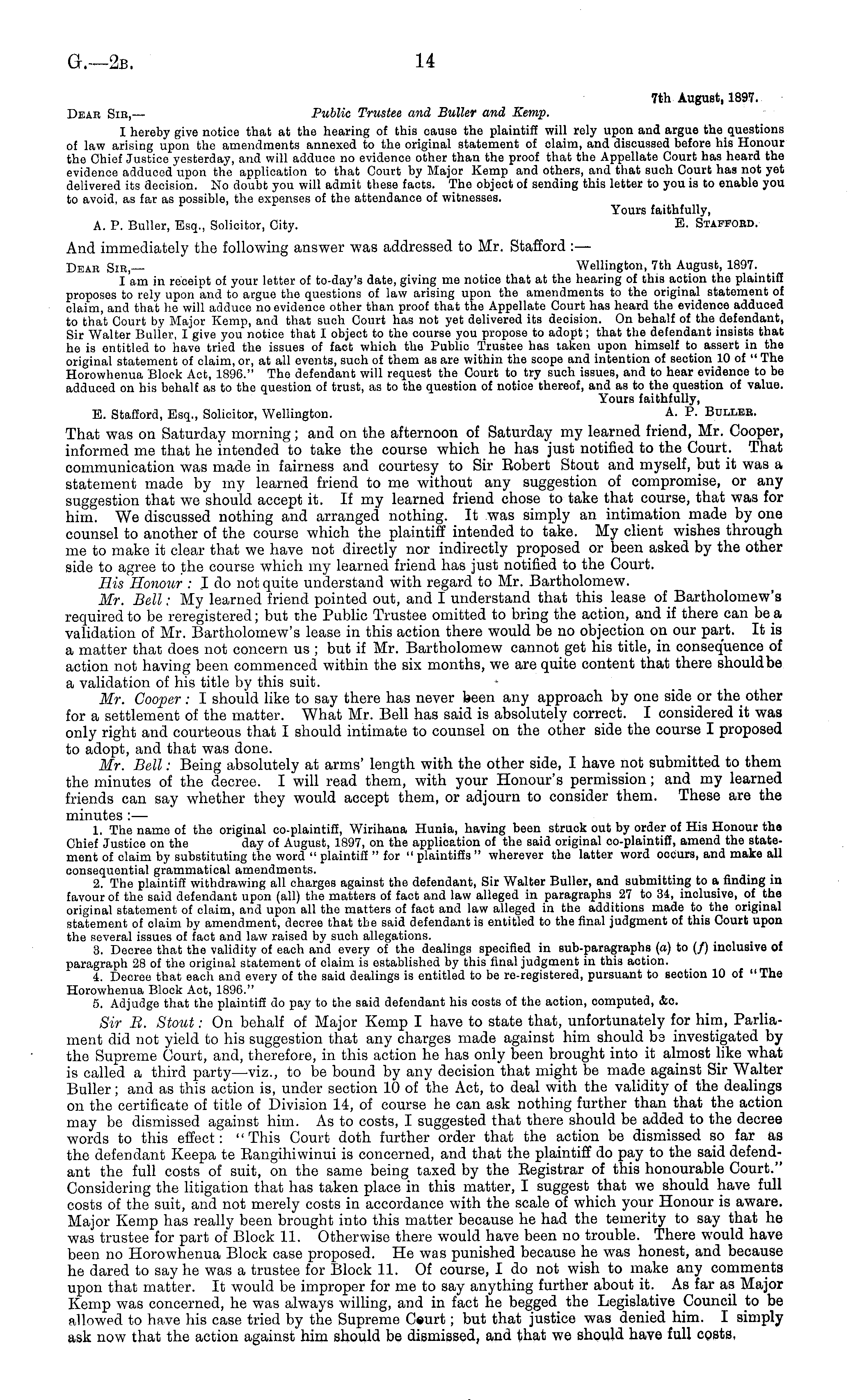 7th August, 1897. Dear Sib, — Public Trustee and Buller and Kemp. I hereby give notice that at the hearing of this cause the plaintiff will rely upon and argue the questions of law arising upon the amendments annexed to the original statement of claim, and discussed before his Honour the Chief Justice yesterday, and will adduce no evidence other than the proof that the Appellate Court has heard the evidence adduced upon the application to that Court by Major Kemp and others, and that such Court has not yet delivered its decision. No doubt you will admit these facts. The object of sending this letter to you is to enable you to avoid, as far as possible, the expenses of the attendance of witnesses. Yours faithfully, A. P. Buller, Esq., Solicitor, City. E. Stafford. And immediately the following answer was addressed to Mr. Stafford : — Dear Sib,— Wellington, 7th August, 1897. I'am in receipt of your letter of to-day's date, giving me notice that at the hearing of this action the plaintiff proposes to rely upon and to argue the questions of law arising upon the amendments to the original statement of claim, and that he will adduce no evidence other than proof that the Appellate Court has heard the evidence adduced to that Court by Major Kemp, and that such Court has not yet delivered its decision. On behalf of the defendant, Sir Walter Buller, I give you notice that I object to the course you propose to adopt; that the defendant insists that he is entitled to have tried the issues of fact which the Public Trustee has taken upon himself to assert in the original statement of claim, or, at all events, such of them as are within the scope and intention of section 10 of " The Horowhenua Block Act, 1896." The defendant will request the Court to try such issues, and to hear evidence to be adduced on his behalf as to the question of trust, as to the question of notice thereof, and as to the question of value. Yours faithfully, E. Stafford, Esq., Solicitor, Wellington. A. P. Buixeb. That was on Saturday morning; and on the afternoon of Saturday my learned friend, Mr. Cooper, informed me that he intended to take the course which he has just notified to the Court. That communication was made in fairness and courtesy to Sir Robert Stout and myself, but it was a statement made by my learned friend to me without any suggestion of compromise, or any suggestion that we should accept it. If my learned friend chose to take that course, that was for him. We discussed nothing and arranged nothing. It was simply an intimation made by one counsel to another of the course which the plaintiff intended to take. My client wishes through me to make it clear that we have not directly nor indirectly proposed or been asked by the other side to agree to the course which my learned friend has just notified to the Court. His Honour : I do not quite understand with regard to Mr. Bartholomew. Mr. Bell: My learned friend pointed out, and I understand that this lease of Bartholomew's required to be reregistered; but the Public Trustee omitted to bring the action, and if there can be a, validation of Mr. Bartholomew's lease in this action there would be no objection on our part. It is a matter that does not concern us ; but if Mr. Bartholomew cannot get his title, in consequence of action not having been commenced within the six months, we are quite content that there should be a validation of his title by this suit. Mr. Cooper: I should like to say there has never been any approach by one side or the other for a settlement of the matter. What Mr. Bell has said is absolutely correct. I considered it was only right and courteous that I should intimate to counsel on the other side the course I proposed to adopt, and that was done. Mr. Bell: Being absolutely at arms' length with the other side, I have not submitted to them the minutes of the decree. I will read them, with your Honour's permission; and my learned friends can say whether they would accept them, or adjourn to consider them. These are the minutes :— 1. The name of the original co-plaintiff, Wirihana Hunia, having been struck out by order of His Honour the Chief Justice on the day of August, 1897, on the application of the said original co-plaintiff, amend the statement of claim by substituting the word " plaintiff " for " plaintiffs " wherever the latter word occurs, and make all consequential grammatical amendments. 2. The plaintiff withdrawing all charges against the defendant, Sir Walter Buller, and submitting to a finding in favour of the said defendant upon (all) the matters of fact and law alleged in paragraphs 27 to 34, inclusive, of the original statement of claim, and upon all the matters of fact and law alleged in tbe additions made to the original statement of claim by amendment, decree that the said defendant is entitled to the final judgment of this Court upon the several issues of fact and law raised by such allegations. 3. Decree that the validity of each and every of the dealings specified in sub-paragraphs (a) to (/) inclusive of paragraph 28 of the original statement of claim is established by this final judgment in this action. 4. Decree that each and every of the said dealings is entitled to be re-registered, pursuant to section 10 of "The Horowhenua Block Act, 1896." 5. Adjudge that the plaintiff do pay to the said defendant his costs of the action, computed, &o. Sir B. Stout: On behalf of Major Kemp I have to state that, unfortunately for him, Parliament did not yield to his suggestion that any charges made against him should ba investigated by the Supreme Court, and, therefore, in this action he has only been brought into it almost like what is called a third party —viz., to be bound by any decision that might be made against Sir Walter Buller; and as this action is, under section 10 of the Act, to deal with the validity of the dealings on the certificate of title of Division 14, of course he can ask nothing further than that the actio