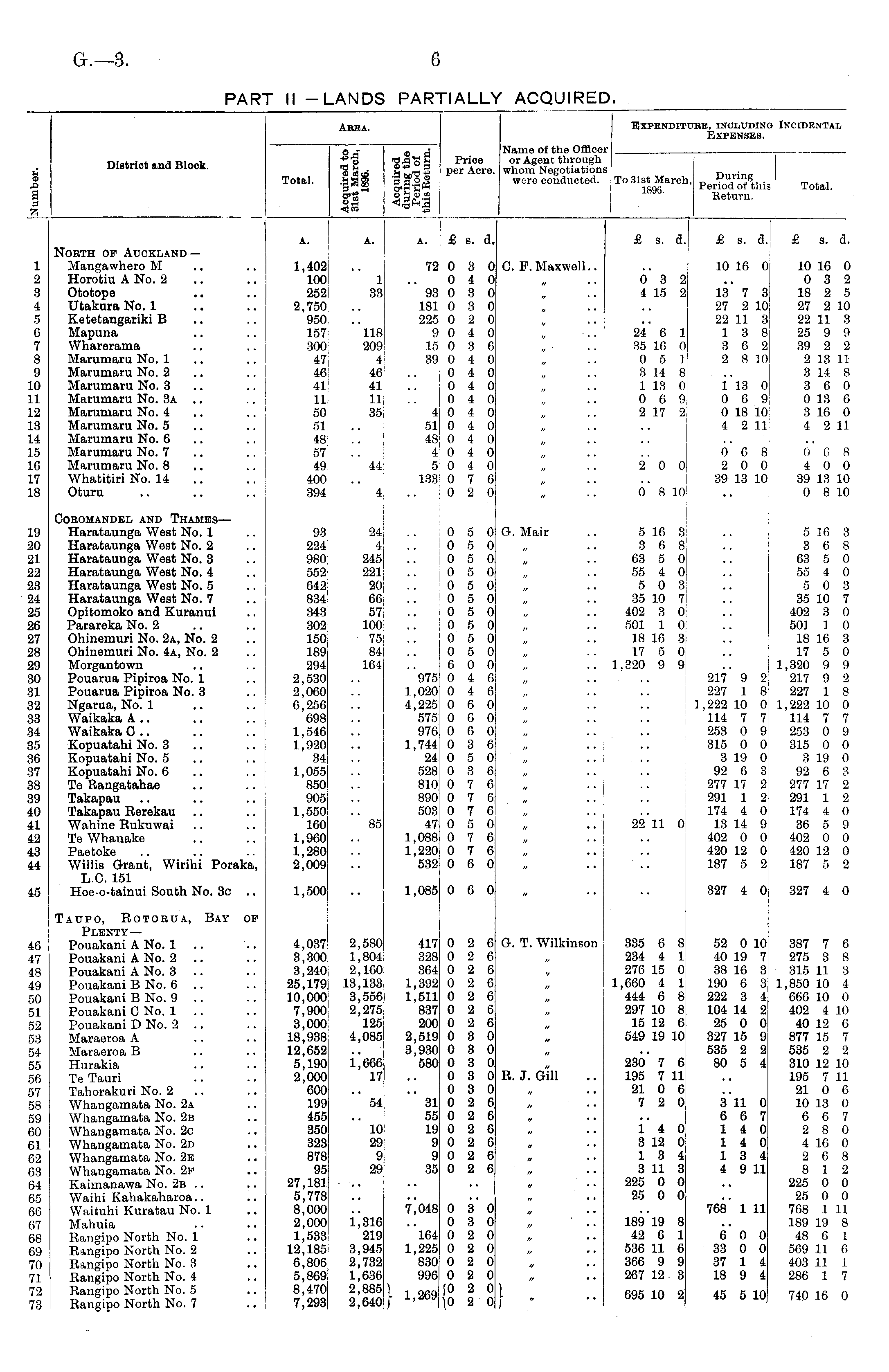 i District and Block. Abba. m ■fill expenditube, includinr incidental Expenses. Name of the Officer _. Price or Agent through per Acre, whom Negotiations , „ were conducted, j To 31b]; March, Total. Eeturn. I During ' Period of this Eeturn. Total. Total. A. A. a. £ s. a. £ s. a. £ s. a. £ s. a. 1 a 3 4 5 6 7 8 9 .0 .1 2 .3 .4 .8 6 7 .8 Nobth of Auckland — Mangawhero M Horotiu A No. 2 Ototope Utakura No. 1 Ketetangariki B Mapuna Wharerama Marumaru No. 1 Marumaru No. 2 Marumaru No. 3 Marumaru No. 3a Marumaru No. 4 Marumaru No. 5 Marumaru No. 6 Marumaru No. 7 Marumaru No. 8 Whatitiri No. 14 Oturu 1,402 100 252 ; 2,750 950, 157 300 47, 46| 41: Hi 50! 51] 48' 57 49 400 394 1 33 "ll8 209 4] 46 41 11 35 44 4 72 0 3 0 0 4 0 93 0 3 0 181 0 3 0 225 0 2 0 9| 0 4 0 15 0 3 6 39 1 0 4 0 .. ; 0 4 0 0 4 0 0 4 0 4j 0 4 0 51 0 4 0 48! 0 4 0 4 0 4 0 5 0 4 0 188 0 7 6 0 2 0 C.P.Maxwell.. 0 3 2 4 15 2 "„ .. 24 6 1 35 16 0J 0 5 1 8 14 8i 1 18 0! 0 6 9 2 17 2 10 16 0| 13" 7 3! 27 2 10; 22 11 3' 13 8: 3 6 2| 2 8 10| 1 13 0 0 6 9 0 18 10: 4 2 11, 10 16 0 0 3 2 18 2 5 27 2 10 22 11 3 25 9 9 39 2 2 1 18 11 3 14 8 3 6 0 0 13 6 3 16 0 4 2 11 "„ ■■ 2 0 0! "„ .. 0 8 10 0 6 8 2 0 0! 39 13 10| 0 0 8 4 0 0 39 13 10 0 8 10 .9 !() II !2 !3 M Sβ 16 !7 Iβ !9 10 II (2 18 ;i 15 16 17 18 19 0 tl ;.2 13 14 COROMANDEL AND THAMES— Harataunga West No. 1 Harataunga West No. 2 Harataunga West No. 3 Harataunga West No. 4 Harataunga West No. 5 Harataunga West No. 7 Opitomoko and Kuranui Parareka No. 2 Ohinemuri No. 2a, No. 2 Ohinemuri No. 4a, No. 2 Morgantown Pouarua Pipiroa No. 1 Pouarua Pipiroa No. 3 Ngarua, No. 1 Waikaka A .. Waikaka 0 .. Kopuatahi No. 3 Kopuatahi No. 5 Kopuatahi No. 6 Te Rangatahae Takapau Takapau Rerekau Wahine Rukuwai Te Whanake Paetoke Willis Grant, Wirihi Poraka, L.C. 151 Hoe-o-tainui South No. 3c .. 93 224 980 552 642: 834' 343 302 150; 189i 294; 2,530: 2,060! 6,2561 698 1,546 1,920 34 1,055! 850i 905! 1,550! 160| l,960j l,280| 2,009 24: 4! 245! 221! 20j 66 57 100 75| 84: 164: 86 0 5 0 0 5 0 0 5 0 0 5 0 0 5 0 .. ! 0 5 0 0 5 0 0 5 0 0 5 0 0 5 0 6 0 0 975 0 4 6 1,020 0 4 6 4,225 0 6 0 575 0 6 0 976 0 6 0 1,744 0 3 6 24 0 5 0 528 0 3 6 810 0 7 6 890 0 7 6 503 0 7 6 47 0 5 0 1,088 0 7 6 1,220 0 7 6 532 0 6 0 G. Mair .. 5 16 3 3 6 8: ..I 03 5 0J 55 4 0; 5 0 3 ; .. I 35 10 7! ■ .. I 402 3 0 ..I 501 1 0, ..18 16 3i 17 5 0; .. 1,320 9 9, i " * * i • '.'. I 22'n o| 217' 9 2 227 1 8 1,222 10 0 114 7 7 253 0 9 315 0 0! 8 19 0! 92 6 3 277 17 2 291 1 2 174 4 0 13 14 9: 402 0 0 420 12 0 187 5 2 5 16 3 3 6 8 63 5 0 55 4 0 5 0 3 35 10 7 402 3 0 501 1 0 18 16 3 17 5 0 1,320 9 9 217 9 2 227 1 8 1,222 10 0 114 7 7 253 0 9 315 0 0 3 19 0 92 6 8 277 17 2 291 1 2 174 4 0 36 5 9 402 0 0 420 12 0 187 5 2 15 1,500 1,085 0 6 0 327 4 0 327 4 0 16 17 48 49 50 51 52 58 54 55 56 57 58 59 60 61 62 63 64 65 66 (17 68 69 70 71 72 78 Taopo, Rotorua, Bay op Plenty— Pouakani A No. 1 .. Pouakani A No. 2 .. Pouakani A No. 3 .. Pouakani B No. 6 .. Pouakani B No. 9 .. Pouakani C No. 1 .. Pouakani D No. 2 .. Maraeroa A Maraeroa B Hurakia Te Tauri Tahorakuri No. 2 .. Whangamata No. 2a Whangamata No. 2b Whangamata No. 2c Whangamata No. 2d Whangamata No. 2e Whangamata No. 2p Kaimanawa No. 2b .. Waihi Kahakaharoa.. Waituhi Kuratau No. 1 Mahuia Rangipo North No. 1 Rangipo North No. 2 Rangipo North No. 3 Rangipo North No. 4 Rangipo North No. 5 Rangipo North No. 7 4,037 3,300 3,240 25,179 10,000 7,900 3,000 18,938 12,652 5,190 2,000 600 199 455 350 323 878 95 27,181 5,778 8,000 2,000 1,533 12,185 6,806 5,869 8,470 7,293 4,037 3,300 3,240 !5,179 :o,ooo 7,900 3,000 :8,938 .2,652 5,190 2,000 600 199 2,580 l,804i 2,160! 13,133 3,556 2,275 125 4,085 i J666 17 54 417 0 2 6 328 0 2 6 364 0 2 6 1,392 0 2 6 1,511 0 2 6 837 0 2 6 200 0 2 6 2,519 0 3 0 3,930 0 3 0 580 0 3 0 0 3 0 0 3 0 31 0 2 6 55 0 2 6 19 0 2 6 9 0 2 6 9 0 2 6 35 0 2 6 G. T. Wilkinson 335 6 8 234 4 1 276 15 0J 1,660 4 1 444 6 81 297 10 8| 15 12 61 549 19 10 230' 7 6 R. J. Gill .. 195 7 11 ..I 21 0 6 7 2 0 "„ .. i 4 0! 3 12 Oi 13 4 3 11 3 225 0 0 25 0 0 "„ '.'. 18919 8 42 6 1 536 11 6 366 9 9 267 12 3 52 0 10 40 19 7 38 16 3 190 6 3 222 3 4 104 14 2 25 0 0 327 15 9 535 2 2 80 5 4 3 11 0 6 6 7 14 0 14 0 13 4 4 9 11 768' 1 11 60 0 33 0 0 37 1 4 18 9 4 387 7 6 275 3 8 315 11 3 1,850 10 4 666 10 0 402 4 10 40 12 6 877 15 7 535 2 2 310 12 10 195 7 11 21 0 6 10 13 0 6 6 7 2 8 0 4 16 0 2 6 8 8 1 2 225 0 0 25 0 0 768 1 11 189 19 8 48 0 1 569 11 f> 403 11 1 286 1 7 455 350 323 878 95 10 29 9 29 57,181 5,778 7,048 0 3 0 0 3 0 164 0 2 0 1,225 0 2 0 830 0 2 0 996 0 2 0 ) 1 ofiq [0 2 0 f 1 ' 2by \0 2 0 8,000 2,000 1,533 .2,185 6,806 5,869 8,470 7,293 1,316 219 3,945 2,732 1,636 2,885 2,640 \ .. 695 10 2 45 5 10 740 16 0