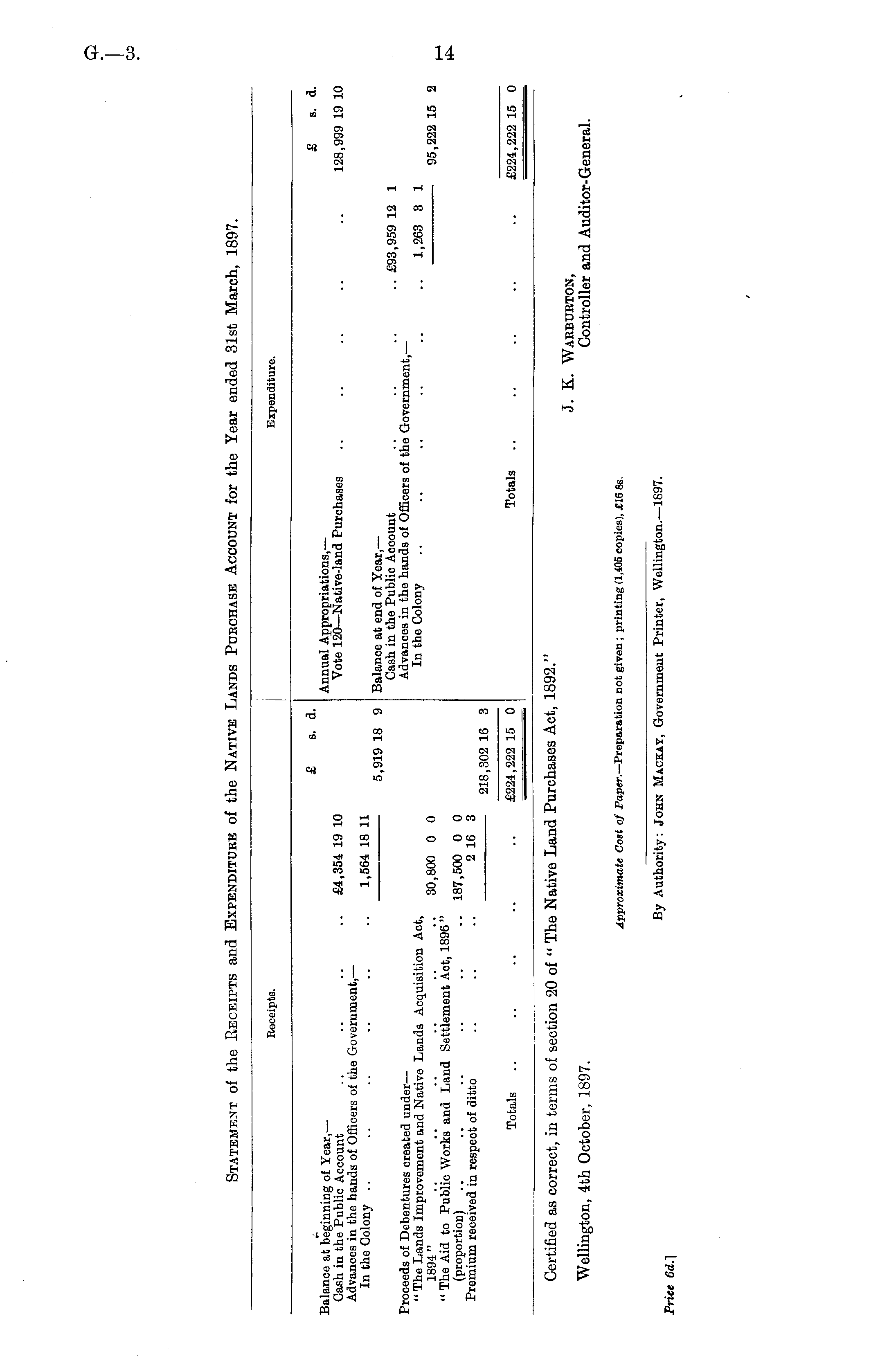 Certified as correct, in terms of section 20 of " The Native Land Purchases Act, 1892." J. K. Waebueton, Wellington, 4th October, 1897. Controller and Auditor-General. Approximate Cost of Paper.— Preparation not given ; printing (1,405 copies), £16 Bs.
