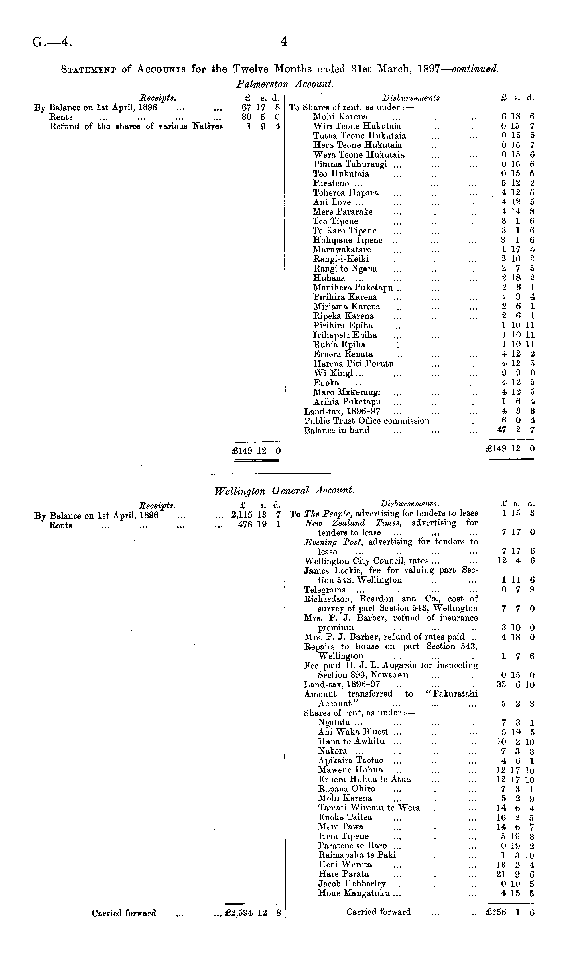 Wellington General Account. Receipts. £ s. d. ) Disbursements. £a. d. By Balance on Ist April, 1896 ... ... 2,115 13 7To The People, advertising for tenders.to lease 115 3 Rents t-i ... ... 478 19 1 Neto Zealand Times, advertising for tenders to lease ... ... ... 717 0 Evening Post, advertising for tenders to lease ... ... ... ... 7 17 6 Wellington City Council, rates ... ... 12 4 6 James Lockie, fee for valuing part Section 543, Wellington ... ... 1 11 6 Telegrams ... ... ... ... 0 7 9 Richardson, Reardon and Co., cost of survey of part Section 543, Wellington 7 7 0 Mrs. P. J. Barber, refund of insurance premium ... ... ... 3 10 0 Mrs. P. J. Barber, refund of rates paid ... 4 18 0 Repairs to house on part Section 543, Wellington ... ... ... 176 Fee paid 11. J. L. Augarde tor inspecting Section 893, Newtown ... ... 0 15 0 Land-tax, 1896-97 ... ... ... 35 610 Amount transferred to " Pakuratahi Account" ... ... ... 5 2 3 Shares of rent, as under :— Ngatata ... ... ... ... 7 3 1 Ani Waka Bluett ... ...' ... 5 19 5 Hana te Awhitu ... ... ... 10 2 10 Nakora ... ... ... ... 7 3 3 Apikaira Taotao ... ... ... 4 6 1 Mawene Hohua ... ... ... 12 17 10 Eruera Ilohua te Atua ... ... 12 17 10 Rapana Ohiro ... ... ... 731 Mohi Karena ... ... ... 5129 Tauiati Wiremu te Wera ... ... 14 6 4 Enoka Taitea ... ... ... 16 2 5 Mere Pawa ... ... ... 14 6 7 lleni Tipene ... ... ... 5 19 3 Paratene te Raro ... ... ... 0192 Raimapaha te Paki ... ... 1 3 10 Heni Wereta ... ... ... 13 2 4 Hare Parata ... ... . ... 21 9 6 Jacob Ilebberley ... ... ... 0 10 5 Hone Mangatuku ... ... ... 4 15 5 Carried forward ... ...£2,594 12 8 Carried forward ... ... £256 1 6
