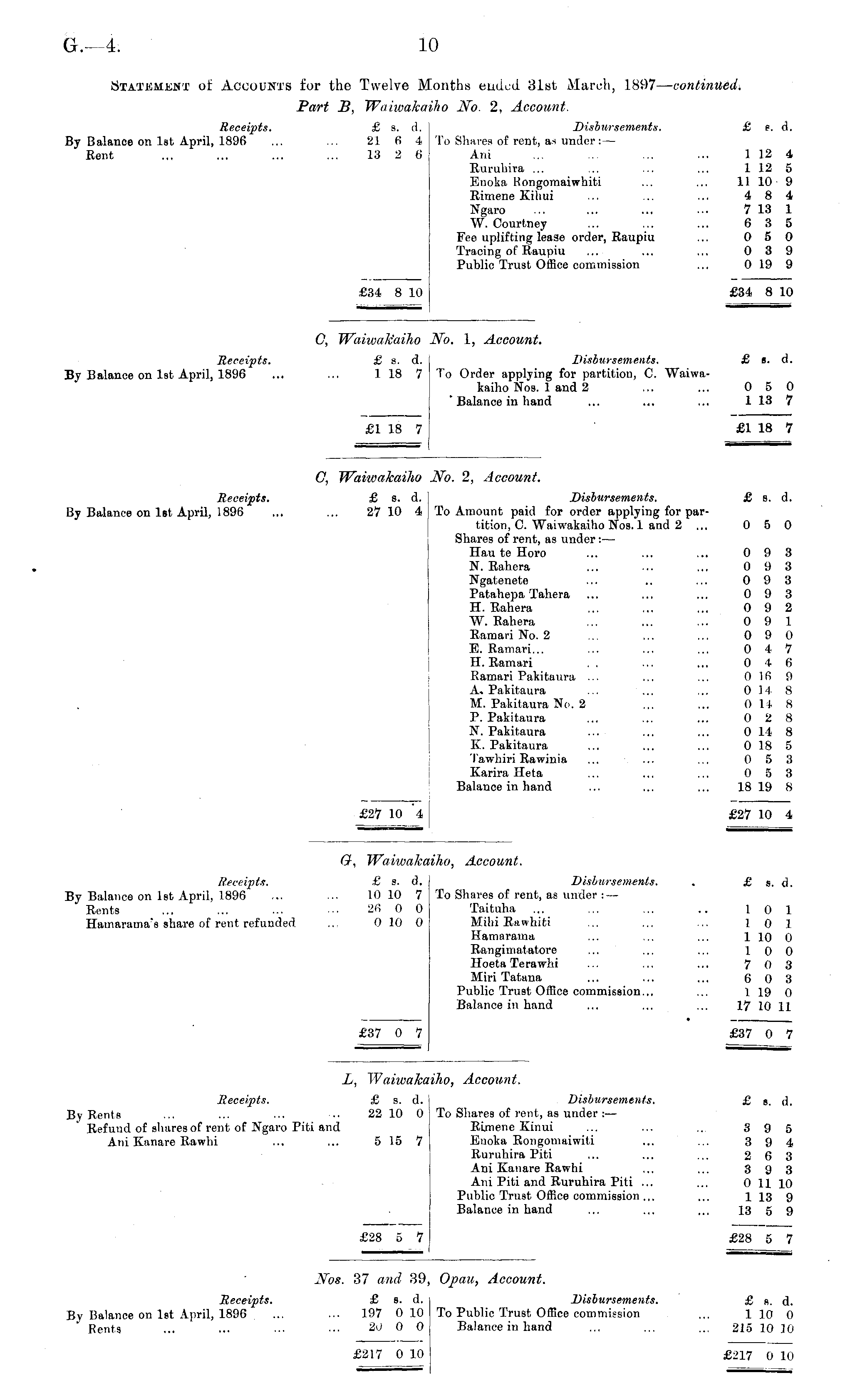 Statement of Accounts for the Twelve Months ended 31st March, 1897— continued. Part B, Waiwakaiho No. 2, Account. Receipts. £ s. d. Disbursements. £ s. d. By Balance on Ist April, 1896 ... ... 21 6 4 To Shares of rent, as under: — Rent ... ... ... ... 13 2 6 Ani ... ... ... ... 1 12 4 Ruruhira ... ... ... ... 1 12 5 Enoka Hongomaiwhiti ... ... 11 10 9 Rimene Kihui ... ... ... 484 Ngaro ... ... ... ... 7 13 1 W. Courtney ... ... ... 6 3 5 Fee uplifting lease order, Raupiu ... 0 5 0 Tracing of Raupiu ... ... ... 039 Public Trust Office commission ... 0 19 9 £34 8 10 £34 8 10