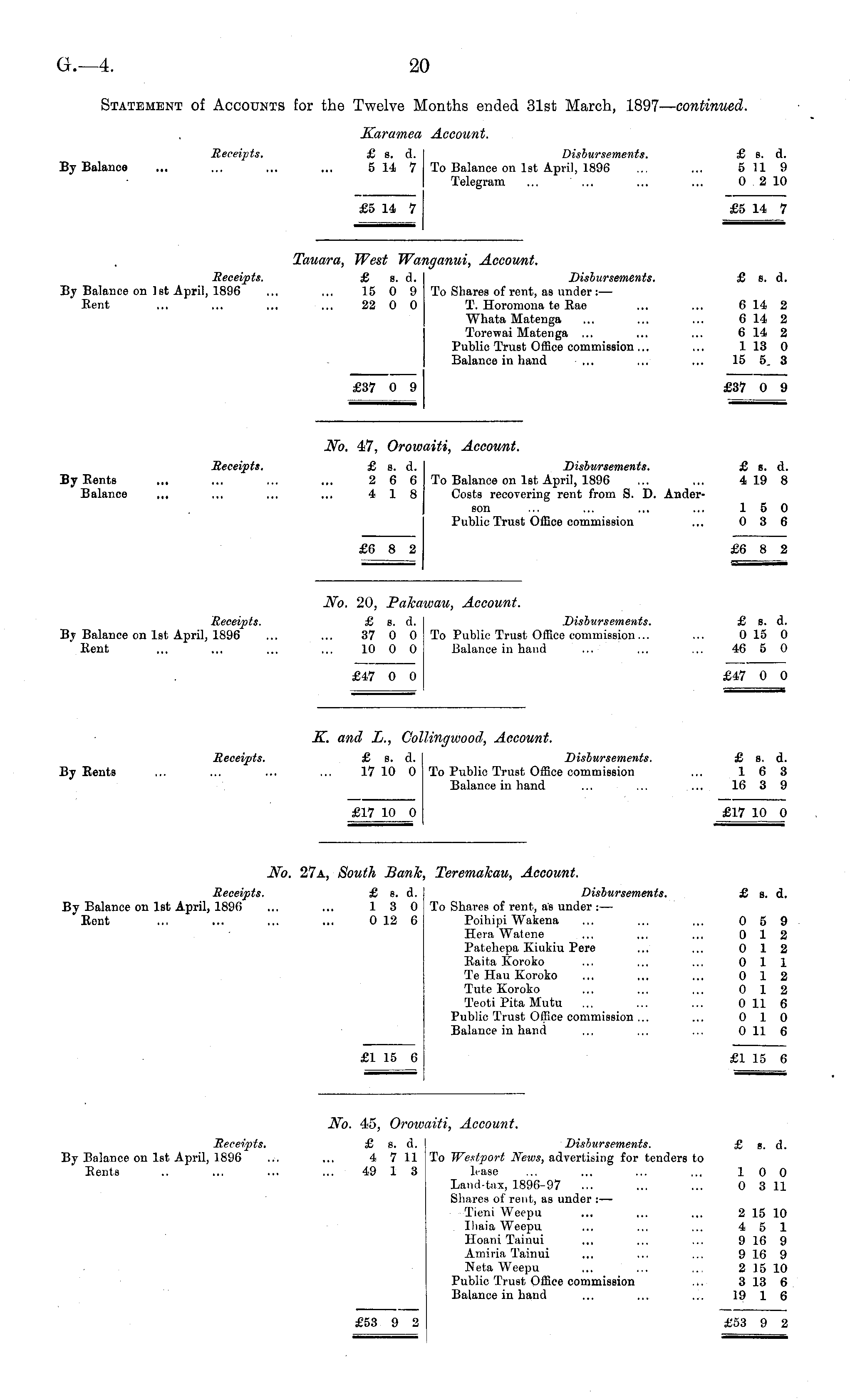 No. 47, Orowaiti, Account. Receipts. £ s. d. Disbursements. £ s. d. By Rents ... ... ... ... 2 6 6 To Balance on Ist April, 1896 ... ... 4 19 8 Balance .., ... ... ... 4 18 Costs recovering rent from S. D. Anderson ... ... ... ... 15 0 Public Trust Office commission ... 0 3 6 £6 8 2 £6 8 2