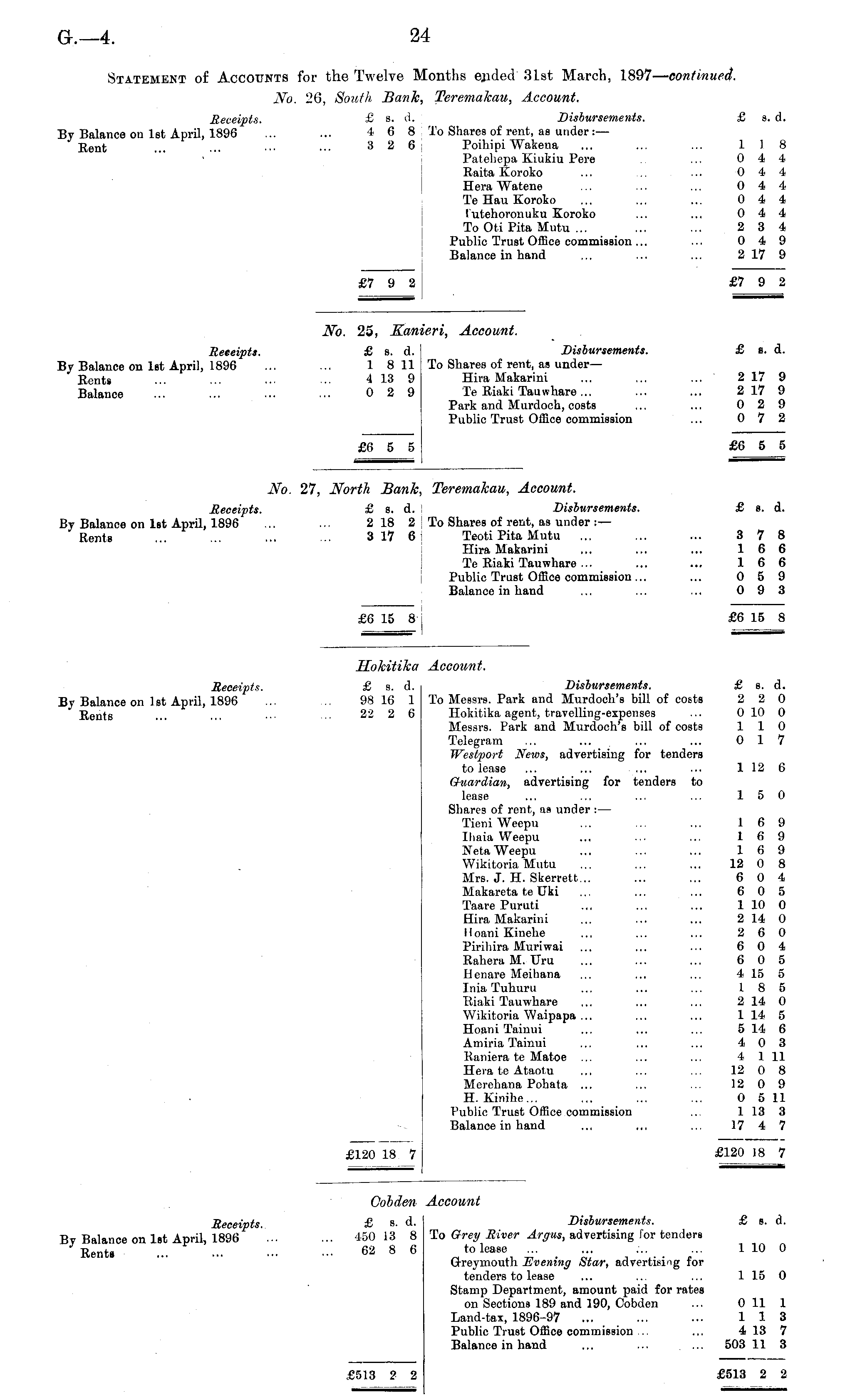 Hokitika Account. Receipts. £ s. d. Disbursements. £ s. d. By Balance on Ist April, 1896 ... ... 98 16 1 To Messrs. Park and Murdoch's bill of costs 2 2 0 Rents ... ... ■■■ ... 22 2 6 Hokitika agent, travelling-expenses ... 0 10 0 Messrs. Park and Murdoch's bill of costs 110 Telegram ... ... ... ... 0 17 Westport News, advertising for tenders to lease ... ... ... ... 1126 Guardian, advertising for tenders to lease ... ... ... ... 150 Shares of rent, as under : — Tieni Weepu ... ... ... 16 9 Ihaia Weepu ... ... ... 169 Neta Weepu ... ... ... 16 9 Wikitoria Mutu ... ... ... 12 0 8 Mrs. J. H. Skerrett... ... ... 6 0 4 Makareta te Uki ... ... ... 6 0 5 Taare Puruti ... ... ... 1 10 0 Hira Makarini ... ... ... 2 14 0 Hoani Kinehe ... ... ... 260 Pirihira Muriwai ... ... ... 604 Rahera M. TJru ... ... ... 6 0 5 Henare Meihana ... ... ... 4 15 5 Inia Tuhuru ... ... ... 185 Riaki Tauwhare ... ... ... 2 14 0 Wikitoria Waipapa ... ... ... 1 14 5 Hoani Tainui ... ... ... 5 14 6 Amiria Tainui ... ... ... 403 Raniera te Matoe ... ... ... 4 1 11 Hera te Ataotu ... ... ... 12 0 8 Merehana Pohata ... ... ... 12 0 9 H. Kinihe... ... ... ... 0 5 11 Public Trust Office commission ... 1 13 3 Balance in hand ... ... ... 1747 £120 18 7 £120 18 7 — — -