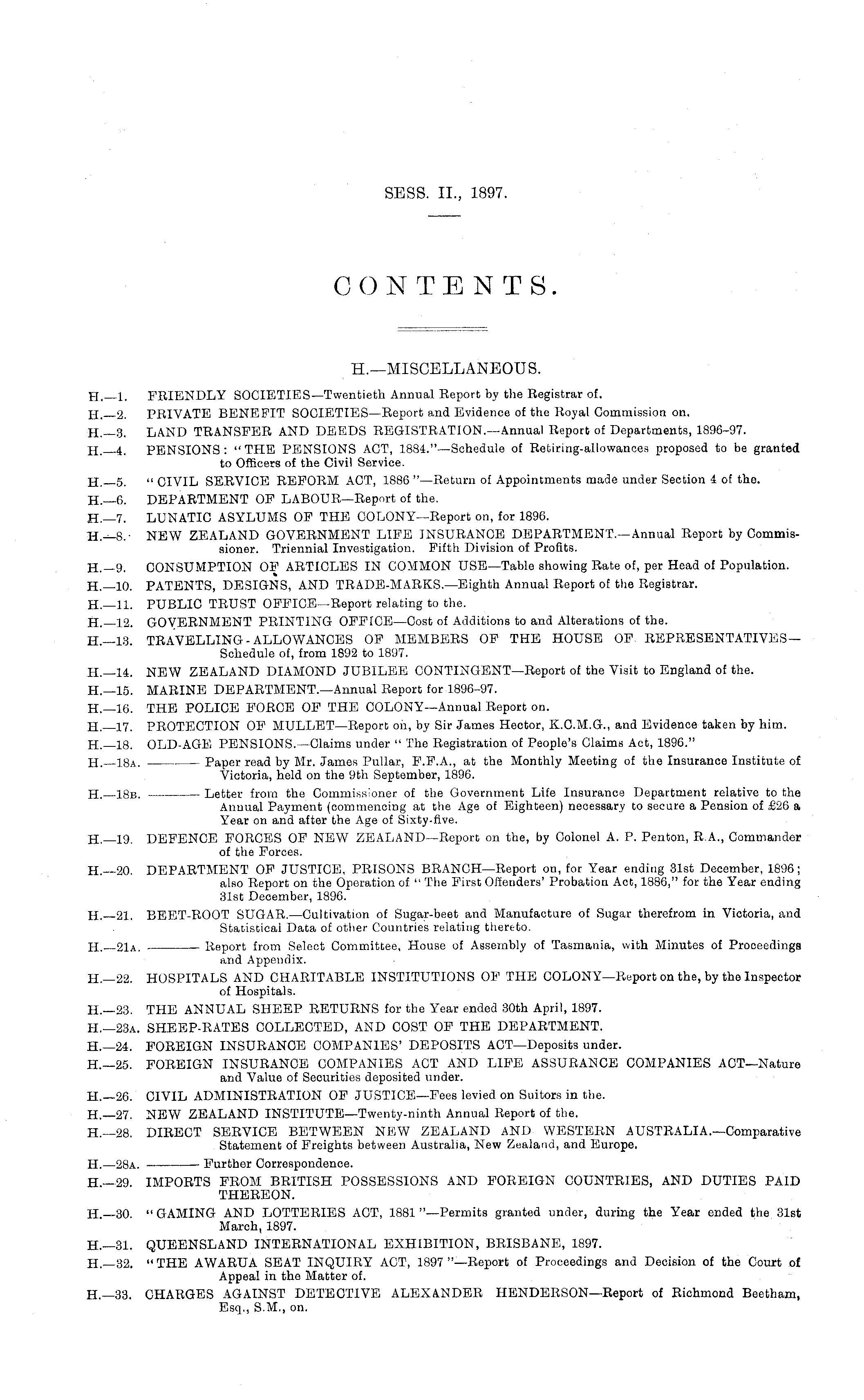 H.—MISCELLANEOUS. H.—l. FRIENDLY SOClETlES—Twentieth Annual Report by the Registrar of. H. 2. PRIVATE BENEFIT SOCIETIES—Report and Evidence of the Royal Commission on. H.—3. LAND TRANSFER AND DEEDS REGISTRATION.—AnnuaI Report of Departments, 1896-97. H. 4. PENSIONS: "THE PENSIONS ACT, 1884."—Schedule of Retiring-allowances proposed to be granted to Officers of the Civil Service. H 5. <■ CIVIL SERVICE REFORM ACT, 1886 " —Return of Appointments made under Section 4of the. H.—6. DEPARTMENT OF LABOUR—Report of the. H.—Y. LUNATIC ASYLUMS OF THE COLONY—Report on, for 1896. NEW ZEALAND GOVERNMENT LIFE INSURANCE DEPARTMENT.—AnnuaI Report by Commissioner. Triennial Investigation. Fifth Division of Profits. H.—9. CONSUMPTION OF ARTICLES IN COMMON USE—Table showing Rate of, per Head of Population. H.—lo. PATENTS, DESIGNS, AND TRADE-MARKS.—Eighth Annual Report of the Registrar. H.—ll. PUBLIC TRUST OFFICE—Report relating to the. H.—l2. GOVERNMENT PRINTING OFFICE—Cost of Additions to and Alterations of the. H.—l3. TRAVELLING - ALLOWANCES OF MEMBERS OF THE HOUSE OF REPRESENTATIVES— Schedule of, from 1892 to 1897. H.—l4. NEW ZEALAND DIAMOND JUBILEE CONTINGENT—Report of the Visit to England of the. H.—ls. MARINE DEPARTMENT.—AnnuaI Report for 1896-97. H.—l6. THE POLICE FORCE OF THE COLONY—Annual Report on. H. 17. PROTECTION OF MULLET—Report oh, by Sir James Hector, K.C.M.G., and Evidence taken by him. H.—lB. OLD-AGE 1 . PENSIONS.—CIaims under " The Registration of People's Claims Act, 1896." H. 18a. Paper read by Mr. James Pullar, F.F.A., at the Monthly Meeting of the Insurance Institute of Victoria, held on the 9th September, 1896. H. —18b. Letter from the Commissioner of the Government Life Insurance Department relative to the Annual Payment (commencing at the Age of Eighteen) necessary to secure a Pension of £26 a Year on and after the Age of Sixty-five. H.—l9. DEFENCE FORCES OF NEW ZEALAND—Report on the, by Colonel A. P. Penton, R.A., Commander of the Forces. H.—2o. DEPARTMENT OF JUSTICE, PRISONS BRANCH—Report on, for Year ending 31st December, 1896; also Report on the Operation of " The First Offenders' Probation Act, 1886," for the Year ending 31st December, 1896. H. 21. BEET-ROOT SUGAR. —Cultivation of Sugar-beet and Manufacture of Sugar therefrom in Victoria, and Statistical Data of other Countries relating thereto. H.—2la. Report from Select Committee, House of Assembly of Tasmania, with Minutes of Proceedings and Appendix. H.—22. HOSPITALS AND CHARITABLE INSTITUTIONS OF THE COLONY—Report on the, by the Inspector of Hospitals. H.—23. THE ANNUAL SHEEP RETURNS for the Year ended 30th April, 1897. H.—23a. SHEEP-RATES COLLECTED, AND COST OF THE DEPARTMENT. H.—24. FOREIGN INSURANCE COMPANIES' DEPOSITS ACT—Deposits under. H.—25. FOREIGN INSURANCE COMPANIES ACT AND LIFE ASSURANCE COMPANIES ACT—Nature and Value of Securities deposited under. H.—26. CIVIL ADMINISTRATION OF JUSTICE—Fees levied on Suitors in the. H.—27. NEW ZEALAND INSTITUTE—Twenty-ninth Annual Report of the. H.—2B. DIRECT SERVICE BETWEEN NEW ZEALAND AND WESTERN AUSTRALlA.—Comparative Statement of Freights between Australia, New Zealand, and Europe. H.—2Ba. Further Correspondence. H—29 IMPORTS FROM BRITISH POSSESSIONS AND FOREIGN COUNTRIES, AND DUTIES PAID THEREON. H.—3o. " GAMING AND LOTTERIES ACT, 1881 "—Permits granted under, during the Year ended the 31st March, 1897. H.—3l. QUEENSLAND INTERNATIONAL EXHIBITION, BRISBANE, 1897. H.—32. " THE AWARUA SEAT INQUIRY ACT, 1897 "—Report of Proceedings and Decision of the Court of Appeal in the Matter of. H.—33. CHARGES AGAINST DETECTIVE ALEXANDER HENDERSON—Report of Richmond Beetham, Esq., S.M., on.