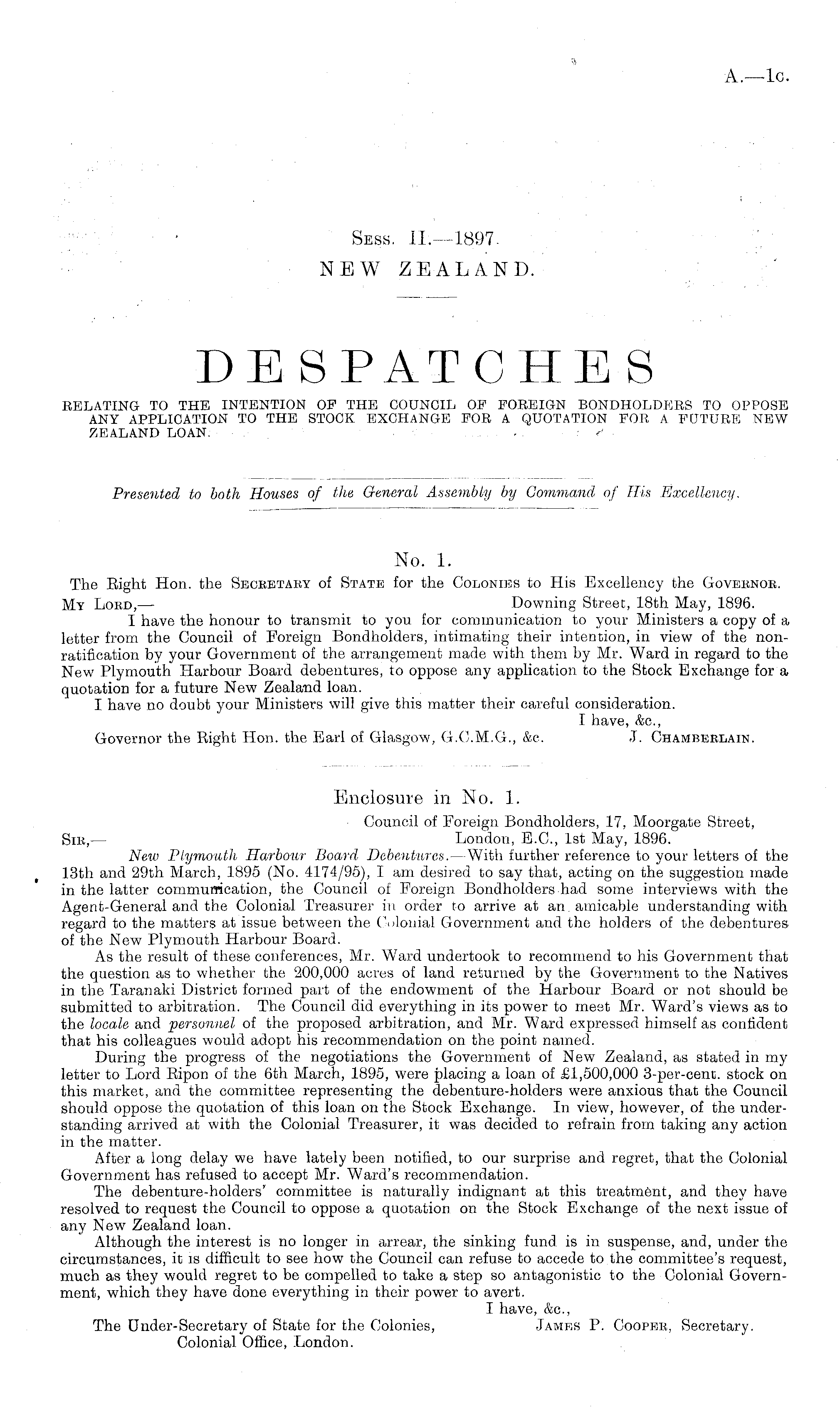 No. 1. The Eight Hon. the Sbcketaky of State for the Colonies to His Excellency the Goveknob. My Lord, — Downing Street, 18th May, 1896. I have the honour to transmit to you for communication to your Ministers a copy of a letter from the Council of Foreign Bondholders, intimating their intention, in view of the nonratification by your Government of the arrangement made with them by Mr. Ward in regard to the New Plymouth Harbour Board debentures, to oppose any application to the Stock Exchange for a quotation for a future New Zealand loan. I have no doubt your Ministers will give this matter their careful consideration. I have, &c, Governor the Eight Hon. the Earl of Glasgow, G.C.M.G., &c. J. Chamberlain. Enclosure in No. 1. Council of Foreign Bondholders, 17, Moorgate Street, Sib,— London, 8.C., Ist May, 1896. New Plymouth Harbour Board Debentures. —With further reference to your letters of the 13th and 29th March, 1895 (No. 4174/95), I am desired to say that, acting on the suggestion made in the latter communication, the Council of Foreign Bondholders had some interviews with the Agent-General and the Colonial Treasurer in order to arrive at an. amicable understanding with regard to the matters at issue between the Colonial Government and the holders of the debentures of the New Plymouth Harbour Board. As the result of these conferences, Mr. Ward undertook to recommend to his Government that the question as to whether the 200,000 acres of land returned by the Government to the Natives in the Taranaki District formed part of the endowment of the Harbour Board or not should be submitted to arbitration. The Council did everything in its power to meet Mr. Ward's views as to the locale and personnel of the proposed arbitration, and Mr. Ward expressed himself as confident that his colleagues would adopt his recommendation on the point named. During the progress of the negotiations the Government of New Zealand, as stated in my letter to Lord Eipon of the 6th March, 1895, were placing a loan of £1,500,000 3-per-cent. stock on this market, and the committee representing the debenture-holders were anxious that the Council should oppose the quotation of this loan on the Stock Exchange. In view, however, of the understanding arrived at with the Colonial Treasurer, it was decided to refrain from taking any action in the matter. After a long delay we have lately been notified, to our surprise and regret, that the Colonial Government has refused to accept Mr. Ward's recommendation. The debenture-holders' committee is naturally indignant at this treatment, and they have resolved to request the Council to oppose a quotation on the Stock Exchange of the next issue of any New Zealand loan. Although the interest is no longer in arrear, the sinking fund is in suspense, and, under the circumstances, it is difficult to see how the Council can refuse to accede to the committee's request, much as they would regret to be compelled to take a step so antagonistic to the Colonial Government, which they have done everything in their power to avert. I have, &c, The Under-Secretary of State for the Colonies, James P. Cooper, Secretary. Colonial Office, London.