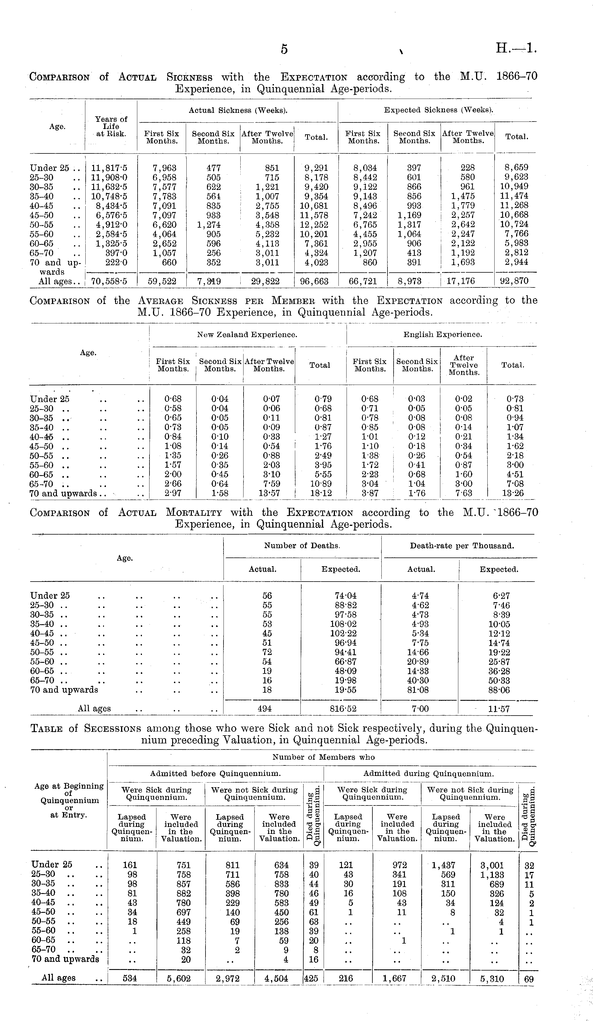 Comparison of Actual Sickness with the Expectation according to the M.U. 1866-70 Experience, in Quinquennial Age-periods.