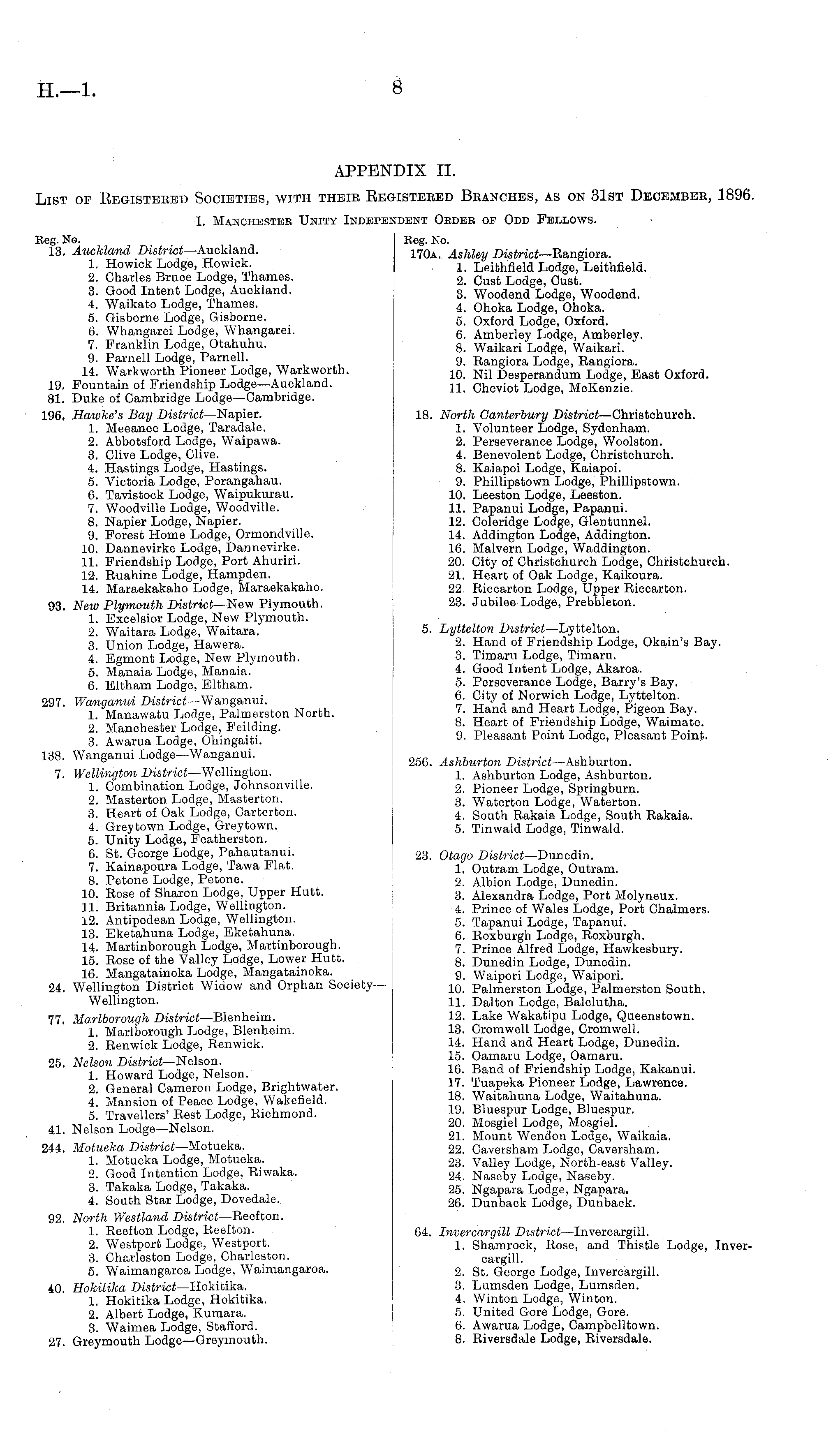 APPENDIX 11. List op Begisteeed Societies, with theib Eegisteeed Beanches, as on 31st Decembee, 1896. I. Manchesteb Unity Independent Obdeb of Odd Fellows. Keg. Nβ. Eeg. No. 13. Auckland District— Auckland. 17Oa s hi ey District— Bangiora. 1. Howick Lodge, Howick L L eithfield Lodge, Leithfield. 2. Charles Bruce Lodge, Thames. 2 . Oust Lodge, Oust. 3. Good Intent Lodge, Auckland. 3 Woodend Lodge, Woodend. 4. Waikato Lodge, Thames. 4- Ohoka Lodge, Ohoka. 5. Gisborne Lodge, Gisborne. 5 Oxford Lodge, Oxford. 6. Whangarei Lodge, Whangarei. 6 Amberley Lodge, Amberley. 7. Franklin Lodge, Otanuhu. 8- Waikari Lodge, Waikari. 9. Parnell Lodge, Parnell. 9 R ang i ora Lodge, Rangiora. 14. Warkworth Pioneer Lodge, Warkwortn. 10 Nn Desperandum Lodge, East Oxford. 19. Fountain of Friendship Lodge—Auckland. n cheviot Lodge, McKenzie. 81. Duke of Cambridge Lodge—Cambridge. 196. JSawke's Bay District —Napier. 18. North Canterbury District —Christchurch. 1. Meeanee Lodge, Taradale. 1. Volunteer Lodge, Sydenham. 2. Abbotsford Lodge, Waipawa. 2. Perseverance Lodge, Woolston. 3. Olive Lodge, Olive. 4. Benevolent Lodge, Christchurch. 4. Hastings Lodge, Hastings. 8. Kaiapoi Lodge, Kaiapoi. 5. Victoria Lodge, Porangahau. 9. Phillipstown Lodge, Phillipstown. 6. Tavistock Lodge, Waipukurau. 10. Leeston Lodge, Leeston. 7. Woodville Lodge, Woodville. 11. Papanui Lodge, Papanui. 8. Napier Lodge, Napier. 12. Coleridge Lodge, Glentunnel. 9. Forest Home Lodge, Ormondville. 14. Addington Lodge, Addington. 10. Dannevirke Lodge, Dannevirke. 16. Malvern Lodge, Waddington. 11. Friendship Lodge, Port Ahuriri. 20. City of Christchurch Lodge, Christchurch. 12. Ruahine Lodge, Hampden. 21. Heart of Oak Lodge, Kaikoura. 14. Maraekakaho Lodge, Maraekakaho. 22. Riccarton Lodge, Upper Riccarton. 93. New Plymouth District— New Plymouth. 23. Jubilee Lodge, Prebbleton. 1. Excelsior Lodge, New Plymouth. 2. Waitara Lodge, Waitara. 5. Lyttelton District— Lyttelton. 3. Union Lodge, Hawera. 2. Hand of Friendship Lodge, Okain's Bay. 4. Egmont Lodge, New Plymouth. 3. Timaru Lodge, Timaru. 5. Manaia Lodge, Manaia. 4- Good Intent Lodge, Akaroa. 6. Eltham Lodge. Eltham. 5. Perseverance Lodge, Barry's Bay. 297. Wanganui District-W*ng*nm. 6. City of Norwich Lodge, Lyttelton. 1. Manawatu Lodge, Palmerston North. \- gand and Heart Lodge Rgeon Bay 2. Manchester Lodge, Feilding. 8. Heart of Friendship Lodge, Waimate 3. Awarua Lodge, Ohmgaiti. 9 - Pleasant Pomt Lodge, Pleasant Point. 138. Wanganui Lodge-Wanganui. Ashbuftm District _ &shhvL , ton , 7. Wellington District—Wellington. L Ashburton Lodge, Ashburton. 1. Combination Lodge, Johnsonville. 2 Pioneer Lodge, Springburn. 2. Masterton Lodge, Masterton. 3 Waterton Lodge, Waterton. 3. Heart of Oak Lodge, Carterton. 4. South R a k a ia Lodge, South Rakaia. 4. Greytown Lodge, Greytown. 5, Tinwald Lodge, Tinwald. 5. Unity Lodge, Featherston. 6. St. George Lodge, Pahautanui. 2 3. Otago District— Dunedin. 7. Kainapoura Lodge, Tawa Flat. j. Outram Lodge, Outram. 8. Petone Lodge, Petone. 2 . Albion Lodge, Dunedin. 10. Rose of Sharon Lodge, Upper Hutt. 3 Alexandra Lodge, Port Molyneux. 11. Britannia Lodge, Wellington. .4, p r j noe o f Wales Lodge, Port Chalmers. 12. Antipodean Lodge, Wellington. 5 Tapanui Lodge, Tapanui. 13. Eketahuna Lodge, Eketahuna. 6 . Eoxburgh Lodge, Roxburgh. 14. Martinborough Lodge, Martmborough. 7> Prince Alfred Lodge, Hawkesbury. 15. Rose of the Valley Lodge, Lower Hutt. j) une( jj u Lodge, Dunedin. 16. Mangatainoka Lodge, Mangatainoka. g Waipori Lodge, Waipori. 24. Wellington District Widow and Orphan Society— 10 p a i mer ston Lodge, Palmerston South. Wellington. 11, Dalton Lodge, Balclutha. 77. Marlborough District —Blenheim. 12. Lake Wakatipu Lodge, Queenstown. 1. Marlborough Lodge, Blenheim. 13. Cromwell Lodge, Cromwell. 2. Renwick Lodge, Renwick. 14. Hand and Heart Lodge, Dunedin. 2<i Nelson District—Nelson 15 - Oamaru Lodge, Oamaru. 25. Ne S o» IMgtJ £ 16. Band of Friendship Lodge, Kakanui. 2. General Cameron Lodge, Brightwater. "• Pioneer Lodge Lawrence. 4. Mansion of Peace Lodge, Wakefield. 18. Waitahuna Lodge Wa.tahuna. 5. Travellers' Rest Lodge, Richmond. f- Kuespur Lodge Bluespur. 41. Nelson Lodge-Nelson. 20. Mosgiel Lodge, Mosgiel 6 Mount Wendon Lodge, Waikaia. 244. Motueka District— -Motueka. 22. Caversham Lodge, Caversham. 1. Motueka Lodge, Motueka. 23. Valley Lodge, North-east Valley. 2. Good Intention Lodge, Riwaka. 24. Naseby Lodge, Naseby. 3. Takaka Lodge, Takaka. 25. Ngapara Lodge, Ngapara. 4. South Star Lodge, Dovedale. 26. Dunbaok Lodge, Dunback. 92. North Westland District—^Reef ton. 1. Reefton Lodge, Reefton. 64. Invercargill District —Invercargill. 2. Westport Lodge, Westport. 1. Shamrock, Rose, and Thistle Lodge, Inver3. Charleston Lodge, Charleston. cargill. 5. Waimangaroa Lodge, Waimangaroa. 2. St. George Lodge, Invercargill. 40. Bokitika District —Hokitika. 3. Lumsden Lodge, Lumsden. 1. Hokitika Lodge, Hokitika. 4. Winton Lodge, Winton. 2. Albert Lodge, Kumara. 5. United Gore Lodge, Gore. 3. Waimea Lodge, Stafford. 6. Awarua Lodge, Campbelltown. 27. Greymouth Lodge—Greymouth. 8. Riversdale Lodge, Riversdale.