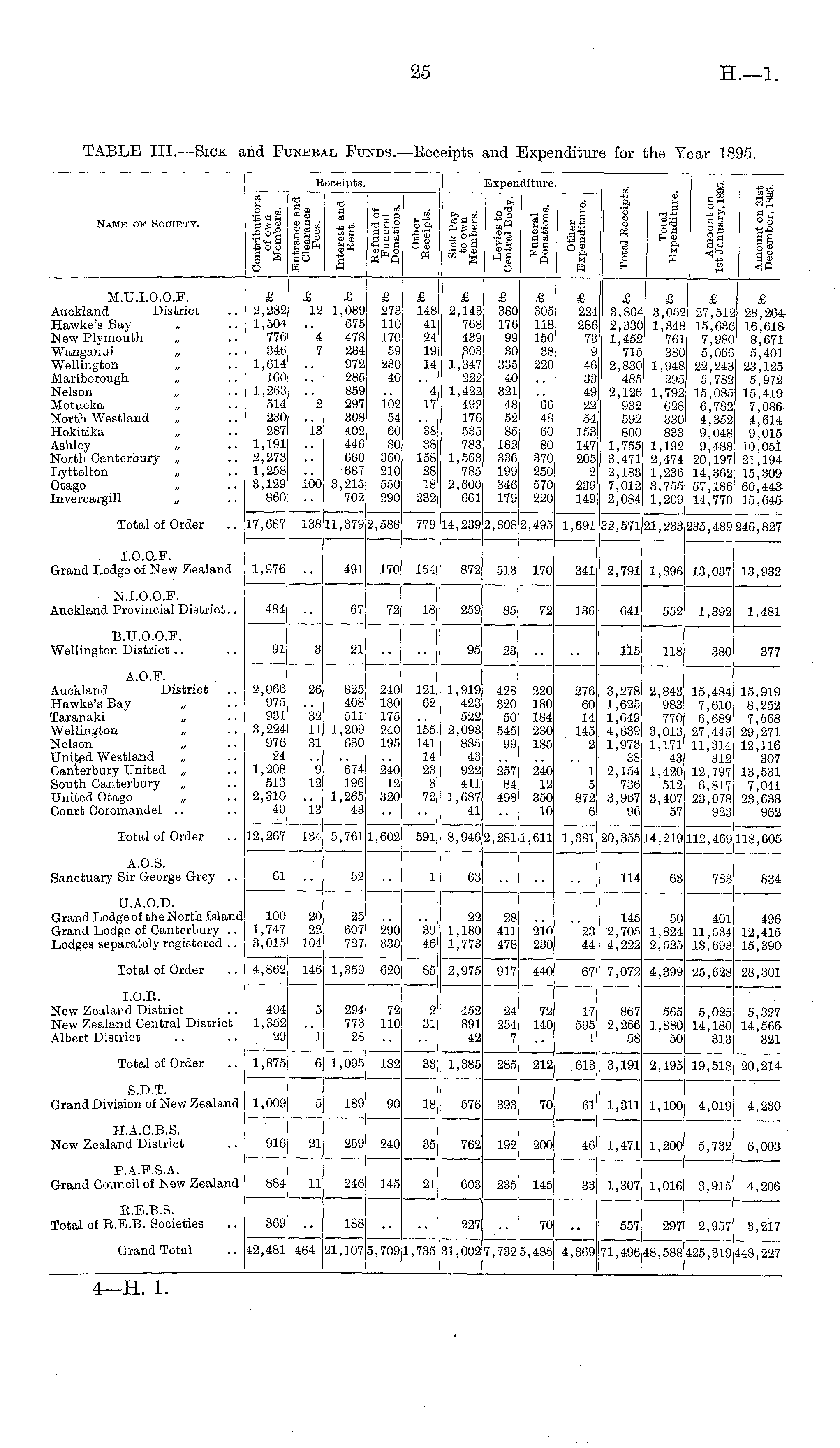 Name of Society. III +3 o © is OH.; pl BO H Receipts. "S a Cβ d 111 ft g» Expenditure. it > s ■SB a 2.2 'ss II II to "<D <y 0 « 3 o ( §1 M If 11 |l M.U.I.O.O.F. Auckland District Hawke's Bay New Plymouth „ Wanganui „ Wellington „ Marlborough Nelson „ Motueka „ North Westland Hokitika „ Ashley „ North Canterbury „ Lyttelton „ Otago „ Invercargill „ £ 2,282 1,504 776 346 1,614 160 1,263 514 230 287 1,191 I 2,273 1,258 3,129 860 £ 12 "i 7 ■• .. 2 £ 1,089 675 478 284 972 285 859 297 308 402 446 680 687 3,215 702 £ i 273 i 110 i 170 59 : 230 40 i .. i 102 54 60 80 360 210 550 290 £ 148 41 24 19 14 4 17 £ 2,143 768 439 303 1,347 222 1,422 492 176 535 783 1,563 785 2,600 661 £ 380 176 99 30 335 40 321 48 52 85 182 336 199 346 179 £ 305 118 150 38 220 .. 06 48 60 80 370 250 570 220 £ 224 286 73 Q 46 33 49 22 54 153 147 205 2 239 149 £ 3,804 2,330 1,452 715 2,830 485 2,126 932 592 800 1,755 3,471 2,183 7,012 2,084 £ 3,052 1,348 761 380 1,948 295 1,792 628 330 833 1,192 2,474 1,236 3,755 1,209 £ 27,512 15,636 7,980 5,066 22,243 5,782 15,085 6,782 4,352 9,048 9,488 20,197 14,302 57,186 14,770 £ 28,264 16,618 8,671 5,401 23,125 5,972 15,419 7,086 4,614 9,015 10,051 21,194 15,309 60,443 15,645 13 38 38 158 28 18 232 100 Total of Order 17,687 138 11,379 2,588 779 14,239 2,808 2,495 1,691 32,571 21,233 235,489 246,827 I.O.Q.F. Grand Lodge of New Zealand 1,976 491 170 154 872 513 170 341 2,791 1,896 13,037 13,932 N.I.O.O.F. Auckland Provincial District.. 484 67 72 18 259 85 72 136 641 552 1,392 1,481 B.U.O.O.F. Wellington District 91 3 21 95 23 115 118 380 377 A.O.F. Auckland District Hawke's Bay „ Taranaki „ Wellington „ Nelson „ United Westland „ Canterbury United „ South Canterbury „ United Otago Court Coromandel 2,066 975 931 3,224 976 24 1,208 513 2,310 40 26 32 11 31 825 408 511 1,209 030 240 180 175 240 195 121 62 155 141 14 23 3 72 1,919 423 522 2,093 885 43 922 411 1,687 41 428 320 50 545 99 220 180 184 230 185 276 60 14 145 2 3,278 1,625 1,649 4,839 1,973 38 2,154 736 8,967 96 2,843 983 770 3,013 1,171 43 1,420 512 3,407 57 15,484 7,610 6,689 27,445 11,314 312 12,797 6,817 23,078 923 15,919 8,252 7,568 29,271 12,116 307 13,531 7,041 23,638 962 9 12 674 196 1,265 43 240 12 320 257 84 498 240 12 350 10 1 5 872 6 13 Total of Order 12,267 134 5,761 1,602 591 8,946 2,281 1,611 1,381 20,355 14,219 112,469 118,605 A.O.S. Sanctuary Sir George Grey .. 61 52 1 63 114 63 783 834 U.A.O.D. Grand Lodge of the North Island Grand Lodge of Canterbury .. Lodges separately registered .. 100 1,747 3,015 4,862 20 22 104 25 607 727 290 330 39 46 22 1,180 1,773 28 411 478 210 230 23 44 145 2,705 4,222 7,072 50 1,824 2,525 401 11,534 13,693 496 12,415 15,390 Total of Order 146 1,359 620 85 2,975 917 440 67 4,399 25,628 I 28,301 I I.O.E. New Zealand District New Zealand Central District Albert District 494 1,352 29 5 294 773 28 72 no 1 31 452 891 42 24 254 7 72 140 17 595 1 867 2,266 58 565 1,880 50 5,025 14,180 313 5,327 14,566 321 1 Total of Order 1,875 6 1,095 182 33 1,385 285 212 613 3,191 2,495 19.518 1 20,214 S.D.T. Grand Division of New Zealand t 1,009 5 189 90 18 576 393 70 61 1,311 1,100 4,0191 4,230 H.A.C.B.S. New Zealand District 910 259 240 35 762 192 200 46 1,471 1,200 5,732 6,003 21 P.A.F.S.A. Grand Council of New Zealand 11 246 145 21 603 235 145 33 884 1,307 1,016 3,915 4,206 R.E.B.S. Total of R.E.B. Societies 369 188 227 70 557 297 2,957 3,217 Grand Total 42,481 464 21,107 5,709 1,735 31,002 7,732 5,485 4,369 71,496 48,588 425,319 448,227