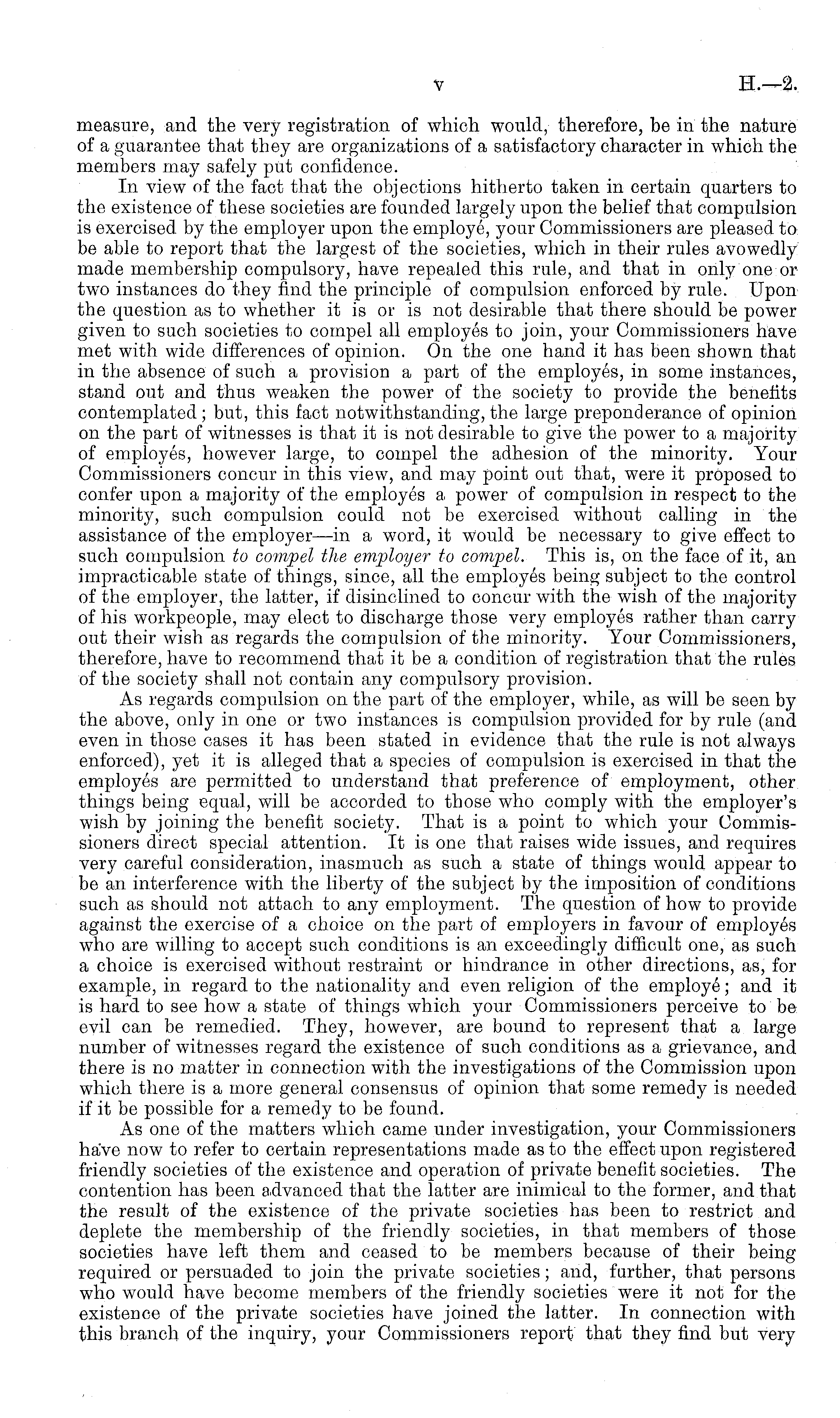 measure, and the very registration of which would, therefore, be in the nature of a guarantee that they are organizations of a satisfactory character in which the members may safely put confidence. In view of the fact that the objections hitherto taken in certain quarters to the existence of these societies are founded largely upon the belief that compulsion is exercised by the employer upon the employe, your Commissioners are pleased to : be able to report that the largest of the societies, which in their rules avowedly made membership compulsory, have repealed this rule, and that in only one or two instances do they find the principle of compulsion enforced by rule. Upon the question as to whether it is or is not desirable that there should be power given to such societies to compel all employes to join, your Commissioners have met with wide differences of opinion. On the one hand it has been shown that in the absence of such a provision a part of the employes, in some instances, stand out and thus weaken the power of the society to provide the benefits contemplated ; but, this fact notwithstanding, the large preponderance of opinion on the part of witnesses is that it is not desirable to give the power to a majority of employes, however large, to compel the adhesion of the minority. Your Commissioners concur in this view, and may point out that, were it proposed to confer upon a majority of the employes a power of compulsion in respect to the minority, such compulsion could not be exercised without calling in the assistance of the employer—in a word, it would be necessary to give effect to such compulsion to compel the employer to compel. This is, on the face of it, an impracticable state of things, since, all the employes being subject to the control of the employer, the latter, if disinclined to concur with the wish of the majority of his workpeople, may elect to discharge those very employes rather than carry out their wish as regards the compulsion of the minority. Your Commissioners, therefore, have to recommend that it be a condition of registration that the rules of the society shall not contain any compulsory provision. As regards compulsion on the part of the employer, while, as will be seen by the above, only in one or two instances is compulsion provided for by rule (and even in those cases it has been stated in evidence that the rule is not always enforced), yet it is alleged that a species of compulsion is exercised in that the employes are permitted to understand that preference of employment, other things being equal, will be accorded to those who comply with the employer's wish by joining the benefit society. That is a point to which your Commissioners direct special attention. It is one that raises wide issues, and requires very careful consideration, inasmuch as such a state of things would appear to be an interference with the liberty of the subject by the imposition of conditions such as should not attach to any employment. The question of how to provide against the exercise of a choice on the part of employers in favour of employes who are willing to accept such conditions is an exceedingly difficult one, as such a choice is exercised without restraint or hindrance in other directions, as, for example, in regard to the nationality and even religion of the employe; and it is hard to see how a state of things which your Commissioners perceive to be evil can be remedied. They, however, are bound to represent that a large number of witnesses regard the existence of such conditions as a grievance, and there is no matter in connection with the investigations of the Commission upon which there is a more general consensus of opinion that some remedy is needed if it be possible for a remedy to be found. As one of the matters which came under investigation, your Commissioners have now to refer to certain representations made as to the effect upon registered friendly societies of the existence and operation of private benefit societies. The contention has been advanced that the latter are inimical to the former, and that the result of the existence of the private societies has been to restrict and deplete the membership of the friendly societies, in that members of those societies have left them and ceased to be members because of their being required or persuaded to join the private societies; and, farther, that persons who would have become members of the friendly societies were it not for the existence of the private societies have joined the latter. In connection with this branch of the inquiry, your Commissioners report that they find but very