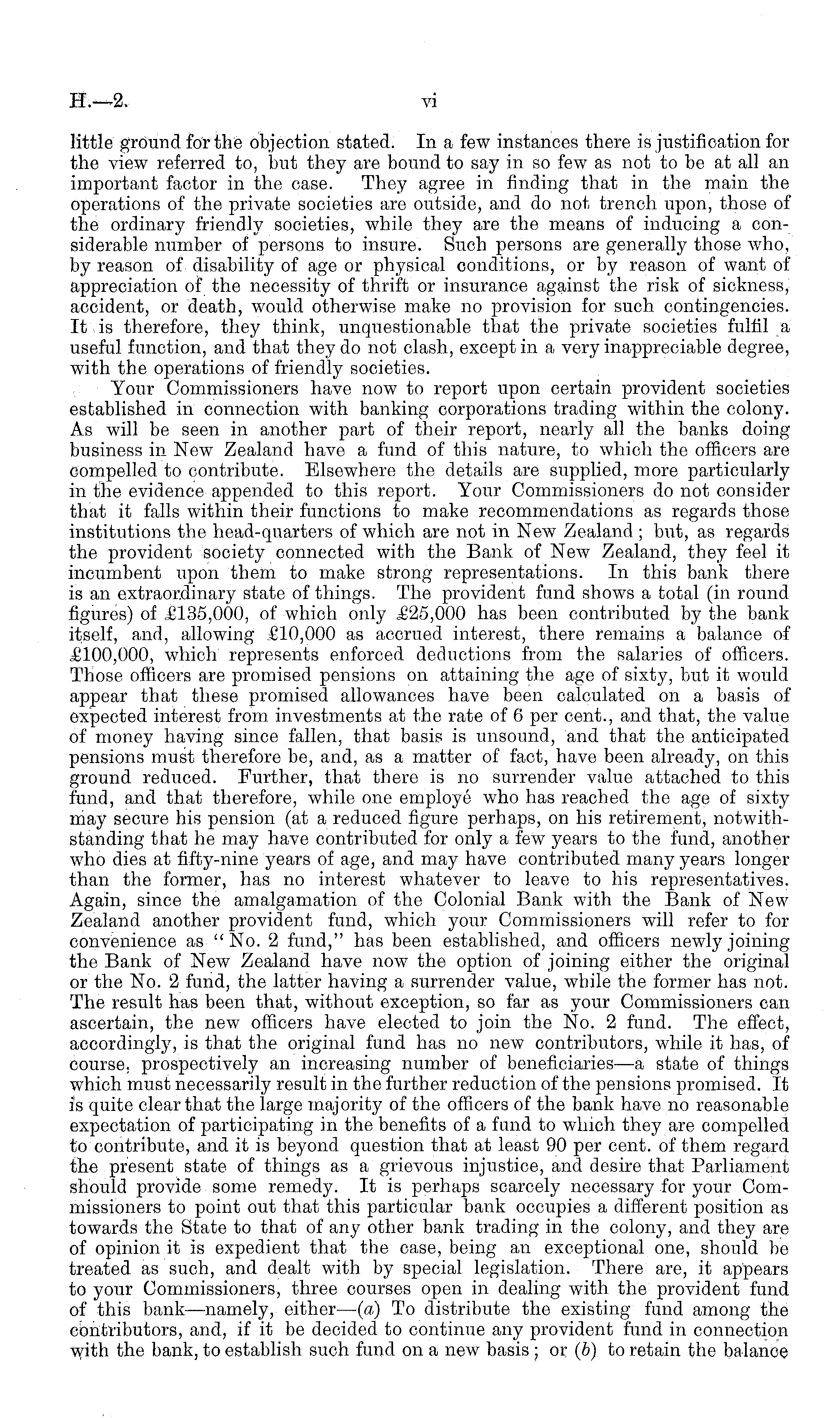 little ground for the objection stated. In a few instances there is justification for the view referred to, but they are bound to say in so few as not to be at all an important factor in the case. They agree in finding that in the main the operations of the private societies are outside, and do not trench upon, those of the ordinary friendly societies, while they are the means of inducing a considerable number of persons to insure. Such persons are generally those who, by reason of disability of age or physical conditions, or by reason of want of appreciation of the necessity of thrift or insurance against the risk of sickness, accident, or death, would otherwise make no provision for such contingencies. It is therefore, they think, unquestionable that the private societies fulfil a useful function, and that they do not clash, except in a very inappreciable degree, with the operations of friendly societies. Your Commissioners have now to report upon certain provident societies established in connection with banking corporations trading within the colony. As will be seen in another part of their report, nearly all the banks doing business in New Zealand have a fund of this nature, to which the officers are compelled to contribute. Elsewhere the details are supplied, more particularly in the evidence appended to this report. Your Commissioners do not consider that it falls within their functions to make recommendations as regards those institutions the head-quarters of which are not in New Zealand ; but, as regards the provident society connected with the Bank of New Zealand, they feel it incumbent upon them to make strong representations. In this bank there is an extraordinary state of things. The provident fund shows a total (in round figures) of £135,000, of which only £25,000 has been contributed by the bank itself, and, allowing £10,000 as accrued interest, there remains a balance of £100,000, which represents enforced deductions from the salaries of officers. Those officers are promised pensions on attaining the age of sixty, but it would appear that these promised allowances have been calculated on a basis of expected interest from investments at the rate of 6 per cent., and that, the value of money having since fallen, that basis is unsound, and that the anticipated pensions must therefore be, and, as a matter of fact, have been already, on this ground reduced. Further, that there is no surrender value attached to this fund, and that therefore, while one employe who has reached the age of sixty may secure his pension (at a reduced figure perhaps, on his retirement, notwithstanding that he may have contributed for only a few years to the fund, another who dies at fifty-nine years of age, and may have contributed many years longer than the former, has no interest whatever to leave to his representatives. Again, since the amalgamation of the Colonial Bank with the Bank of New Zealand another provident fund, which your Commissioners will refer to for convenience as "No. 2 fund," has been established, and officers newly joining the Bank of New Zealand have now the option of joining either the original or the No. 2 fund, the latter having a surrender value, while the former has not. The result has been that, without exception, so far as your Commissioners can ascertain, the new officers have elected to join the No. 2 fund. The effect, accordingly, is that the original fund has no new contributors, while it has, of course, prospectively an increasing number of beneficiaries—a state of things which must necessarily result in the further reduction of the pensions promised. It is quite clear that the large majority of the officers of the bank have no reasonable expectation of participating in the benefits of a fund to which they are compelled to contribute, and it is beyond question that at least 90 per cent, of them regard the present state of things as a grievous injustice, and desire that Parliament should provide some remedy. It is perhaps scarcely necessary for your Commissioners to point out that this particular bank occupies a different position as towards the State to that of any other bank trading in the colony, and they are of opinion it is expedient that the case, being an exceptional one, should be treated as such, and dealt with by special legislation. There are, it appears to your Commissioners, three courses open in dealing with the provident fund of this bank —namely, either — (a) To distribute the existing fund among the contributors, and, if it be decided to continue any provident fund in connection with the bank, to establish such fund on a new basis ; or (b) to retain the balance