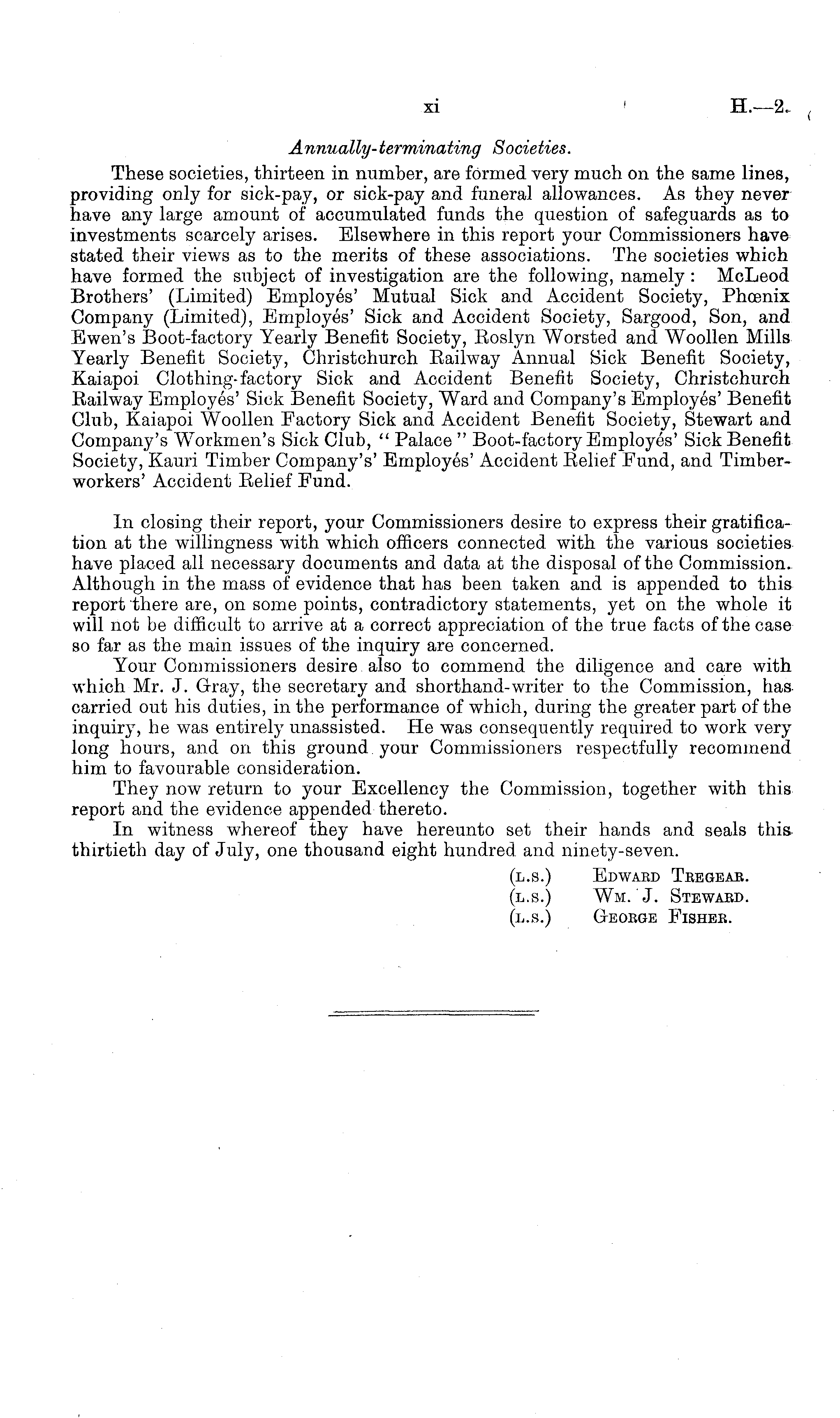 Annually-terminating Societies. These societies, thirteen in number, are formed very much on the same lines, providing only for sick-pay, or sick-pay and funeral allowances. As they never have any large amount of accumulated funds the question of safeguards as to investments scarcely arises. Elsewhere in this report your Commissioners have stated their views as to the merits of these associations. The societies which have formed the subject of investigation are the following, namely: McLeod Brothers' (Limited) Employes' Mutual Sick and Accident Society, Phoenix Company (Limited), Employes' Sick and Accident Society, Sargood, Son, and Ewen's Boot-factory Yearly Benefit Society, Eoslyn Worsted and Woollen Mills Yearly Benefit Society, Christchurch Eailway Annual Sick Benefit Society, Kaiapoi Clothing-factory Sick and Accident Benefit Society, Christchurch Eailway Employes' Sick Benefit Society, Ward and Company's Employes' Benefit Club, Kaiapoi Woollen Factory Sick and Accident Benefit Society, Stewart and Company's Workmen's Sick Club, " Palace " Boot-factory Employes' Sick Benefit Society, Kauri Timber Company's' Employes' Accident Belief Fund, and Timberworkers' Accident Belief Fund. In closing their report, your Commissioners desire to express their gratification at the willingness with which officers connected with the various societies have placed all necessary documents and data at the disposal of the Commission. Although in the mass of evidence that has been taken and is appended to this report there are, on some points, contradictory statements, yet on the whole it will not be difficult to arrive at a correct appreciation of the true facts of the case so far as the main issues of the inquiry are concerned. Your Commissioners desire also to commend the diligence and care with which Mr. J. Gray, the secretary and shorthand-writer to the Commission, has carried out his duties, in the performance of which, during the greater part of the inquiry, he was entirely unassisted. He was consequently required to work very long hours, and on this ground your Commissioners respectfully recommend him to favourable consideration. They now return to your Excellency the Commission, together with this report and the evidence appended thereto. In witness whereof they have hereunto set their hands and seals this thirtieth day of July, one thousand eight hundred and ninety-seven. (1.5.) Edward Tregear. (1.5.) Wm. J. Steward, (1.5.) George Fisher.