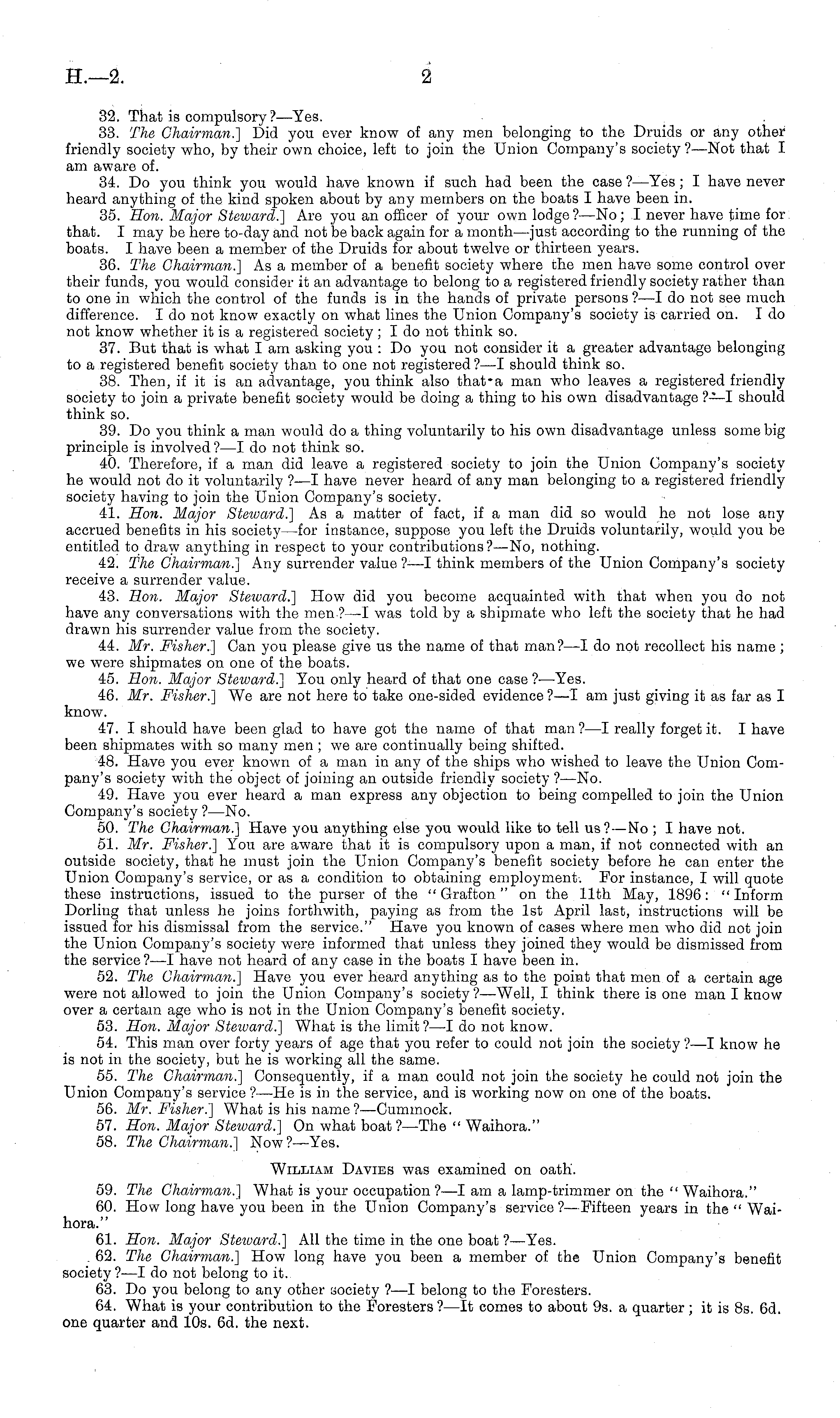32. That is compulsory ? —Yes. 33. The Chairman.] Did you ever know of any men belonging to the Druids or any other friendly society who, by their own choice, left to join the Union Company's society ?—Not that I am aware of. 34. Do you think you would have known if such had been the case ? —Yes; I have never heard anything of the kind spoken about by any members on the boats I have been in. 35. Hon. Major Steward.] Are you an officer of your own lodge ?—No ; I never have time for that. I may be here to-day and not be back again for a month —just according to the running of the boats. I have been a member of the Druids for about twelve or thirteen years. 36. The Chairman.] As a member of a benefit society where the men have some control over their funds, you would consider it an advantage to belong to a registered friendly society rather than to one in which the control of the funds is in the hands of private persons ?—I do not see much difference. Ido not know exactly on what lines the Union Company's society is carried on. Ido not know whether it is a registered society ; I do not think so. 37. But that is what I am asking you : Do you not consider it a greater advantage belonging to a registered benefit society than to one not registered?—l should think so. 38. Then, if it is an advantage, you think also that*a man who leaves a registered friendly society to join a private benefit society would be doing a thing to his own disadvantage ?—I should think so. 39. Do you think a man would do a thing voluntarily to his own disadvantage unless some big principle is involved ?—I do not think so. 40. Therefore, if a man did leave a registered society to join the Union Company's society he would not do it voluntarily ?—I have never heard of any man belonging to a registered friendly society having to join the Union Company's society. 41. Hon. Major Steward.] As a matter of fact, if a man did so would he not lose any accrued benefits in his society—for instance, suppose you left the Druids voluntarily, would you be entitled to draw anything in respect to your contributions ?—No, nothing. 42. The Chairman.] Any surrender value ?—I think members of the Union Company's society receive a surrender value. 43. Hon. Major Steward.] How did you become acquainted with that when you do not have any conversations with the men ? —I was told by a shipmate who left the society that he had drawn his surrender value from the society. 44. Mr. Fisher.] Can you please give us the name of that man?—l do not recollect his name ; we were shipmates on one of the boats. 45. Hon. Major Steioard.] You only heard of that one case ?—Yes. 46. Mr. Fisher.] We are not here to take one-sided evidence?—l am just giving it as far as I know. 47. I should have been glad to have got the name of that man? —I really forget it. I have been shipmates with so many men ; we are continually being shifted. 48. Have you ever known of a man in any of the ships who wished to leave the Union Company's society with the object of joining an outside friendly society ?—No. 49. Have you ever heard a man express any objection to being compelled to join the Union Company's society ?—No. 50. The Chairman.] Have you anything else you would like to tell us? —No ; I have not. 51. Mr. Fisher.] You are aware that it is compulsory upon a man, if not connected with an outside society, that he must join the Union Company's benefit society before he can enter the Union Company's service, or as a condition to obtaining employment. For instance, I will quote these instructions, issued to the purser of the " Grafton " on the 11th May, 1896: " Inform Dorling that unless he joins forthwith, paying as from the Ist April last, instructions will be issued for his dismissal from the service." Have you known of cases where men who did not join the Union Company's society were informed that unless they joined they would be dismissed from the service ?—I have not heard of any case in the boats I have been in. 52. The Chairman.] Have you ever heard anything as to the point that men of a certain age were not allowed to join the Union Company's society? —Well, I think there is one man I know over a certain age who is not in the Union Company's benefit society. 53. Hon. Major Steioard.] What is the limit ? —I do not know. 54. This man over forty years of age that you refer to could not join the society ?—I know he is not in the society, but he is working all the same. 55. The Chairman.] Consequently, if a man could not join the society he could not join the Union Company's service ?—He is in the service, and is working now on one of the boats. 56. Mr. Fisher.] What is his name ?—Cummock. 57. Hon. Major Steward.] On what boat ?—The " Waihora." 58. The Chairman.] Now? —Yes. William Davies was examined on oath. 59. The Chairman.] What is your occupation ?—I am a lamp-trimmer on the " Waihora." 60. How long have you been in the Union Company's service ?—Fifteen years in the " Waihora." 61. Hon. Major Steward.] All the time in the one boat ?—Yes. . 62. The Chairman.] How long have you been a member of the Union Company's benefit society? —I do not belong to it. 63. Do you belong to any other society ?—I belong to the Foresters. 64. What is your contribution to the Foresters ?—lt comes to about 9s. a quarter ; it is Bs. 6d. one quarter and 10s. 6d. the next.