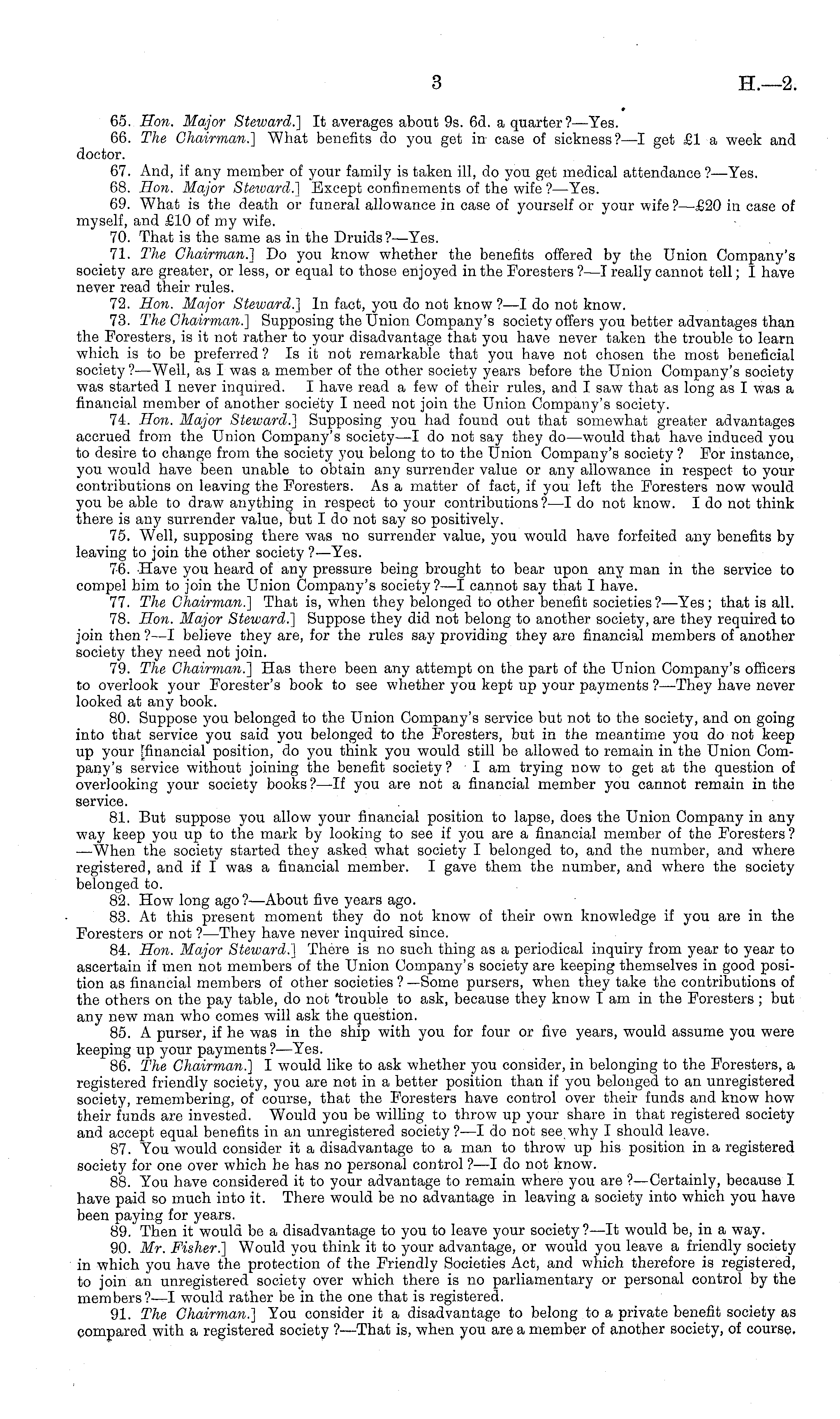 65. Hon. Major Steward.] It averages about 9s. 6d. a quarter?— Yes. 66. The Chairman.] What benefits do you get in case of sickness?—l get £1 a week and doctor. 67. And, if any member of your family is taken ill, do you get medical attendance ?—Yes. 68. Hon. Major Steioard.] Except confinements of the wife ? —Yes. 69. What is the death or funeral allowance in case of yourself or your wife?—£2o in case of myself, and £10 of my wife. 70. That is the same as in the Druids ?—Yes. 71. The Chairman.] Do you know whether the benefits offered by the Union Company's society are greater, or less, or equal to those enjoyed in the Foresters ?—I really cannot tell; I have never read their rules. 72. Hon. Major Steward.] In fact, you do not know ?—I do not know. 73. The Chairman.] Supposing the Union Company's society offers you better advantages than the Foresters, is it not rather to your disadvantage that you have never taken the trouble to learn which is to be preferred ? Is it not remarkable that you have not chosen the most beneficial society ?—Well, as I was a member of the other society years before the Union Company's society was started I never inquired. I have read a few of their rules, and I saw that as long as I was a financial member of another society I need not join the Union Company's society. 74. Hon. Major Steward.] Supposing you had found out that somewhat greater advantages accrued from the Union Company's society—l do not say they do —would that have induced you to desire to change from the society you belong to to the Union Company's society ? For instance, you would have been unable to obtain any surrender value or any allowance in respect to your contributions on leaving the Foresters. As a matter of fact, if you left the Foresters now would you be able to draw anything in respect to your contributions?—l do not know. Ido not think there is any surrender value, but I do not say so positively. 75. Well, supposing there was no surrender value, you would have forfeited any benefits by leaving to join the other society ? —Yes. 76. Have you heard of any pressure being brought to bear upon any man in the service to compel him to join the Union Company's society ?—I cannot say that I have. 77. The Chairman.] That is, when they belonged to other benefit societies?— Yes; that is all. 78. Hon. Major Steward.] Suppose they did not belong to another society, are they required to join then ? —I believe they are, for the rules say providing they are financial members of another society they need not join. 79. The Chairman.] Has there been any attempt on the part of the Union Company's officers to overlook your Forester's book to see whether you kept up your payments ? —They have never looked at any book. 80. Suppose you belonged to the Union Company's service but not to the society, and on going into that service you said you belonged to the Foresters, but in the meantime you do not keep up your [financial position, do you think you would still be allowed to remain in the Union Company's service without joining the benefit society? lam trying now to get at the question of overlooking your society books ?—lf you are not a financial member you cannot remain in the service. 81. But suppose you allow your financial position to lapse, does the Union Company in any way keep you up to the mark by looking to see if you are a financial member of the Foresters ? —When the society started they asked what society I belonged to, and the number, and where registered, and if I was a financial member. I gave them the number, and where the society belonged to. 82. How long ago ?—About five years ago. 83. At this present moment they do not know of their own knowledge if you are in the Foresters or not ? —They have never inquired since. 84. Hon. Major Steward.] There is no such thing as a periodical inquiry from year to year to ascertain if men not members of the Union Company's society are keeping themselves in good position as financial members of other societies ? —Some pursers, when they take the contributions of the others on the pay table, do not 'trouble to ask, because they know I am in the Foresters ; but any new man who comes will ask the question. 85. A purser, if he was in the ship with you for four or five years, would assume you were keeping up your payments ?—Yes. 86. The Chairman.] I would like to ask whether you consider, in belonging to the Foresters, a registered friendly society, you are not in a better position than if you belonged to an unregistered society, remembering, of course, that the Foresters have control over their funds and know how their funds are invested. Would you be willing to throw up your share in that registered society and accept equal benefits in an unregistered society ? —I do not see why I should leave. 87. You would consider it a disadvantage to a man to throw up his position in a registered society for one over which he has no personal control ? —I do not know. 88. You have considered it to your advantage to remain where you are ? —Certainly, because I have paid so much into it. There would be no advantage in leaving a society into which you have been paying for years. 89. Then it would be a disadvantage to you to leave your society ?—lt would be, in a way. 90. Mr. Fisher.] Would you think it to your advantage, or would you leave a friendly society in which you have the protection of the Friendly Societies Act, and which therefore is registered, to join an unregistered society over which there is no parliamentary or personal control by the members? —I would rather be in the one that is registered. 91. The Chairman.] You consider it a disadvantage to belong to a private benefit society as compared with a registered society ?—That is, when you are a member of another society, of course.