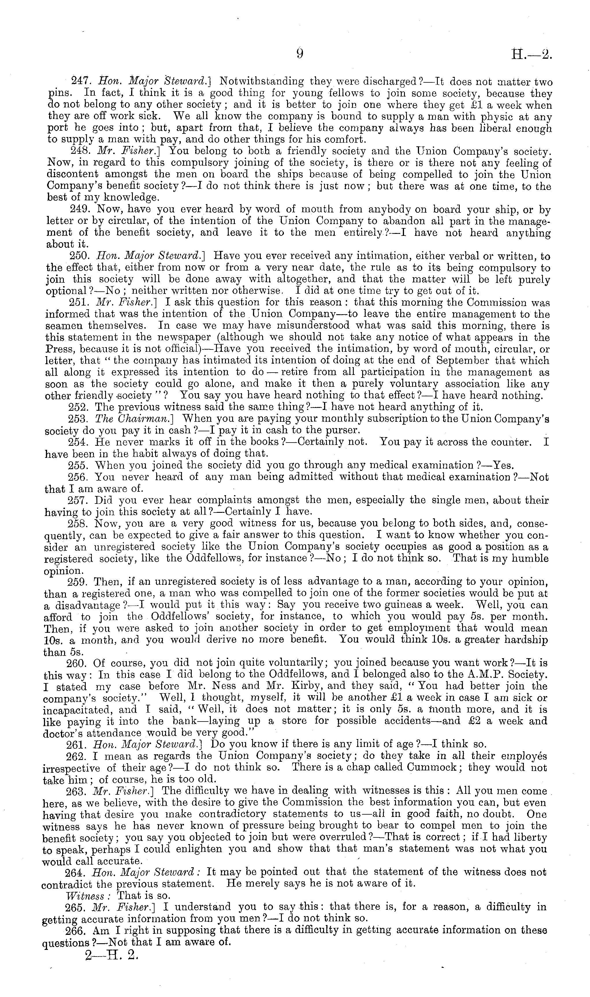 247. Hon. Major Steward.] Notwithstanding they were discharged ?—lt does not matter two pins. In fact, I think it is a good thing for young fellows to join some society, because they do not belong to any other society ; and it is better to join one where they get £1 a week when they are off work sick. We all know the company is bound to supply a man with physic at any port he goes into ; but, apart from that, I believe the company always has been liberal enough to supply a man with pay, and do other things for his comfort. 248. Mr. Fisher.] You belong to both a friendly society and the Union Company's society. Now, in regard to this compulsory joining of the society, is there or is there not any feeling of discontent amongst the men on board the ships because of being compelled to join the Union Company's benefit society? —I do not think there is just now ; but there was at one time, to the best of my knowledge. 249. Now, have you ever heard by word of mouth from anybody on board your ship, or by letter or by circular, of the intention of the Union Company to abandon all part in the management of the benefit society, and leave it to the men entirely?—l have not heard anything about it. 250. Hon. Major Steward.] Have you ever received any intimation, either verbal or written, to the effect that, either from now or from a very near date, the rule as to its being compulsory to join this society will be done away with altogether, and that the matter will be left purely optional ?—No ; neither written nor otherwise, I did at one time try to get out of it. 251. Mr. Fisher.] I ask this question for this reason : that this morning the Commission was informed that was the intention of the Union Company—to leave the entire management to the seamen themselves. In case we may have misunderstood what was said this morning, there is this statement in the newspaper (although we should not take any notice of what appears in the Press, because it is not official) —Have you received the intimation, by word of mouth, circular, or letter, that " the company has intimated its intention of doing at the end of September that which all along it expressed its intention to do — retire from all participation in the management as soon as the society could go alone, and make it then a purely voluntary association like any other friendly -society " ? You say you have heard nothing to that effect ?—I have heard nothing. 252. The previous witness said the same thing? —I have not heard anything of it. 253. The Chairman.] When you are paying your monthly subscription to the Union Company's society do you pay it in cash ?—I pay it in cash to the purser. 254. Ho never marks it off in the books?— Certainly not. You pay it across the counter. I have been in the habit always of doing that. 255. When you joined the society did you go through any medical examination ?—Yes. 256. You never heard of any man being admitted without that medical examination ? —Not that I am aware of. 257. Did you ever hear complaints amongst the men, especially the single men, about their having to join this society at all?— Certainly I have. 258. Now, you are a very good witness for us, because you belong to both sides, and, consequently, can be expected to give a fair answer to this question. I want to know whether you consider an unregistered society like the Union Company's society occupies as good a position as a registered society, like the Oddfellows, for instance ? —No ;I do not think so. That is my humble opinion. 259. Then, if an unregistered society is of less advantage to a man, according to your opinion, than a registered one, a man who was compelled to join one of the former societies would be put at a disadvantage ?—I would put it this way : Say you receive two guineas a week. Well, you can afford to join the Oddfellows' society, for instance, to which you would pay ss. per month. Then, if you were asked to join another society in order to get employment that would mean 10s. a month, and you would derive no more benefit. You would think 10s. a greater hardship than ss. 260. Of course, you did not join quite voluntarily; you joined because you want work? —It is this way: In this case I did belong to the Oddfellows, and I belonged also to the A.M.P. Society. I stated my case before Mr. Ness and Mr. Kirby, and they said, " You had better join the company's society." Well, I thought, myself, it will be another £1 a week in case lam sick or incapacitated, and I said, "Well, it does not matter; it is only ss. a hionth more, and it is like paying it into the bank—laying up a store for possible accidents—and £2 a week and doctor's attendance would be very good." 261. Hon. Major Steward.] Do you know if there is any limit of age ?—I think so. 262. I mean as regards the Union Company's society; do they take in all their employes irrespective of their age ? —I do not think so. There is a chap called Cummock; they would not take him ; of course, he is too old. 263. Mr. Fisher.] The difficulty we have in dealing with witnesses is this : All you men come here, as we believe, with the desire to give the Commission the best information you can, but even having that desire you make contradictory statements to us—all in good faith, no doubt. One witness says he has never known of pressure being brought to bear to compel men to join the benefit society; you say you objected to join but were overruled ?—That is correct; if I had liberty to speak, perhaps I could enlighten you and show that that man's statement was not what you would call accurate. 264. Hon. Major Steward : It may be pointed out that the statement of the witness does not contradict the previous statement. He merely says he is not aware of it. Witness : That is so. 265. Mr. Fisher.] I understand you to say this: that there is, for a reason, a difficulty in getting accurate information from you men?—l do not think so. 266. Am I right in supp