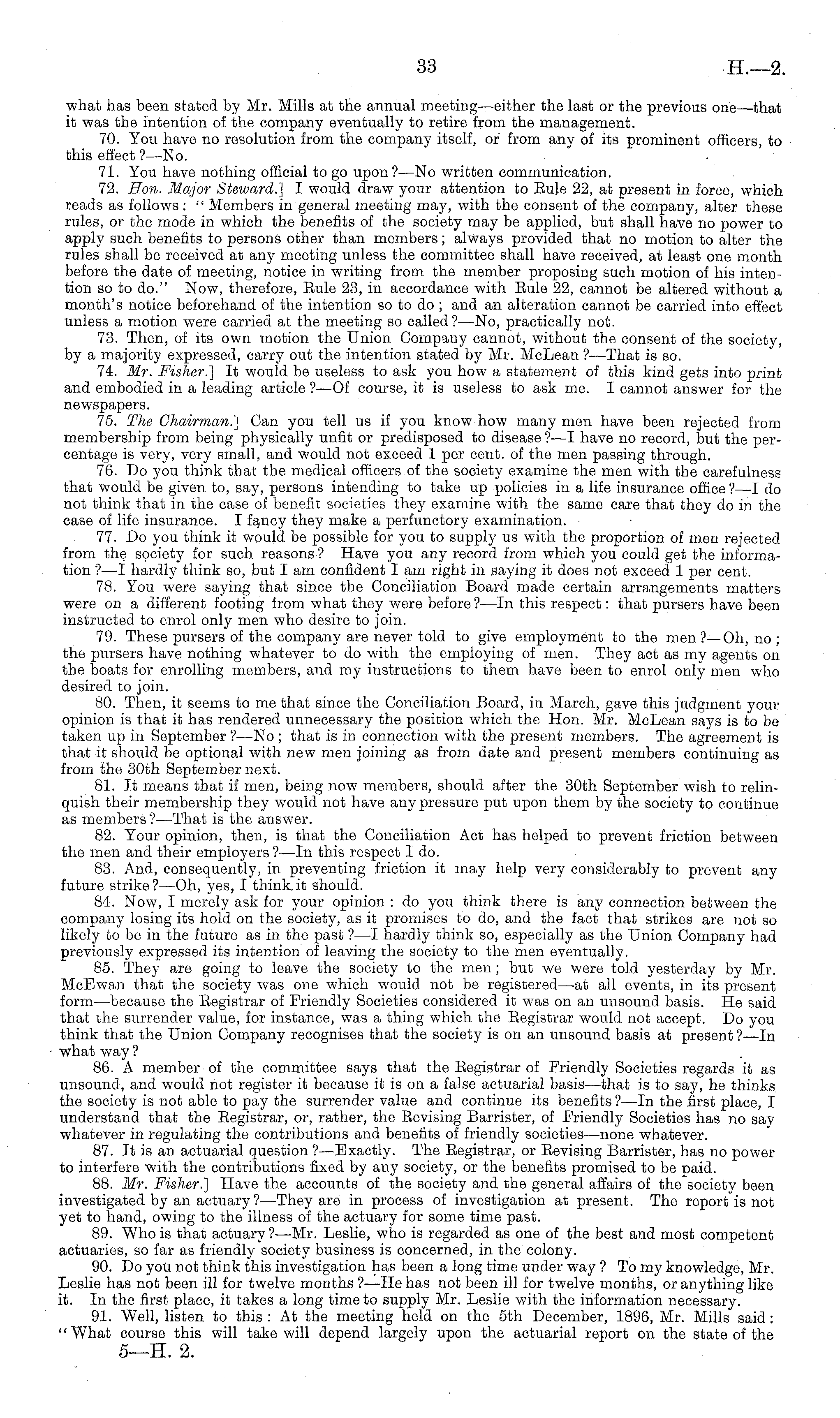 what has been stated by Mr. Mills at the annual meeting—either the last or the previous one—that it was the intention of the company eventually to retire from the management. 70. You have no resolution from the company itself, or from any of its prominent officers, to this effect ?—No. 71. You have nothing official to go upon?—No written communication. 72. Hon. Major Steward.] I would draw your attention to Eule 22, at present in force, which reads as follows: " Members in general meeting may, with the consent of the company, alter these rules, or the mode in which the benefits of the society may be applied, but shall have no power to apply such benefits to persons other than members; always provided that no motion to alter the rules shall be received at any meeting unless the committee shall have received, at least one month before the date of meeting, notice in writing from the member proposing such motion of his intention so to do." Now, therefore, Eule 23, in accordance with Eule 22, cannot be altered without a month's notice beforehand of the intention so to do ; and an alteration cannot be carried into effect unless a motion were carried at the meeting so called?—No, practically not. 73. Then, of its own motion the Union Company cannot, without the consent of the society, by a majority expressed, carry out the intention stated by Mr. McLean ?—That is so. 74. Mr. Fisher.] It would be useless to ask you how a statement of this kind gets into print and embodied in a leading article ? —Of course, it is useless to ask me. I cannot answer for the newspapers. 75. The Chairman.] Can you tell us if you know how many men have been rejected from membership from being physically unfit or predisposed to disease ?—I have no record, but the percentage is very, very small, and would not exceed 1 per cent, of the men passing through. 76. Do you think that the medical officers of the society examine the men with the carefulness that would be given to, say, persons intending to take up policies in a life insurance office ?—I do not think that in the case of benefit societies they examine with the same care that they do in the case of life insurance. I fancy they make a perfunctory examination. 77. Do you think it would, be possible for you to supply us with the proportion of men rejected from the society for such reasons ? Have you any record from which you could get the information ? —I hardly think so, but lam confident lam right in saying it does not exceed 1 per cent. 78. You were saying that since the Conciliation Board made certain arrangements matters were on a different footing from what they were before ?—ln this respect: that pursers have been instructed to enrol only men who desire to join. 79. These pursers of the company are never told to give employment to the men? —Oh, no ; the pursers have nothing whatever to do with the employing of men. They act as my agents on the boats for enrolling members, and my instructions to them have been to enrol only men who desired to join. 80. Then, it seems to me that since the Conciliation Board, in March, gave this judgment your opinion is that it has rendered unnecessary the position which the Hon. Mr. McLean says is to be taken up in September ?—No ; that is in connection with the present members. The agreement is that it should be optional with new men joining as from date and present members continuing as from the 30th September next. 81. It means that if men, being now members, should after the 30th September wish to relinquish their membership they would not have any pressure put upon them by the society to continue as members?— That is the answer. 82. Your opinion, then, is that the Conciliation Act has helped to prevent friction between the men and their employers ?—ln this respect I do. 83. And, consequently, in preventing friction it may help very considerably to prevent any future strike? —Oh, yes, I think.it should. 84. Now, I merely ask for your opinion : do you think there is any connection between the company losing its hold on the society, as it promises to do, and the fact that strikes are not so likely to be in the future as in the past ? —I hardly think so, especially as the Union Company had previously expressed its intention of leaving the society to the men eventually. 85. They are going to leave the society to the men; but we were told yesterday by Mr. McEwan that the society was one which would not be registered—at all events, in its present form—because the Eegistrar of Friendly Societies considered it was on an unsound basis. He said that the surrender value, for instance, was a thing which the Eegistrar would not accept. Do you think that the Union. Company recognises that the society is on an unsound basis at present ?—ln what way ? 86. A member of the committee says that the Eegistrar of Friendly Societies regards it as unsound, and would not register it because it is on a false actuarial basis—that is to say, he thinks the society is not able to pay the surrender value and continue its benefits ?—ln the first place, I understand that the Eegistrar, or, rather, the Eevising Barrister, of Friendly Societies has no say whatever in regulating the contributions and benefits of friendly societies—none whatever. 87. It is an actuarial question ?—Exactly. The Eegistrar, or Eevising Barrister, has no power to interfere with the contributions fixed by any society, or the benefits promised to be paid. 88. Mr. Fisher.] Have the accounts of the society and the general affairs of the society been investigated by an actuary ? —They are in process of investigation at present. The report is not yet to hand, owing to the illness of the actuary for some time past. 89. Who is that actuary ?—Mr. Leslie, who is regarded as one of the best and most competent actuaries, so far as friendly society business is concerned, in the colony. 90. Do you not think this investigation has been a long time