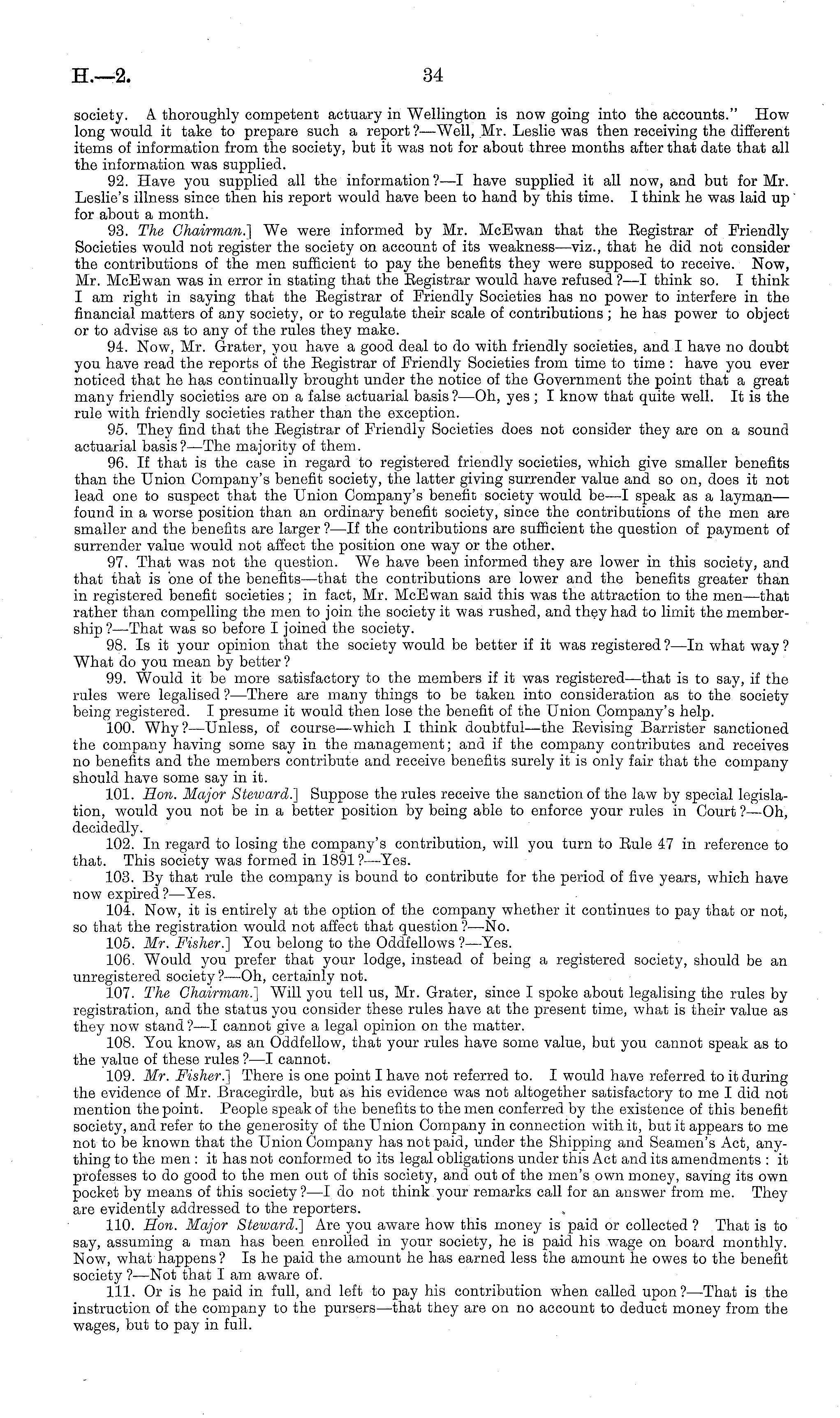 society. A thoroughly competent actuary in Wellington is now going into the accounts." How long would it take to prepare such a report ?—Well, Mr. Leslie was then receiving the different items of information from the society, but it was not for about three months after that date that all the information was supplied. 92. Have you supplied all the information?—l have supplied it all now, and but for Mr. Leslie's illness since then his report would have been to hand by this time. I think he was laid up for about a month. 93. The Chairman.] We were informed by Mr. McEwan that the Eegistrar of Friendly Societies would not register the society on account of its weakness —viz., that he did not consider the contributions of the men sufficient to pay the benefits they were supposed to receive. Now, Mr. McEwan was in error in stating that the Eegistrar would have refused ?—I think so. I think I am right in saying that the Eegistrar of Friendly Societies has no power to interfere in the financial matters of any society, or to regulate their scale of contributions ; he has power to object or to advise as to any of the rules they make. 94. Now, Mr. Grater, you have a good deal to do with friendly societies, and I have no doubt you have read the reports of the Eegistrar of Friendly Societies from time to time : have you ever noticed that he has continually brought under the notice of the Government the point that a great many friendly societies are on a false actuarial basis ? —Oh, yes ; I know that quite well. It is the rule with friendly societies rather than the exception. 95. They find that the Eegistrar of Friendly Societies does not consider they are on a sound actuarial basis?— The majority of them. 96. If that is the case in regard to registered friendly societies, which give smaller benefits than the Union Company's benefit society, the latter giving surrender value and. so on, does it not lead one to suspect that the Union Company's benefit society would be —I speak as a layman— found in a worse position than an ordinary benefit society, since the contributions of the men are smaller and the benefits are larger ?—lf the contributions are sufficient the question of payment of surrender value would not affect the position one way or the other. 97. That was not the question. We have been informed they are lower in this society, and that that is one of the benefits —that the contributions are lower and the benefits greater than in registered benefit societies ; in fact, Mr. McEwan said this was the attraction to the men—that rather than compelling the men to join the society it was rushed, and they had to limit the membership ?—That was so before I joined the society. 98. Is it your opinion that the society would be better if it was registered?—ln what way? What do you mean by better ? 99. Would it be more satisfactory to the members if it was registered—that is to say, if the rules were legalised ?—There are many things to be taken into consideration as to the society being registered. I presume it would then lose the benefit of the Union Company's help. 100. Why ?—Unless, of course—which I think doubtful—the Eevising Barrister sanctioned the company having some say in the management; and if the company contributes and receives no benefits and the members contribute and receive benefits surely it is only fair that the company should have some say in it. 101. Hon. Major Steward.] Suppose the rules receive the sanction of the law by special legislation, would you not be in a better position by being able to enforce your rules in Court ?—Oh, decidedly. 102. In regard to losing the company's contribution, will you turn to Eule 47 in reference to that. This society was formed in 1891 ? —Yes. 103. By that rule the company is bound to contribute for the period of five years, which have now expired ?—Yes. 104. Now, it is entirely at the option of the company whether it continues to pay that or not, so that the registration would not affect that question ?—No. 105. Mr. Fisher.] You belong to the Oddfellows ?—Yes. 106. Would you prefer that your lodge, instead of being a registered society, should be an unregistered society?—Oh, certainly not. 107. The Chairman.] Will you tell us, Mr. Grater, since I spoke about legalising the rules by registration, and the status you consider these rules have at the present time, what is their value as they now stand ?—I cannot give a legal opinion on the matter. 108. You know, as an Oddfellow, that your rules have some value, but you cannot speak as to the value of these rules ? —I cannot. 109. Mr. Fisher.] There is one point I have not referred to. I would have referred to it during the evidence of Mr. Bracegirdle, but as his evidence was not altogether satisfactory to me I did not mention the point. People speak of the benefits to the men conferred by the existence of this benefit society, and refer to the generosity of the Union Company in connection with it, but it appears to me not to be known that the Union Company has not paid, under the Shipping and Seamen's Act, anything to the men : it has not conformed to its legal obligations under this Act and its amendments : it professes to do good to the men out of this society, and out of the men's own money, saving its own pocket by means of this society ?—I do not think your remarks call for an answer from me. They are evidently addressed to the reporters. 110. Hon. Major Steward.] Are you aware how this money is paid or collected ? That is to say, assuming a man has been enrolled in your society, he is paid his wage on board monthly. Now, what happens? Is he paid the amount he has earned less the amount he owes to the benefit society ?—Not that I am aware of. 111. Or is he paid in full, and left to pay his contribution when called upon?— That is the instruction of the company to the pursers —that they are on no account to deduct money from the wages, but t
