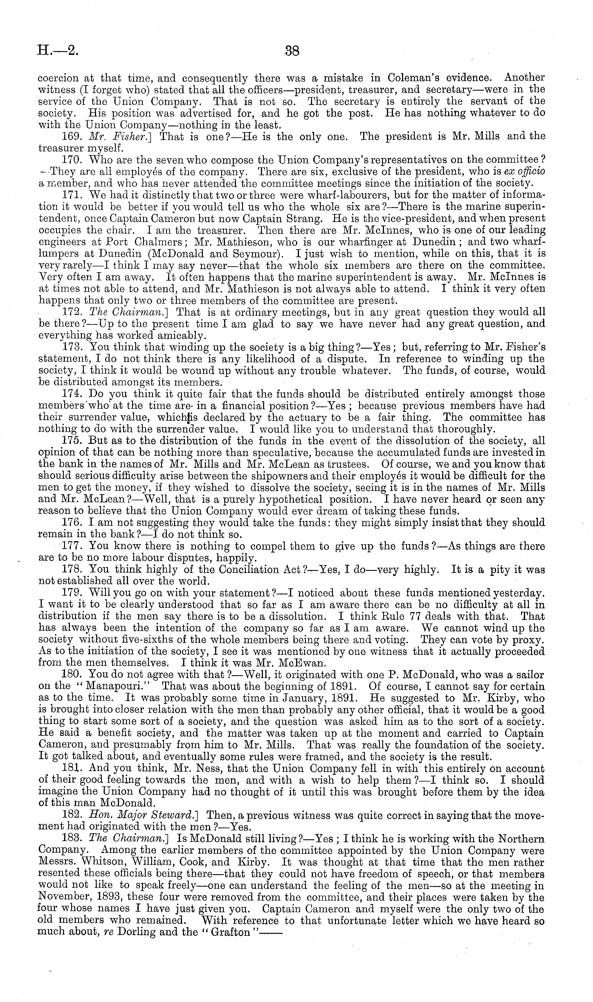 coercion at that time, and consequently there was a mistake in Coleman's evidence. Another witness (I forget who) stated that all the officers—president, treasurer, and secretary—were in the service of the Union Company. That is not so. The secretary is entirely the servant of the society. His position was advertised for, and he got the post. He has nothing whatever to do with the Union Company—nothing in the least. 169. Mr. Fisher.] That is one? —He is the only one. The president is Mr. Mills and the treasurer myself. 170. Who are the seven who compose the Union Company's representatives on the committee? -They are all employes of the company. There are six, exclusive of the president, who is ex officio a member, and who has never attended the committee meetings since the initiation of the society. 171. We had it distinctly that two or three were wharf-labourers, but for the matter of information it would be better if you would tell us who the whole six are ? —There is the marine superintendent, once Captain Cameron but now Captain Strang. He is the vice-president, and when present occupies the chair. lam the treasurer. Then there are Mr. Mclnnes, who is one of our leading engineers at Port Chalmers; Mr. Mathieson, who is our wharfinger at Dunedin ; and two wharflumpers at Dunedin (McDonald and Seymour). I just wish to mention, while on this, that it is very rarely—l think I may say never —that the whole six members are there on the committee. Very often lam away. It often happens that the marine superintendent is away. Mr. Mclnnes is at times not able to attend, and Mr. Mathieson is not always able to attend. I think it very often happens that only two or three members of the committee are present. 172. The Chairman.] That is at ordinary meetings, but in any great question they would all be there?—Up to the present time I am glad to say we have never had any great question, and everything has worked amicably. 173. You think that winding up the society is a big thing?— Yes ; but, referring to Mr. Fisher's statement, Ido not think there is any likelihood of a dispute. In reference to winding up the society, I think it would be wound up without any trouble whatever. The funds, of course, would be distributed amongst its members. 174. Do you think it quite fair that the funds should be distributed entirely amongst those members'who'at the time are- in a financial position?— Yes ; because previous members have had their surrender value, which|is declared by the actuary to be a fair thing. The committee has nothing to do with the surrender value. I would like you to understand that thoroughly. 175. But as to the distribution of the funds in the event of the dissolution of the society, all opinion of that can be nothing more than speculative, because the accumulated funds are invested in the bank in the names of Mr. Mills and Mr. McLean as trustees. Of course, we and you know that should serious difficulty arise between the shipowners and their employes it would be difficult for the men to get the money, if they wished to dissolve the society, seeing it is in the names of Mr. Mills and Mr. McLean?—Well, that is a purely hypothetical position. I have never heard or seen any reason to believe that the Union Company would ever dream of taking these funds. 176. I am not suggesting they would take the funds: they might simply insist that they should remain in the bank ?—I do not think so. 177. You know there is nothing to compel them to give up the funds?—As things are there are to be no more labour disputes, happily. 178. You think highly of the Conciliation Act ?—Yes, I do—very highly. It is a pity it was not established all over the world. 179. Will you go on with your statement?—l noticed about these funds mentioned yesterday. I want it to be clearly understood that so far as I am aware there can be no difficulty at all in distribution if the men say there is to be a dissolution. I think Eule 77 deals with that. That has always been the intention of the company so far as lam aware. We cannot wind up the society without five-sixths of the whole members being there and voting. They can vote by proxy. As to the initiation of the society, I see it was mentioned by one witness that it actually proceeded from the men themselves. I think it was Mr. McEwan. 180. You do not agree with that ?—Well, it originated with one P. McDonald, who was a sailor on the " Manapouri." That was about the beginning of 1891. Of course, I cannot say for certain as to the time. It was probably some time in January, 1891. He suggested to Mr. Kirby, who is brought into closer relation with the men than probably any other official, that it would be a good thing to start some sort of a society, and the question was asked him as to the sort of a society. He said a benefit society, and the matter was taken up at the moment and carried to Captain Cameron, and presumably from him to Mr. Mills. That was really the foundation of the society. It got talked about, and eventually some rules were framed, and the society is the result. 181. And you think, Mr. Ness, that the Union Company fell in with this entirely on account of their good feeling towards the men, and with a wish to help them ? —I think so. I should imagine the Union Company had no thought of it until this was brought before them by the idea of this man McDonald. 182. Hon. Major Steward.] Then, a previous witness was quite correct in saying that the movement had originated with the men ? —Yes. 183. The Chairman.] Is McDonald still living ?—Yes ; I think he is working with the Northern Company. Among the earlier members of the committee appointed by the Union Company were Messrs. Whitson, William, Cook, and Kirby. It was thought at that time that the men rather resented these officials being there—that they could not have freedom of speech, or that members would not like to speak freely—one can understand the feeling of the men