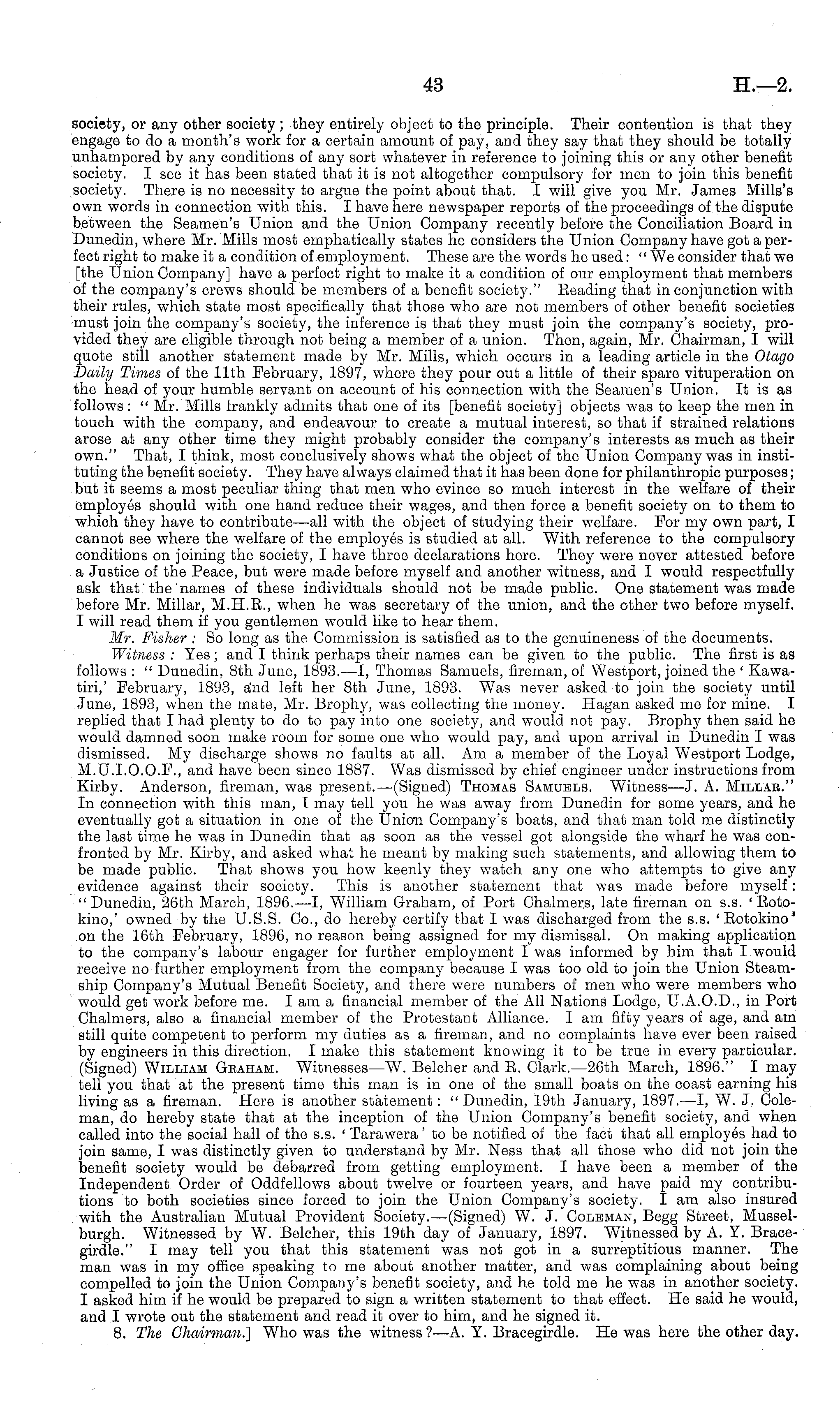 society, or any other society; they entirely object to the principle. Their contention is that they engage to do a month's work for a certain amount of pay, and they say that they should be totally unhampered by any conditions of any sort whatever in reference to joining this or any other benefit society. I see it has been stated that it is not altogether compulsory for men to join this benefit society. There is no necessity to argue the point about that. I will give you Mr. James Mills's own words in connection with this. I have here newspaper reports of the proceedings of the dispute between the Seamen's Union and the Union Company recently before the Conciliation Board in Dunedin, where Mr. Mills most emphatically states he considers the Union Company have got a perfect right to make it a condition of employment. These are the words he used: "We consider that we [the Union Company] have a perfect right to make it a condition of our employment that members of the company's crews should be members of a benefit society." Beading that in conjunction with their rules, which state most specifically that those who are not members of other benefit societies must join the company's society, the inference is that they must join the company's society, provided they are eligible through not being a member of a union. Then, again, Mr. Chairman, I will quote still another statement made by Mr. Mills, which occurs in a leading article in the Otago Daily Times of the 11th February, 1897, where they pour out a little of their spare vituperation on the head of your humble servant on account of his connection with the Seamen's Union. It is as follows: " Mr. Mills frankly admits that one of its [benefit society] objects was to keep the men in touch with the company, and endeavour to create a mutual interest, so that if strained relations arose at any other time they might probably consider the company's interests as much as their own." That, I think, most conclusively shows what the object of the Union Company was in instituting the benefit society. They have always claimed that it has been done for philanthropic purposes; but it seems a most peculiar thing that men who evince so much interest in the welfare of their employes should with one hand reduce their wages, and then force a benefit society on to them to which they have to contribute—all with the object of studying their welfare. For my own part, I cannot see where the welfare of the employes is studied at all. With reference to the compulsory conditions on joining the society, I have three declarations here. They were never attested before a Justice of the Peace, but were made before myself and another witness, and I would respectfully ask that'the'names of these individuals should not be m-ade public. One statement was made before Mr. Millar, M.H.E., when he was secretary of the union, and the other two before myself. I will read them if you gentlemen would like to hear them. Mr. Fisher : So long as the Commission is satisfied as to the genuineness of the documents. Witness : Yes; and I think perhaps their names can be given to the public. The first is as follows : " Dunedin, Bth June, 1893.—1, Thomas Samuels, fireman, of Westport, joined the ' Kawatiri,' February, 1893, and left her Bth June, 1893. Was never asked to join the society until June, 1893, when the mate, Mr. Brophy, was collecting the money. Hagan asked me for mine. I replied that I had plenty to do to pay into one society, and would not pay. Brophy then said he would damned soon make room for some one who would pay, and upon arrival in Dunedin I was dismissed. My discharge shows no faults at all. Am a member of the Loyal Westport Lodge, M.U.1.0.0.F., and have been since 1887. Was dismissed by chief engineer under instructions from Kirby. Anderson, fireman, was present. —(Signed) Thomas Samuels. Witness — J. A. Millab." In connection with this man, I may tell you he was away from Dunedin for some years, and he eventually got a situation in one of the Union Company's boats, and that man told me distinctly the last time he was in Dunedin that as soon as the vessel got alongside the wharf he was confronted by Mr. Kirby, and asked what he meant by making such statements, and allowing them to be made public. That shows you how keenly they watch any one who attempts to give any evidence against their society. This is another statement that was made before myself: "Dunedin, 26th March, 1896.—1, William Graham, of Port Chalmers, late fireman on s.s. ' Eotokino,' owned by the U.S.S. Co., do hereby certify that I was discharged from the s.s. ' Eotokino' on the 16th February, 1896, no reason being assigned for my dismissal. On making application to the company's labour engager for further employment I was informed by him that I would receive no further employment from the company because I was too old to join the Union Steamship Company's Mutual Benefit Society, and there were numbers of men who were members who would get work before me. lam a financial member of the All Nations Lodge, U.A.0.D., in Port Chalmers, also a financial member of the Protestant Alliance. I am fifty years of age, and am still quite competent to perform my duties as a fireman, and no complaints have ever been raised by engineers in this direction. I make this statement knowing it to be true in every particular. (Signed) William Gbaham. Witnesses—W. Belcher and E. Clark.—26th March, 1896." I may tell you that at the present time this man is in one of the small boats on the coast earning his living as a fireman. Here is another statement: " Dunedin, 19th January, 1897. —I, W. J. Coleman, do hereby state that at the inception of the Union Company's benefit society, and when called into the social hall of the s.s. ' Tarawera' to be notified of the fact that all employes had to join same, I was distinctly given to understand by Mr. Ness that all those who did not join the benefit society would be debarred f