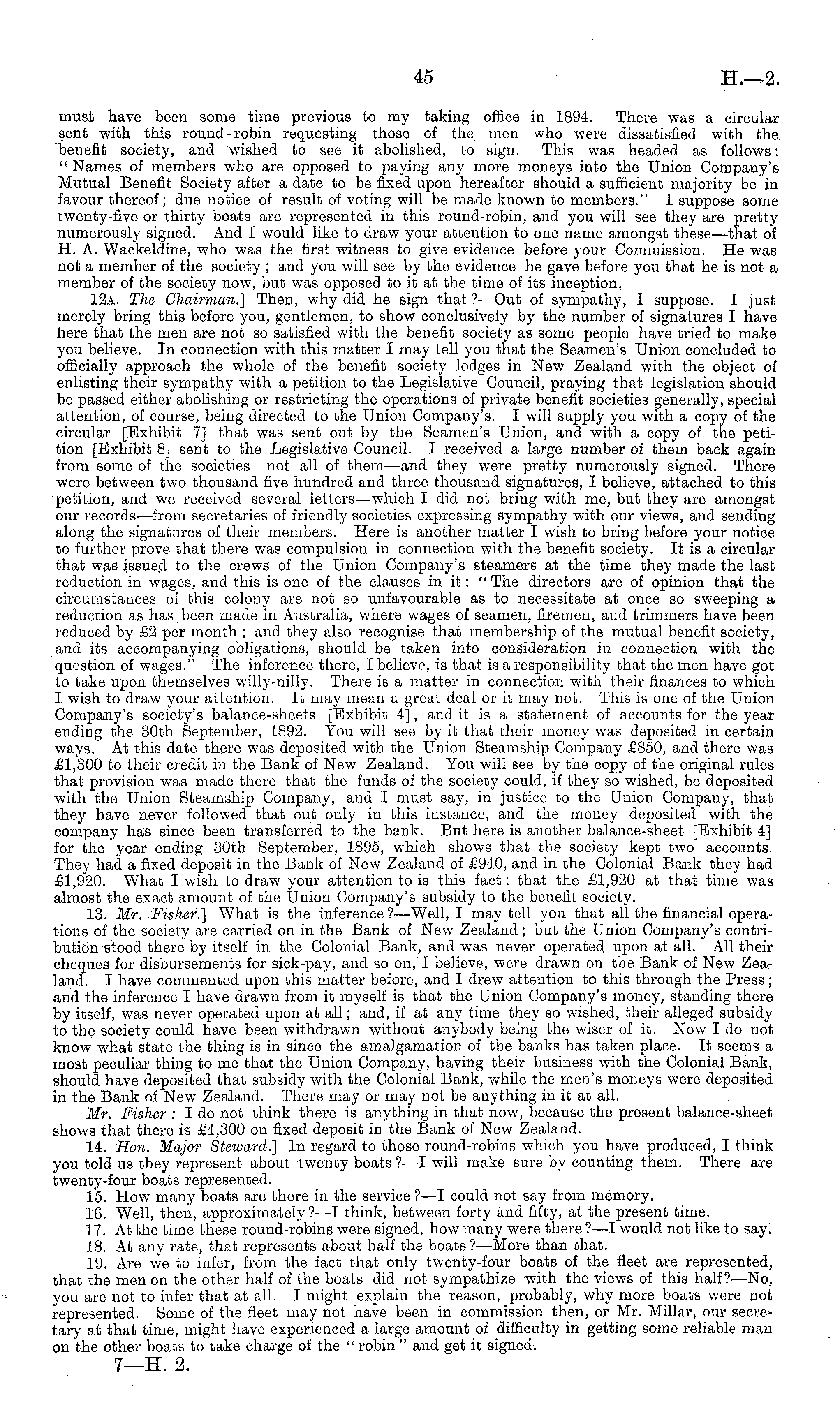 must have been some time previous to my taking office in 1894. There was a circular sent with this round-robin requesting those of the men who were dissatisfied with the benefit society, and wished to see it abolished, to sign. This was headed, as follows: " Names of members who are opposed to paying any more moneys into the Union Company's Mutual Benefit Society after a date to be fixed upon hereafter should a sufficient majority be in favour thereof; due notice of result of voting will be made known to members." I suppose some twenty-five or thirty boats are represented in this round-robin, and you will see they are pretty numerously signed. And I would like to draw your attention to one name amongst these—that of H. A. Wackeldine, who was the first witness to give evidence before your Commission. He was not a member of the society ; and you will see by the evidence he gave before you that he is not a member of the society now, but was opposed to it at the time of its inception. 12a. The Chairman.] Then, why did he sign that ?—Out of sympathy, I suppose. I just merely bring this before you, gentlemen, to show conclusively by the number of signatures I have here that the men are not so satisfied with the benefit society as some people have tried to make you believe. In connection with this matter I may tell you that the Seamen's Union concluded to officially approach the whole of the benefit society lodges in New Zealand with the object of enlisting their sympathy with a petition to the Legislative Council, praying that legislation should be passed either abolishing or restricting the operations of private benefit societies generally, special attention, of course, being directed to the Union Company's. I will supply you with a copy of the circular [Exhibit 7] that was sent out by the Seamen's Union, and with a copy of the petition [Exhibit 8] sent to the Legislative Council. I received a large number of them back again from some of the societies —not all of them—and they were pretty numerously signed. There were between two thousand five hundred and three thousand signatures, I believe, attached to this petition, and we received several letters—which I did not bring with me, but they are amongst our records—from secretaries of friendly societies expressing sympathy with our views, and sending along the signatures of their members. Here is another matter I wish to bring before your notice to further prove that there was compulsion in connection with the benefit society. It is a circular that was issued to the crews of the Union Company's steamers at the time they made the last reduction in wages, and this is one of the cla.uses in it: " The directors are of opinion that the circumstances of this colony are not so unfavourable as to necessitate at once so sweeping a reduction as has been made in Australia, where wages of seamen, firemen, and trimmers have been reduced by £2 per month ; and they also recognise that membership of the mutual benefit society, and its accompanying obligations, should be taken into consideration in connection with the question of wages." The inference there, I believe, is that is a responsibility that the men have got to take upon themselves willy-nilly. There is a matter in connection with their finances to which I wish to draw your attention. It may mean a great deal or it may not. This is one of the Union Company's society's balance-sheets [Exhibit 4], and it is a statement of accounts for the year ending the 30th September, 1892. You will see by it that their money was deposited in certain ways. At this date there was deposited with the Union Steamship Company £850, and there was £1,300 to their credit in the Bank of New Zealand. You will see by the copy of the original rules that provision was made there that the funds of the society could, if they so wished, be deposited with the Union Steamship Company, and I must say, in justice to the Union Company, that they have never followed that out only in this instance, and the money deposited with the company has since been transferred to the bank. But here is another balance-sheet [Exhibit 4] for the year ending 30th September, 1895, which shows that the society kept two accounts. They had a fixed deposit in the Bank of New Zealand of £940, and in the Colonial Bank they had £1,920. What I wish to draw your attention to is this fact: that the £1,920 at that time was almost the exact amount of the Union Company's subsidy to the benefit society. 13. Mr. Fisher.] What is the inference ?—Well, I may tell you that all the financial operations of the society are carried on in the Bank of New Zealand; but the Union Company's contribution stood there by itself in the Colonial Bank, and was never operated upon at all. All their cheques for disbursements for sick-pay, and so on, I believe, were drawn on the Bank of New Zealand. I have commented upon this matter before, and I drew attention to this through the Press; and the inference I have drawn from it myself is that the Union Company's money, standing there by itself, was never operated upon at all; and, if at any time they so wished, their alleged subsidy to the society could have been withdrawn without anybody being the wiser of it. Now Ido not know what state the thing is in since the amalgamation of the banks has taken place. It seems a most peculiar thing to me that the Union Company, having their business with the Colonial Bank, should have deposited that subsidy with the Colonial Bank, while the men's moneys were deposited in the Bank of New Zealand. There may or may not be anything in it at all. Mr. Fisher : I do not think there is anything in that now, because the present balance-sheet shows that there is £4,300 on fixed deposit in the Bank of New Zealand. 14. Hon. Major Steward.] In regard to those round-robins which you have produced, I think you told us they represent about twenty boats? —I will make sure by counting them. There are 