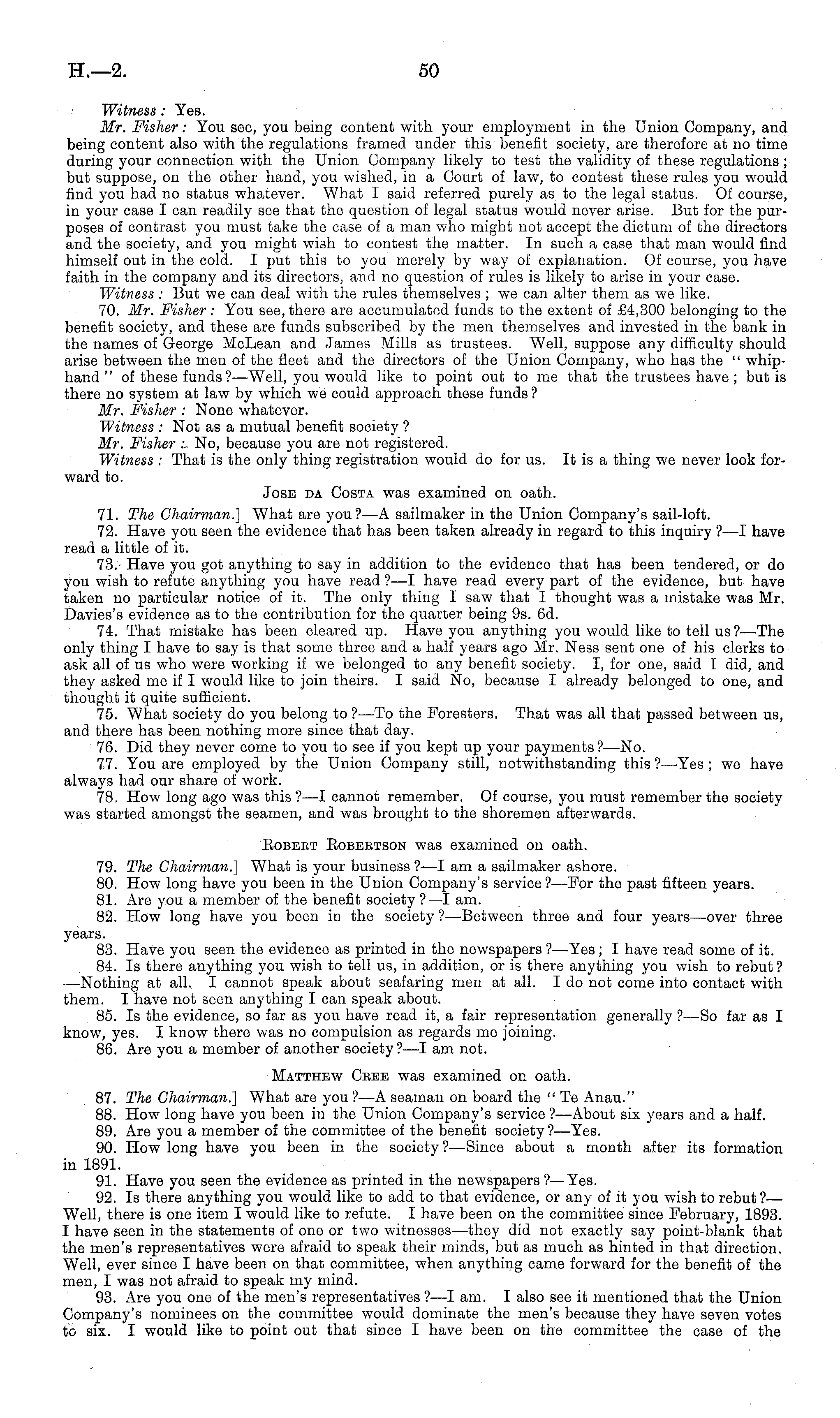 Witness : Yes. Mr. Fisher: You see, you being content with your employment in the Union Company, and being content also with the regulations framed under this benefit society, are therefore at no time during your connection with the Union Company likely to test the validity of these regulations ; but suppose, on the other hand, you wished, in a Court of law, to contest these rules you would find you had no status whatever. What I said referred purely as to the legal status. Of course, in your case I can readily see that the question of legal status would never arise. But for the purposes of contrast you must take the case of a man who might not accept the dictum of the directors and the society, and you might wish to contest the matter. In such a case that man would find himself out in the cold. I put this to you merely by way of explanation. Of course, you have faith in the company and its directors, and no question of rules is likely to arise in your case. Witness : But we can deal with the rules themselves ; we can alter them as we like. 70. Mr. Fisher : You see, there are accumulated funds to the extent of £4,300 belonging to the benefit society, and these are funds subscribed by the men themselves and invested in the bank in the names of George McLean and James Mills as trustees. Well, suppose any difficulty should arise between the men of the fleet and the directors of the Union Company, who has the " whiphand " of these funds ? —Well, you would like to point out to me that the trustees have ; but is there no system at law by which we could approach these funds ? Mr. Fisher : None whatever. Witness : Not as a mutual benefit society ? Mr. Fisher : No, because you are not registered. Witness : That is the only thing registration would do for us. It is a thing we never look forward to. Jose da Costa was examined on oath. 71. The Chairman.] What are you? —A sailmaker in the Union Company's sail-loft. 72. Have you seen the evidence that has been taken already in regard to this inquiry ? —I have read a little of it. 73. Have you got anything to say in addition to the evidence that has been tendered, or do you wish to refute anything you have read ?—I have read every part of the evidence, but have taken no particular notice of it. The only thing I saw that I thought was a mistake was Mr. Davies's evidence as to the contribution for the quarter being 9s. 6d. 74. That mistake has been cleared up. Have you anything you would like to tell us? —The only thing I have to say is that some three and a half years ago Mr. Ness sent one of his clerks to ask all of us who were working if we belonged to any benefit society. I, for one, said I did, and they asked me if I would like to join theirs. I said No, because I already belonged to one, and thought it quite sufficient. 75. What society do you belong to ?—To the Foresters. That was all that passed between us, and there has been nothing more since that day. 76. Did they never come to you to see if you kept up your payments ?—No. 77. You are employed by the Union Company still, notwithstanding this ?—Yes ; we have always had our share of work. 78. How long ago was this ?—I cannot remember. Of course, you must remember the society was started amongst the seamen, and was brought to the shoremen afterwards. Eobert Eobertson was examined on oath. 79. The Chairman.] What is your business ?—I am a sailmaker ashore. 80. How long have you been in the Union Company's service?— For the past fifteen years. 81. Are you a member of the benefit society ? —I am. 82. How long have you been in the society ?—Between three and four years—over three years. 83. Have you seen the evidence as printed in the newspapers ?—Yes; I have read some of it. 84. Is there anything you wish to tell us, in addition, or is there anything you wish to rebut ? —Nothing at all. I cannot speak about seafaring men at all. Ido not come into contact with them. I have not seen anything I can speak about. 85. Is the evidence, so far as you have read it, a fair representation generally ?—So far as I know, yes. I know there was no compulsion as regards me joining. 86. Are you a member of another society ?—I am not. Matthew Cree was examined on oath. 87. The Chairman.] What are you? —A seaman on board the "Te Anau." 88. How long have you been in the Union Company's service ? —About six years and a half. 89. Are you a member of the committee of the benefit society?— Yes. 90. How long have you been in the society ? —Since about a month after its formation in 1891. 91. Have you seen the evidence as printed in the newspapers ?—Yes. 92. Is there anything you would like to add to that evidence, or any of it you wish to rebut ?— Well, there is one item I would like to refute. I have been on the committee since February, 1893. I have seen in the statements of one or two witnesses—they did not exactly say point-blank that the men's representatives were afraid to speak their minds, but as much as hinted in that direction. Well, ever since I have been on that committee, when anything came forward for the benefit of the men, I was not afraid to speak my mind. 93. Are you one of the men's representatives ? —I am. I also see it mentioned that the Union Company's nominees on the committee would dominate the men's because they have seven votes to six. I would like to point out that since I have been on the committee the case of the