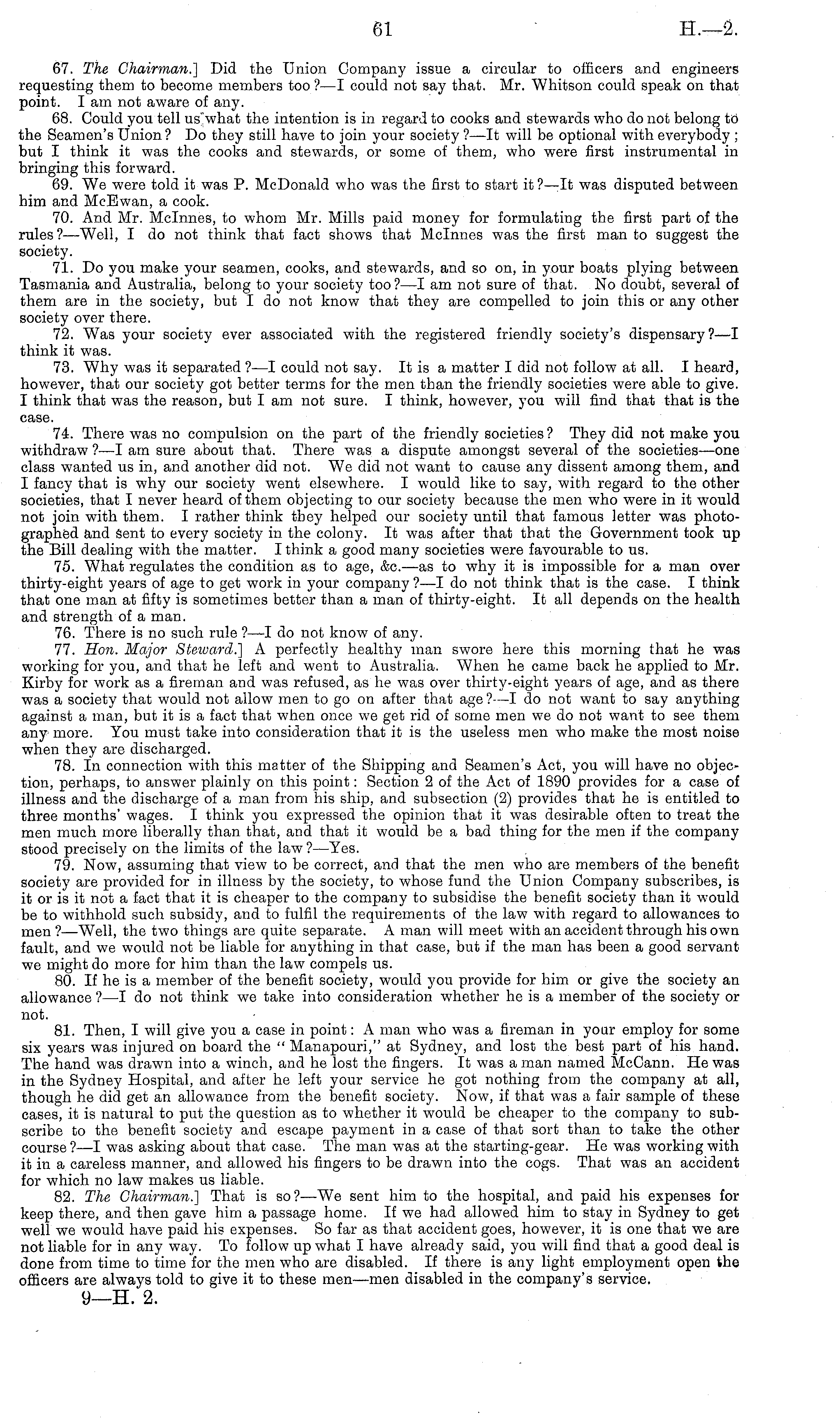 67. The Chairman.] Did the Union Company issue a circular to officers and engineers requesting them to become members too ? —I could not say that. Mr. Whitson could speak on that point. lam not aware of any. 68. Could you tell us"what the intention is in regard to cooks and stewards who do not belong to the Seamen's Union? Do they still have to join your society ?—lt will be optional with everybody ; but I think it was the cooks and stewards, or some of them, who were first instrumental in bringing this forward. 69. We were told it was P. McDonald who was the first to start it ?—lt was disputed between him and McEwan, a cook. 70. And Mr. Mclnnes, to whom Mr. Mills paid money for formulating the first part of the rules ?—Well, I do not think that fact shows that Mclnnes was the first man to suggest the society. 71. Do you make your seamen, cooks, and stewards, and so on, in your boats plying between Tasmania and Australia, belong to your society too?—I am not sure of that. No doubt, several of them are in the society, but I do not know that they are compelled to join this or any other society over there. 72. Was your society ever associated with the registered friendly society's dispensary?—l think it was. 73. Why was it separated ?—I could not say. It is a matter I did not follow at all. I heard, however, that our society got better terms for the men than the friendly societies were able to give. I think that was the reason, but lam not sure. I think, however, you will find that that is the case. 74. There was no compulsion on the part of the friendly societies ? They did not make you withdraw ?—I am sure about that. There was a dispute amongst several of the societies—one class wanted us in, and another did not. We did not want to cause any dissent among them, and I fancy that is why our society went elsewhere. I would like to say, with regard to the other societies, that I never heard of them objecting to our society because the men who were in it would not join with them. I rather think tbey helped our society until that famous letter was photographed and Sent to every society in the colony. It was after that that the Government took up the Bill dealing with the matter. I think a good many societies were favourable to us. 75. What regulates the condition as to age, &c—as to why it is impossible for a man over thirty-eight years of age to get work in your company ?—I do not think that is the case. I think that one man at fifty is sometimes better than a man of thirty-eight. It all depends on the health and strength of a man. 76. There is no such rule ?—I do not know of any. 77. Hon. Major Steward.] A perfectly healthy man swore here this morning that he was working for you, and that he left and went to Australia. When he came back he applied to Mr. Kirby for work as a fireman and was refused, as he was over thirty-eight years of age, and as there was a society that would not allow men to go on after that age ?—I do not want to say anything against a man, but it is a fact that when once we get rid of some men we do not want to see them any more. You must take into consideration that it is the useless men who make the most noise when they are discharged. 78. In connection with this matter of the Shipping and Seamen's Act, you will have no objection, perhaps, to answer plainly on this point: Section 2of the Act of 1890 provides for a case of illness and the discharge of a man from his ship, and subsection (2) provides that he is entitled to three months' wages. I think you expressed the opinion that it was desirable often to treat the men much more liberally than that, and that it would be a bad thing for the men if the company stood precisely on the limits of the law ? —Yes. 79. Now, assuming that view to be correct, and that the men who are members of the benefit society are provided for in illness by the society, to whose fund the Union Company subscribes, is it or is it not a fact that it is cheaper to the company to subsidise the benefit society than it would be to withhold such subsidy, and to fulfil the requirements of the law with regard to allowances to men ?—Well, the two things are quite separate. A man will meet with an accident through his own fault, and we would not be liable for anything in that case, but if the man has been a good servant we might do more for him than the law 7 compels us. 80. If he is a member of the benefit society, would you provide for him or give the society an allowance ?—I do not think we take into consideration whether he is a member of the society or not. 81. Then, I will give you a case in point: A man who was a fireman in your employ for some six years was injured on board the " Manapouri," at Sydney, and lost the best part of his hand. The hand was drawn into a winch, and he lost the fingers. It was a man named McCann. He was in the Sydney Hospital, and after he left your service he got nothing from the company at all, though he did get an allowance from the benefit society. Now, if that was a fair sample of these cases, it is natural to put the question as to whether it would be cheaper to the company to subscribe to the benefit society and escape payment in a case of that sort than to take the other course ? —I was asking about that case. The man was at the starting-gear. He was working with it in a careless manner, and allowed his fingers to be drawn into the cogs. That was an accident for which no law makes us liable. 82. The Chairman.] That is so? —We sent him to the hospital, and paid his expenses for keep there, and then gave him a passage home. If we had allowed him to stay in Sydney to get well we would have paid his expenses. So far as that accident goes, however, it is one that we are not liable for in any way. To follow up what I have already said, you will find that a good deal is done from time to time for the men who are disabled. If there is any light employment open the officers are always to