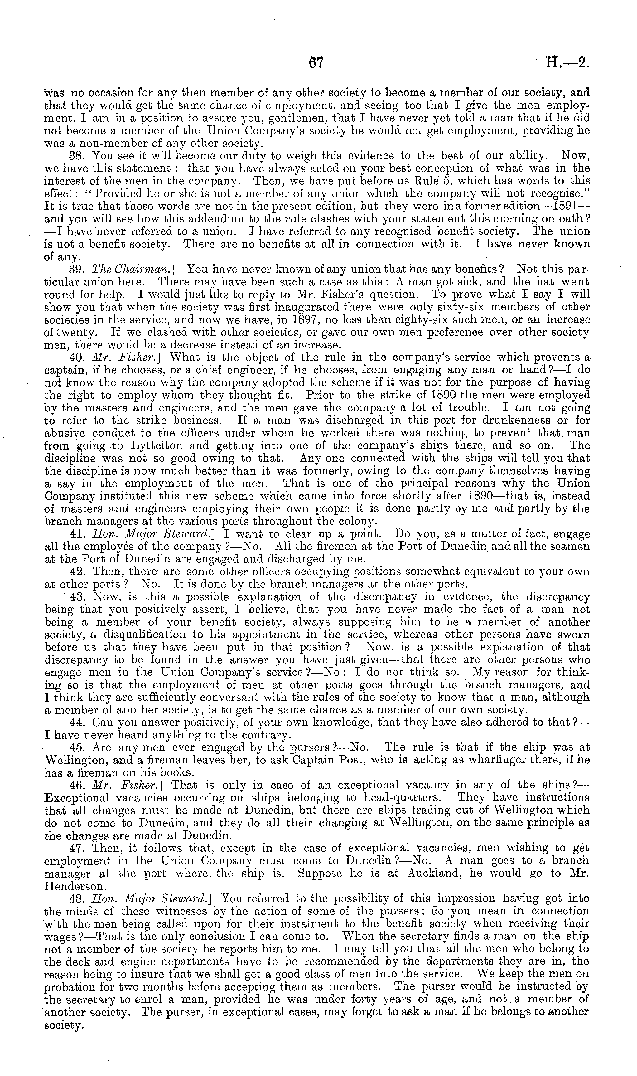 was no occasion for any then member of any other society to become a member of our society, and that they would get the Same chance of employment, and seeing too that I give the men employment, 1 am in a position to assure you, gentlemen, that I have never yet told a man that if he did not become a member of the Union Company's society he would not get employment, providing he was a non-member of any other society. 38. You see it will become our duty to weigh this evidence to the best of our ability. Now, we have this statement : that you have always acted on your best conception of what was in the interest of the men in the company. Then, we have put before us Eule 5, which has words to this effect: " Provided he or she is not a member of any union which the company will not recognise." It is true that those words are not in the present edition, but they were in a former edition—lß9l— and you will see how this addendum to the rule clashes with your statement this morning on oath? —I have never referred to a union. I have referred to any recognised benefit society. The union is not a benefit society. There are no benefits at all in connection with it. I have never known of any. 39. The Chairman.] You have never known of any union that has any benefits ?—Not this particular union here. There may have been such a case as this : A man got sick, and the hat went round for help. I would just like to reply to Mr. Fisher's question. To prove what I say I will show you that when the society was first inaugurated there were only sixty-six members of other societies in the service, and now we have, in 1897, no less than eighty-six such men, or an increase of twenty. If we clashed with other societies, or gave our own men preference over other society men, there would be a decrease instead of an increase. 40. Mr. Fisher.] What is the object of the rule in the company's service which prevents a captain, if he chooses, or a chief engineer, if he chooses, from engaging any man or hand?—l do not know the reason why the company adopted the scheme if it was not for the purpose of having the right to employ whom they thought fit. Prior to the strike of 1890 the men were employed by the masters and engineers, and the men gave the company a lot of trouble. I am not going to refer to the strike business. If a man was discharged in this port for drunkenness or for abusive conduct to the officers under whom he worked there was nothing to prevent that man from going to Lyttelton and getting into one of the company's ships there, and so on. The discipline was not so good owing to that. Any one connected, with the ships will tell you that the discipline is now much better than it was formerly, owing to the company themselves having a say in the employment of the men. That is one of the principal reasons why the Union Company instituted this new scheme which came into force shortly after 1890—that is, instead of masters and engineers employing their own people it is done partly by me and partly by the branch managers at the various ports throughout the colony. 41. Hon. Major Steward.] I want to clear up a point. Do you, as a matter of fact, engage all the employes of the company ?—No. All the firemen at the Port of Dunedin and all the seamen at the Port of Dunedin are engaged and discharged by me. 42. Then, there are some other officers occupying positions somewhat equivalent to your own at other ports? —No. It is done by the branch managers at the other ports. 43. Now, is this a possible explanation of the discrepancy in evidence, the discrepancy being that you positively assert, I believe, that you have never made the fact of a man not being a member of your benefit society, always supposing him to be a member of another society, a disqualification to his appointment in the service, whereas other persons have sworn before us that they have been put in that position ? Now, is a possible explanation of that discrepancy to be found in the answer you have just given—that there are other persons who engage men in the Union Company's service ?—No ; I do not think so. My reason for thinking so is that the employment of men at other ports goes through the branch managers, and 1 think they are sufficiently conversant with the rules of the society to know that a man, although a member of another society, is to get the same chance as a member of our own society. 44. Can you answer positively, of your own knowledge, that they have also adhered to that ?— I have never heard anything to the contrary. 45. Are any men ever engaged by the pursers ?—No. The rule is that if the ship was at Wellington, and a fireman leaves her, to ask Captain Post, who is acting as wharfinger there, if he has a fireman on his books. 46. Mr. Fisher.] That is only in case of an exceptional vacancy in any of the ships?— Exceptional vacancies occurring on ships belonging to head-quarters. They have instructions that all changes must be made at Dunedin, but there are ships trading out of Wellington which do not come to Dunedin, and they do all their changing at Wellington, on the same principle as the changes are made at Dunedin. 47. Then, it follows that, except in the case of exceptional vacancies, men wishing to get employment in the Union Company must come to Dunedin ? —No. A man goes to a branch manager at the port where, the ship is. Suppose he is at Auckland, he would go to Mr. Henderson. 48. Hon. Major Steward.] You referred to the possibility of this impression having got into the minds of these witnesses by the action of some of the pursers: do you mean in connection with the men being called upon for their instalment to the benefit society when receiving their wages ? —That is the only conclusion I can come to. When the secretary finds a man on the ship not a member of the society he reports him to me. I may tell you that all the men who belong to the deck and engine departments have to be recommended by the dep