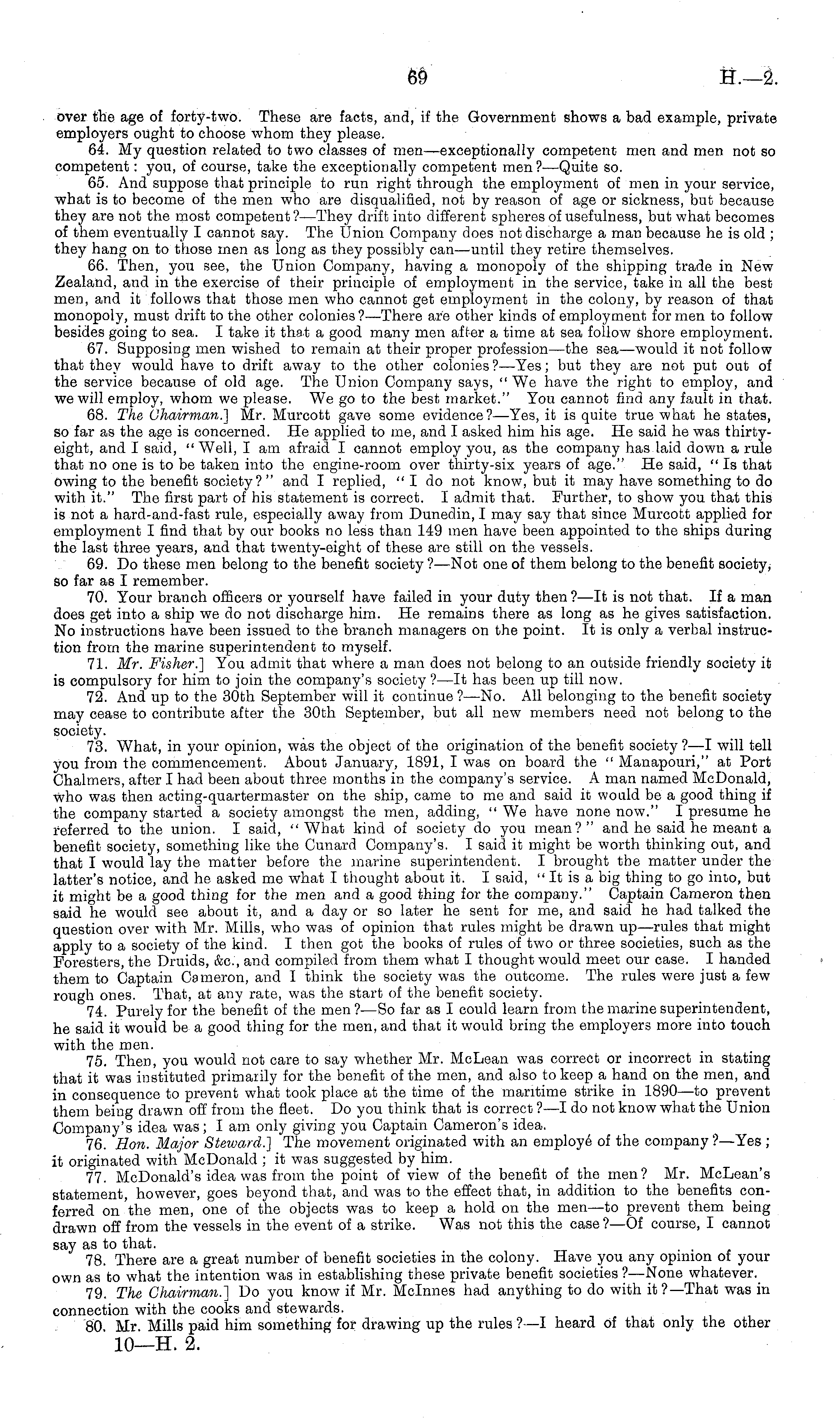 over the age of forty-two. These are facts, and, if the Government shows a bad example, private employers ought to choose whom they please. 64. My question related to two classes of men—exceptionally competent men and men not so competent: you, of course, take the exceptionally competent men?— Quite so. 65. And suppose that principle to run right through the employment of men in your service, what is to become of the men who are disqualified, not by reason of age or sickness, but because they are not the most competent ?—They drift into different spheres of usefulness, but what becomes of them eventually I cannot say. The Union Company does not discharge a man because he is old ; they hang on to those men as long as they possibly can—until they retire themselves. 66. Then, you see, the Union Company, having a monopoly of the shipping trade in New Zealand, and in the exercise of their principle of employment in the service, take in all the best men, and it follows that those men who cannot get employment in the colony, by reason of that monopoly, must drift to the other colonies?— There are other kinds of employment for men to follow besides going to sea. I take it that a good many men after a time at sea follow shore employment. 67. Supposing men wished to remain at their proper profession—the sea—would it not follow that they would have to drift away to the other colonies ?—Yes; but they are not put out of the service because of old age. The Union Company says, "We have the right to employ, and we will employ, whom we please. We go to the best market." You cannot find any fault in that. 68. The Chairman.] Mr. Murcott gave some evidence?— Yes, it is quite true what he states, so far as the age is concerned. He applied to me, and I asked him his age. He said he was thirtyeight, and I said, " Well, I am afraid I cannot employ you, as the company has laid down a rule that no one is to be taken into the engine-room over thirty-six years of age." He said, "Is that owing to the benefit society?" and I replied, " I do not know, but it may have something to do with it." The first part of his statement is correct. I admit that. Further, to show you that this is not a hard-and-fast rule, especially away from Dunedin, I may say that since Murcott applied for employment I find that by our books no less than 149 men have been appointed to the ships during the last three years, and that twenty-eight of these are still on the vessels. 69. Do these men belong to the benefit society ?—Not one of them belong to the benefit society, so far as I remember. 70. Your branch officers or yourself have failed in your duty then ?—lt is not that. If a man does get into a ship we do not discharge him. He remains there as long as he gives satisfaction. No instructions have been issued to the branch managers on the point. It is only a verbal instruction from the marine superintendent to myself. 71. Mr. Fisher.] You admit that where a man does not belong to an outside friendly society it is compulsory for him to join the company's society ?—lt has been up till now. 72. And up to the 30th September will it continue ?—No. All belonging to the benefit society may cease to contribute after the 30th September, but all new members need not belong to the society. 73. What, in your opinion, was the object of the origination of the benefit society? —I will tell you from the commencement. About January, 1891, I was on board the " Manapouri," at Port Chalmers, after I had been about three months in the company's service. A man named McDonald, Who was then acting-quartermaster on the ship, came to me and said it would be a good thing if the company started a society amongst the men, adding, "We have none now." I presume he referred to the union. I said, "What kind of society do you mean?" and he said he meant a benefit society, something like the Cunard Company's. I said it might be worth thinking out, and that I would lay the matter before the marine superintendent. I brought the matter under the latter's notice, and he asked me what I thought about it. I said, "Itis a big thing to go into, but it might be a good thing for the men and a good thing for the company." Captain Cameron then said he would see about it, and a day or so later he sent for me, and said he had talked the question over with Mr. Mills, who was of opinion that rules might be drawn up—rules that might apply to a society of the kind. I then got the books of rules of two or three societies, such as the Foresters, the Druids, &c, and compiled from them what I thought would meet our case. I handed them to Captain Cameron, and I think the society was the outcome. The rules were just a few rough ones. That, at any rate, was the start of the benefit society. 74. Purely for the benefit of the men ?—So far as I could learn from the marine superintendent, he said it would be a good thing for the men, and that it would bring the employers more into touch with the men. 75. Then, you would not care to say whether Mr. McLean was correct or incorrect in stating that it was instituted primarily for the benefit of the men, and also to keep a hand on the men, and in consequence to prevent what took place at the time of the maritime strike in 1890 —to prevent them being drawn off from the fleet. Do you think that is correct ?—I do not know what the Union Company's idea was; I am only giving you Captain Cameron's idea. 76. Hon. Major Steward.] The movement originated with an employe of the company ?—Yes ; it originated with McDonald ; it was suggested by him. 77. McDonald's idea was from the point of view of the benefit of the men? Mr. McLean's statement, however, goes beyond that, and was to the effect that, in addition to the benefits conferred on the men, one of the objects was to keep a hold on the men —to prevent them being drawn off from the vessels in the event of a strike. Was not this the case?—Of course, I cannot say as to that. 