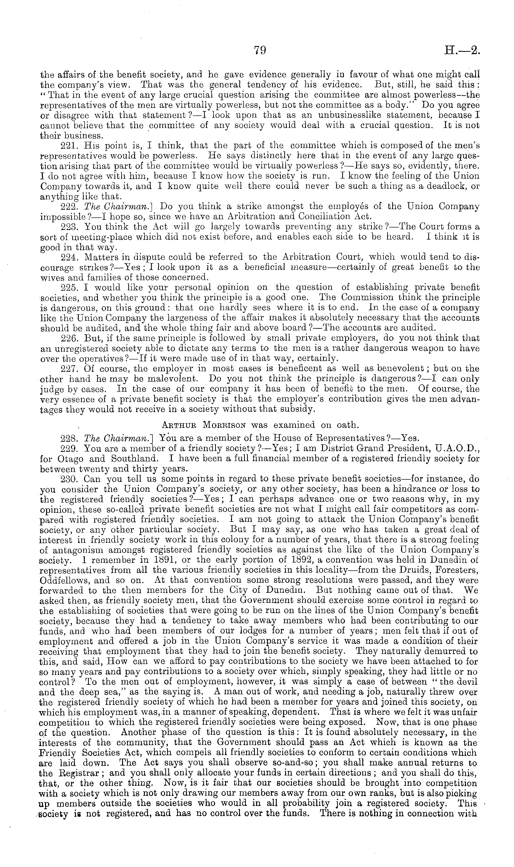 the affairs of the benefit society, and he gave evidence generally in favour of what one might call the company's view. That was the general tendency of his evidence. But, still, he said this : "' That in the event of any large crucial question arising the committee are almost powerless—the representatives of the men are virtually powerless, but not the committee as a body." Do you agree or disagree with that statement ?—I look upon that as an unbusinesslike statement, because I cannot believe that the committee of any society would deal with a crucial question. It is not their business. 221. His point is, I think, that the part of the committee which is composed of the men's representatives would be powerless. He says distinctly here that in the event of any large question arising that part of the committee would be virtually powerless ? —He says so, evidently, there. Ido not agree with him, because I know how the society is run. I know the feeling of the Union Company towards it, and I know quite well there could never be such a thing as a deadlock, or anything like that. 222. The Chairman.] Do you think a strike amongst the employes of the Union Company impossible ?—I hope so, since we have an Arbitration and Conciliation Act. 223. You think the Act will go largely towards preventing any strike ?—The Court forms a sort of meeting-place which did not exist before, and enables each side to be heard. I think it is good in that way. 224. Matters in dispute could be referred to the Arbitration Court, which would tend to discourage strikes ?—Yes ; I look upon it as a beneficial measure —certainly of great benefit to the Wives and families of those concerned. 225. I would like your personal opinion on the question of establishing private benefit societies, and whether you think the principle is a good one. The Commission think the principle is dangerous, on this ground : that one hardly sees where it is to end. In the case of a company like the Union Company the largeness of the affair makes it absolutely necessary that the accounts should be audited, and the whole thing fair and above board ?—The accounts are audited. 226. But, if the same principle is followed by small private employers, do you not think that an unregistered society able to dictate any terms to the men is a rather dangerous weapon to have over the operatives ? —lf it were made use of in that way, certainly. 227. Of course, the employer in most cases is beneficent as well as benevolent; but on the other hand he may be malevolent. Do you not think the principle is dangerous?—l can only judge by cases. In the case of our company it has been of benefit to the men. Of course, the very essence of a private benefit society is that the employer's contribution gives the men advantages they would not receive in a society without that subsidy. Arthur Morrison was examined on oath. 228. The Chairman.] You are a member of the House of Eepresentatives ?—Yes. 229. You are a member of a friendly society? —Yes; I am District Grand President, U.A.0.D., for Otago and Southland. I have been a full financial member of a registered friendly society for between twenty and thirty years. 230. Can you tell us some points in regard to these private benefit societies—for instance, do you consider the Union Company's society, or any other society, has been a hindrance or loss to the registered friendly societies ?—Yes; I can perhaps advance one or two reasons why, in my opinion, these so-called private benefit societies are not what I might call fair competitors as compared with registered friendly societies. I am not going to attack the Union Company's benefit society, or any other particular society. But I may say, as one who has taken a great deal of interest in friendly society work in this colony for a number of years, that there is a strong feeling of antagonism amongst registered friendly societies as against the like of the Union Company's society. 1 remember in 1891, or the early portion of 1892, a convention was held in Dunedin of representatives from all the various friendly societies in this locality—from the Druids, Foresters, Oddfellows, and so on. At that convention some strong resolutions were passed, and they were forwarded to the then members for the City of Dunedin. But nothing came out of that. We asked then, as friendly society men, that the Government should exercise some control in regard to the establishing of societies that were going to be run on the lines of the Union Company's benefit society, because they had a tendency to take away members who had been contributing to our funds, and who had been members of our lodges for a number of years; men felt that if out of employment and offered a job in the Union Company's service it was made a condition of their receiving that employment that they had to join the benefit society. They naturally demurred to this, and said, How can we afford to pay contributions to the society we have been attached to for so many years and pay contributions to a society over which, simply speaking, they had little or no control? To the men out of employment, however, it was simply a case of between " the devil and the deep sea," as the saying is. A man out of work, and needing a job, naturally threw over the registered friendly society of which he had been a member for years and joined this society, on which his employment was, in a manner of speaking, dependent. That is where we felt it was unfair competition to which the registered friendly societies were being exposed. Now, that is one phase of the question. Another phase of the question is this :It is found absolutely necessary, in the interests of the community, that the Government should pass an Act which is known as the Friendly Societies Act, which compels all friendly societies to conform to certain conditions which are laid down. The Act says you shall observe so-and-so; you shall make annual returns to the E