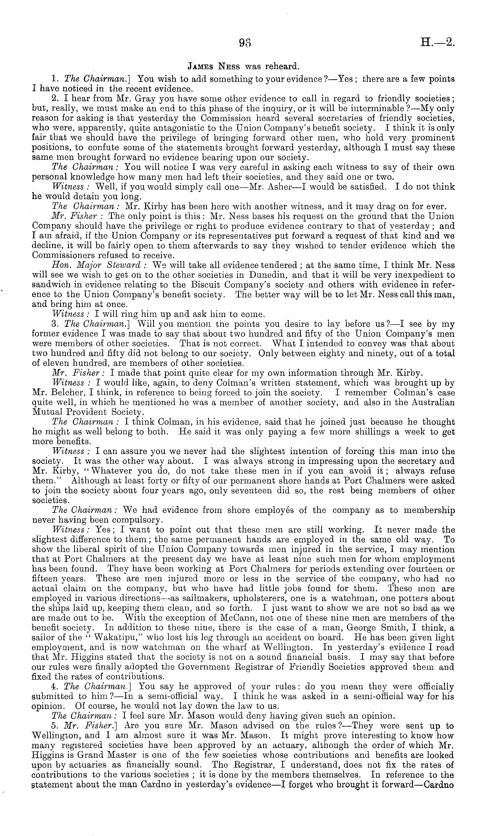 James Ness was reheard. 1. The Chairman.] You wish to add something to your evidence ?—Yes; there are a few points I have noticed in the recent evidence. 2. I hear from Mr. Gray you have some other evidence to call in regard to friendly societies; but, really, we must make an end to this phase of the inquiry, or it will be interminable ? —My only reason for asking is that yesterday the Commission heard several secretaries of friendly societies, who were, apparently, quite antagonistic to the Union Company's benefit society. I think it is only fair that we should have the privilege of bringing forward other men, who hold very prominent positions, to confute some of the statements brought forward yesterday, although I must say these same men brought forward no evidence bearing upon our society. The Chairman : You will notice I was very careful in asking each witness to say of their own personal knowledge how many men had left their societies, and they said one or two. Witness : Well, if you would simply call one —Mr. Asher—l would be satisfied. Ido not think he would detain you long. The Chairman: Mr. Kirby has been here with another witness, and it may drag on for ever. Mr. Fisher : The only point is this : Mr. Ness bases his request on the ground that the Union Company should have the privilege or right to produce evidence contrary to that of yesterday; and I am afraid, if the Union Company or its representatives put forward a request of that kind and we decline, it will be fairly open to them afterwards to say they wished to tender evidence which the Commissioners refused to receive. Hon. Major Steward : We will take all evidence tendered ; at the same time, I think Mr. Ness will see we wish to get on to the other societies in Dunedin, and that it will be very inexpedient to sandwich in evidence relating to the Biscuit Company's society and others with evidence in reference to the Union Company's benefit society. The better way will be to let Mr. Ness call this man, and bring him at once. Witness : I will ring him up and ask him to come. 3. The Chairman.] Will you mention the points you desire to lay before us ?-—I see by my former evidence I was made to say that about two hundred and fifty of the Union Company's men were members of other societies. That is not correct. What I intended to convey was that about two hundred and fifty did not belong to our society. Only between eighty and ninety, out of a total of eleven hundred, are members of other societies. Mr. Fisher: I made that point quite clear for my own information through Mr. Kirby. Witness : I would like, again, to deny Colman's written statement, which was brought up by Mr. Belcher, I think, in reference to being forced to join the society. I remember Colman's case quite well, in which he mentioned he was a member of another society, and also in the Australian Mutual Provident Society. The Chairman : I think Colman, in his evidence, said that he joined just because he thought he might as well belong to both. He said it was only paying a few more shillings a week to get more benefits. Witness : I can assure you we never had the slightest intention of forcing this man into the society. It was the other way about. I was always strong in impressing upon the secretary and Mr. Kirby, "Whatever you do, do not take these men in if you can avoid it; always refuse them." Although at least forty or fifty of our permanent shore hands at Port Chalmers were asked to join the society about four years ago, only seventeen did so, the rest being members of other societies. The Chairman : We had evidence from shore employes of the company as to membership never having been compulsory. Witness : Yes; I want to point out that these men are still working. It never made the slightest difference to them; the same permanent hands are employed in the same old way. To show the liberal spirit of the Union Company towards men injured in the service, I may mention that at Port Chalmers at the present day we have at least nine such men for whom employment has been found. They have been working at Port Chalmers for periods extending over fourteen or fifteen years. These are men injured more or less in the service of the company, who had no actual claim on the company, but who have had little jobs found for them. These men are employed in various directions--as sailmakers, upholsterers, one is a watchman, one potters about the ships laid up, keeping them clean, and so forth. I just want to show we are not so bad as we are made out to be. With the exception of McCann, not one of these nine men are members of the benefit society. In addition to these nine, there is the case of a man, George Smith, I think, a sailor of the " Wakatipu," who lost his leg through an accident on board. He has been given light employment, and is now watchman on the wharf at Wellington. In yesterday's evidence I read that Mr. Higgins stated that the society is not on a sound financial basis. I may say that before our rules were finally adopted the Government Eegistrar of Friendly Societies approved them and fixed the rates of contributions. 4. The Chairman.] You say he approved of your rules :do you mean they were officially submitted to him ?—ln a semi-official way. I think he was asked in a semi-official way for his opinion. Of course, he would not lay down the law to us. The Chairman : I feel sure Mr. Mason would deny having given such an opinion. 5. Mr. Fisher.] Are you sure Mr. Mason advised on the rules ?—They were sent up to Wellington, and I am almost sure it was Mr. Mason. It might prove interesting to know how many registered societies have been approved by an actuary, although the order of which Mr. Higgins is Grand Master is one of the few societies whose contributions and benefits are looked upon by actuaries as financially sound. The Eegistrar, I understand, does not fix the rates of contributions to the various societies ; it is done by the members themsel