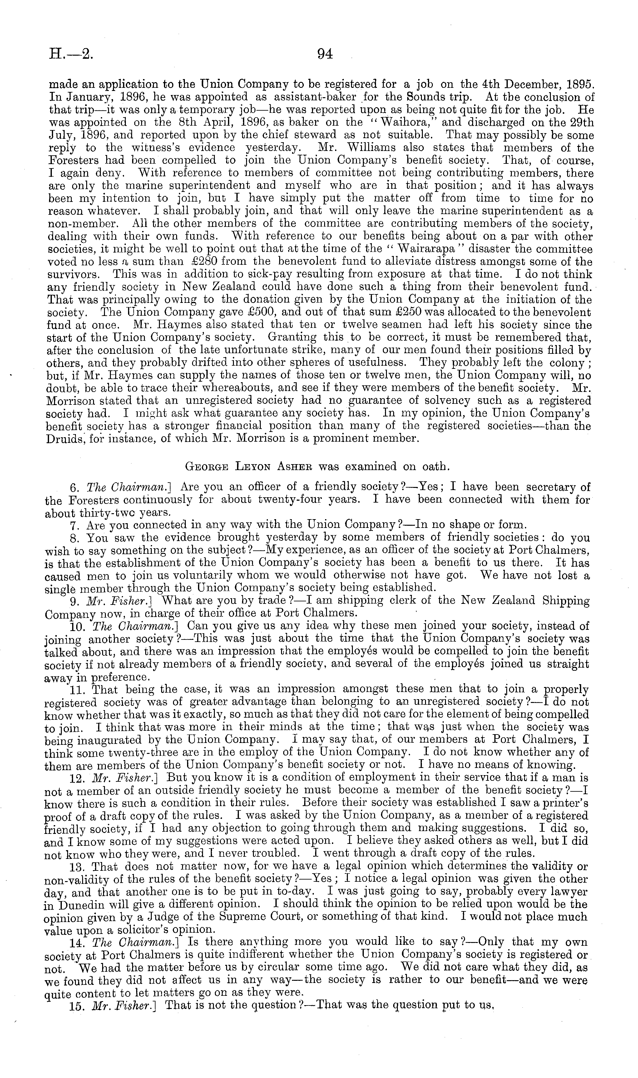 made an application to the Union Company to be registered for a job on the 4th December, 1895. In January, 1896, he was appointed as assistant-baker for the Sounds trip. At the conclusion of that trip—it was only a temporary job—he was reported upon as being not quite fit for the job. He was appointed on the Bth April, 1896, as baker on the "Waihora," and discharged on the 29th July, 1896, and reported upon by the chief steward as not suitable. That may possibly be some reply to the witness's evidence yesterday. Mr. Williams also states that members of the Foresters had been compelled to join the Union Company's benefit society. That, of course, I again deny. With reference to members of committee not being contributing members, there are only the marine superintendent and myself who are in that position; and it has always been my intention to join, but I have simply put the matter off from time to time for no reason whatever. I shall probably join, and that will only leave the marine superintendent as a non-member. All the other members of the committee are contributing members of the society, dealing with their own funds. With reference to our benefits being about on a par with other societies, it might be well to point out that at the time of the " Wairarapa" disaster the committee voted no less a sum than £280 from the benevolent fund to alleviate distress amongst some of the survivors. This was in addition to sick-pay resulting from exposure at that time. Ido not think any friendly society in New Zealand could have done such a thing from their benevolent fund. That was principally owing to the donation given by the Union Company at the initiation of the society. The Union Company gave £500, and out of that sum £250 was allocated to the benevolent fund at once. Mr. Haymes also stated that ten or twelve seamen had left his society since the start of the Union Company's society. Granting this to be correct, it must be remembered that, after the conclusion of the late unfortunate strike, many of our men found their positions filled by others, and they probably drifted into other spheres of usefulness. They probably left the colony ; but, if Mr. Haymes can supply the names of those ten or twelve men, the Union Company will, no doubt, be able to trace their whereabouts, and see if they were members of the benefit society. Mr. Morrison stated that an unregistered society had no guarantee of solvency such as a registered society had. I might ask what guarantee any society has. In my opinion, the Union Company's benefit society has a stronger financial position than many of the registered societies—than the Druidsj for instance, of which Mr. Morrison is a prominent member, George Leyon Asher was examined on oath. 6. The Chairman.] Are you an officer of a friendly society?—-Yes; I have been secretary of the Foresters continuously for about twenty-four years. I have been connected with them for about thirty-twc years. 7. Are you connected in any way with the Union Company?—ln no shape or form. 8. You saw the evidence brought yesterday by some members of friendly societies : do you wish to say something on the subject ?—My experience, as an officer of the society at Port Chalmers, is that the establishment of the Union Company's society has been a benefit to us there. It has caused men to join us voluntarily whom we would otherwise not have got. We have not lost a single member through the Union Company's society being established. 9. Mr. Fisher.] What are you by trade? —I am shipping clerk of the New Zealand Shipping Company now, in charge of their office at Port Chalmers. 10. The Chairman.] Can you give us any idea why these men joined your society, instead of joining another society ?—This was just about the time that the Union Company's society was talked about, and there was an impression that the employes would be compelled to join the benefit society if not already members of a friendly society, and several of the employes joined us straight away in preference. 11. That being the case, it was an impression amongst these men that to join a properly registered society was of greater advantage than belonging to an unregistered society ?—I do not know whether that was it exactly, so much as that they did not care for the element of being compelled to join. I think that was more in their minds at the time; that was just when the society was being inaugurated by the Union Company. I may say that, of our members at Port Chalmers, I think some twenty-three are in the employ of the Union Company. Ido not know whether any of them are members of the Union Company's benefit society or not. I have no means of knowing. 12. Mr. Fisher.] But you know it is a condition of employment in their service that if a man is not a member of an outside friendly society he must become a member of the benefit society ? —I know there is such a condition in their rules. Before their society was established I saw a printer's proof of a draft copy of the rules. I was asked by the Union Company, as a member of a registered friendly society, if I had any objection to going through them and. making suggestions. I did so, and I know some of my suggestions were acted upon. I believe they asked others as well, but I did not know who they were, and I never troubled. I went through a draft copy of the rules. 13. That does not matter now, for we have a legal opinion which determines the validity or non-validity of the rules of the benefit society ?—Yes ; I notice a legal opinion was given the other day, and that another one is to be put in to-day. I was just going to say, probably every lawyer in Dunedin will give a different opinion. I should think the opinion to be relied upon would be the opinion given by a Judge of the Supreme Court, or something of that kind. I would not place much value upon a solicitor's opinion. 14. The Chairman.] Is there anything more you would like to say ?—Only that my own 