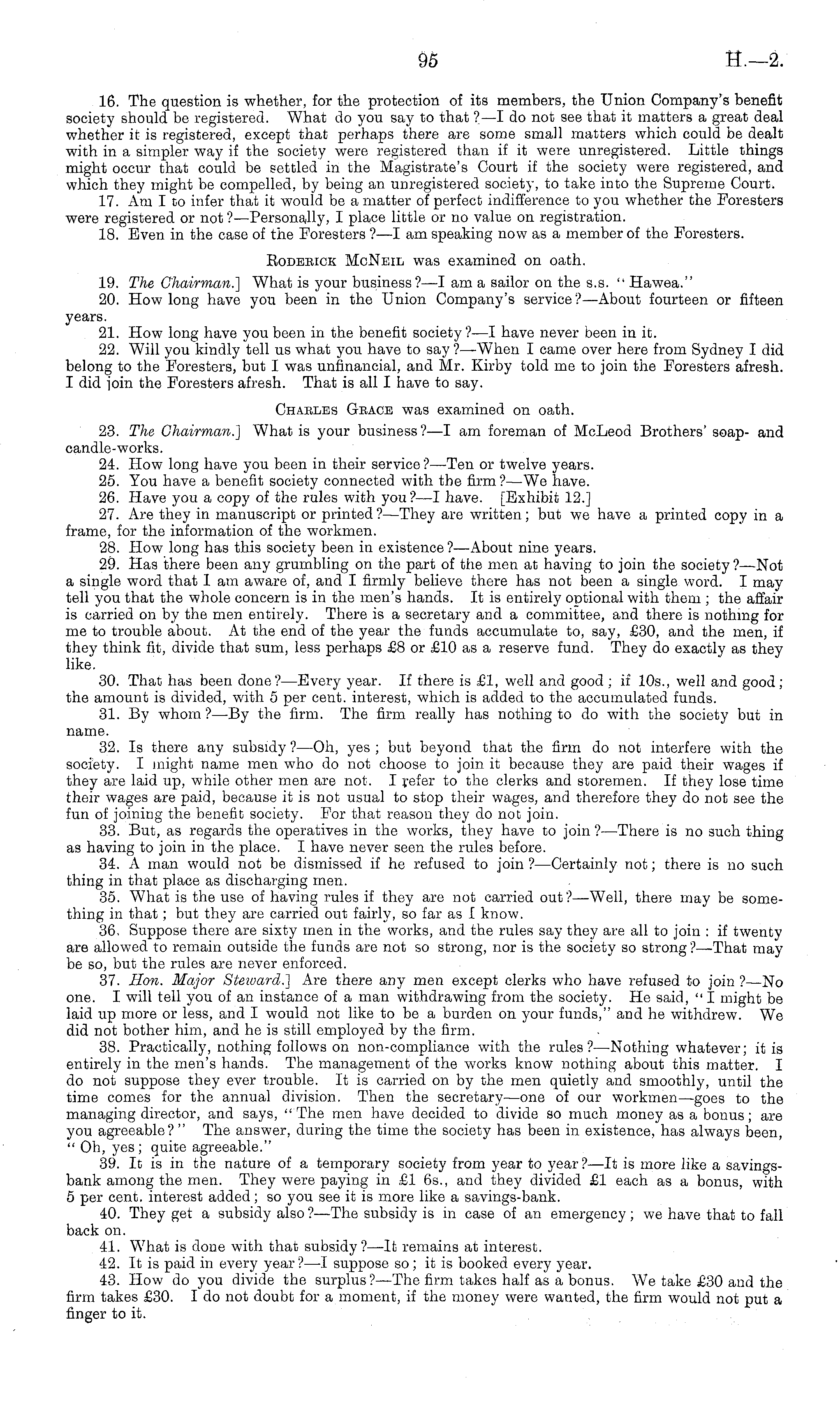 16. The question is whether, for the protection of its members, the Union Company's benefit society should be registered. What do you say to that ? —I do not see that it matters a great deal whether it is registered, except that perhaps there are some small matters which could be dealt with in a simpler way if the society were registered than if it were unregistered. Little things might occur that could be settled in the Magistrate's Court if the society were registered, and which they might be compelled, by being an unregistered society, to take into the Supreme Court. 17. Am I to infer that it would be a matter of perfect indifference to you whether the Foresters were registered or not ?—Personally, I place little or no value on registration. 18. Even in the case of the Foresters ?—I am speaking now as a member of the Foresters. Eoderick McNeil was examined on oath. 19. The Chairman.] What is your business? —I am a sailor on the s.s. " Hawea." 20. How long have you been in the Union Company's service ?—About fourteen or fifteen years. 21. How long have you been in the benefit society? —I have never been in it. 22. Will you kindly tell us what you have to say ?—When I came over here from Sydney I did belong to the Foresters, but I was unfinancial, and Mr. Kirby told me to join the Foresters afresh. I did join the Foresters afresh. That is all I have to say. Charles Grace was examined on oath. 23. The Chairman.] What is your business ?—I am foreman of McLeod Brothers' soap- and candle-works. 24. How long have you been in their service ?—Ten or twelve years. 25. You have a benefit society connected with the firm ? —We have. 26. Have you a copy of the rules with you ?—I have. [Exhibit 12.] 27. Are they in manuscript or printed?— They are written; but we have a printed copy in a frame, for the information of the workmen. 28. How long has this society been in existence ?—About nine years. 29. Has there been any grumbling on the part of the men at having to join the society ?—Not a single word that lam aware of, and I firmly believe there has not been a single word. I may tell you that the whole concern is in the men's hands. It is entirely optional with them ; the affair is carried on by the men entirely. There is a secretary and a committee, and there is nothing for me to trouble about. At the end of the year the funds accumulate to, say, £30, and the men, if they think fit, divide that sum, less perhaps £8 or £10 as a reserve fund. They do exactly as they like. 30. That has been done?— Every year. If there is £1, well and good ; if 10s., well and good; the amount is divided, with 5 per cent, interest, which is added to the accumulated funds. 31. By whom ?—By the firm. The firm really has nothing to do with the society but in name. 32. Is there any subsidy ?—Oh, yes ; but beyond that the firm do not interfere with the society. I might name men who do not choose to join it because they are paid their wages if they are laid up, while other men are not. I refer to the clerks and storemen. If they lose time their wages are paid, because it is not usual to stop their wages, and therefore they do not see the fun of joining the benefit society. For that reason they do not join. 33. But, as regards the operatives in the works, they have to join ?—There is no such thing as having to join in the place. I have never seen the rules before. 34. A man would not be dismissed if he refused to join ?—Certainly not; there is no such thing in that place as discharging men. 35. What is the use of having rules if they are not carried out?— Well, there may be something in that; but they are carried out fairly, so far as I know. 36. Suppose there are sixty men in the works, and the rules say they are all to join : if twenty are allowed to remain outside the funds are not so strong, nor is the society so strong?— That may be so, but the rules are never enforced. 37. Hon. Major Steward.] Are there any men except clerks who have refused to join ?—No one. I will tell you of an instance of a man withdrawing from the society. He said, " I might be laid up more or less, and I would not like to be a burden on your funds," and he withdrew. We did not bother him, and he is still employed by the firm. 38. Practically, nothing follows on non-compliance with the rules?— Nothing whatever; it is entirely in the men's hands. The management of the works know nothing about this matter. I do not suppose they ever trouble. It is carried on by the men quietly and smoothly, until the time comes for the annual division. Then the secretary—one of our workmen—goes to the managing director, and says, " The men have decided to divide so much money as a bonus; are you agreeable? " The answer, during the time the society has been in existence, has always been, " Oh, yes; quite agreeable." 39. It is in the nature of a temporary society from year to year?—lt is more like a savino'sbank among the men. They were paying in £1 65., and they divided £1 each as a bonus, with 5 per cent, interest added; so you see it is more like a savings-bank. 40. They get a subsidy also ?—The subsidy is in case of an emergency; we have that to fall back on. 41. What is done with that subsidy?—lt remains at interest. 42. It is paid in every year?—l suppose so; it is booked every year. 43. How do you divide the surplus?— The firm takes half as a bonus. We take £30 and the firm takes £30. Ido not doubt for a moment, if the money were wanted, the firm would not put a finger to it.