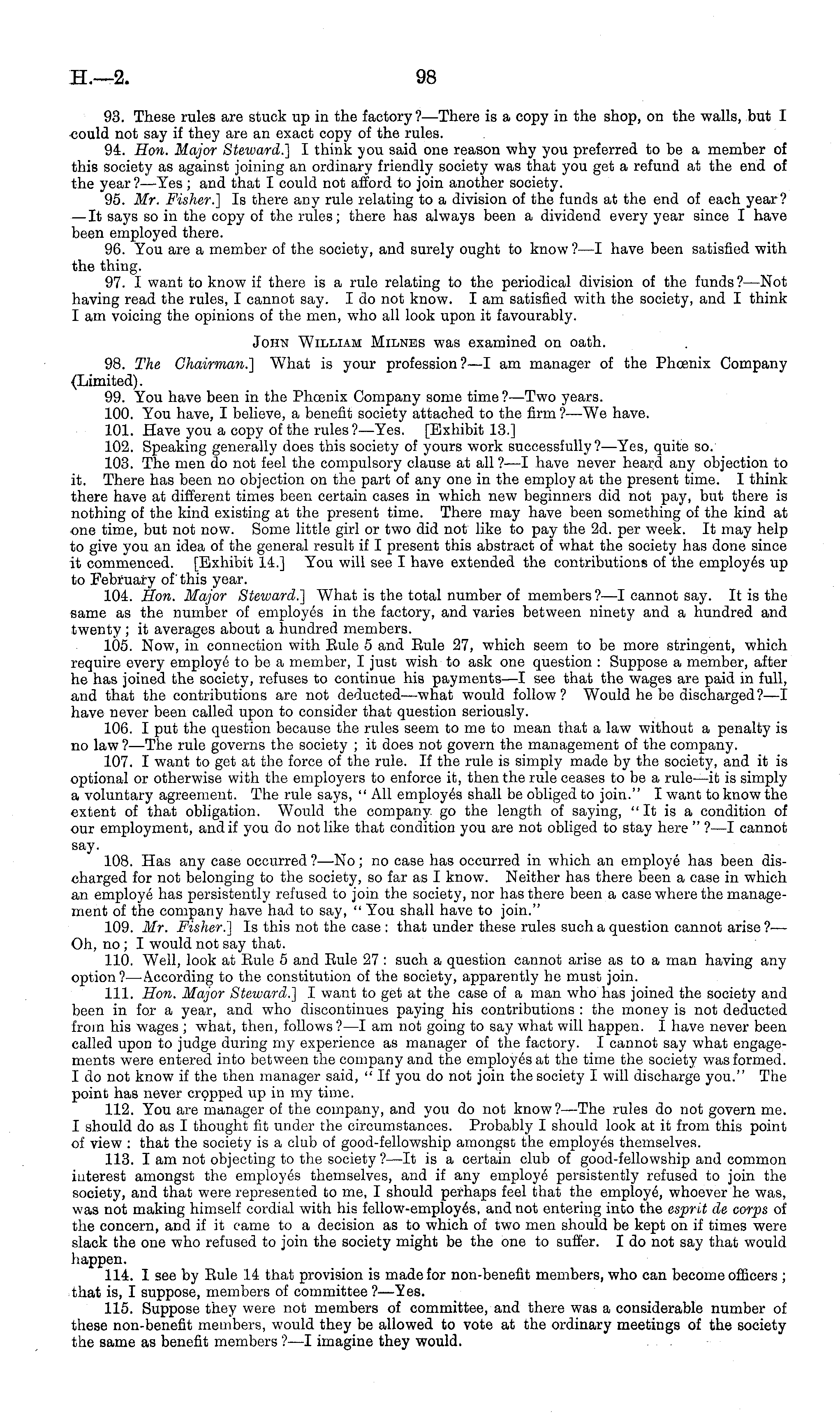 93. These rules are stuck up in the factory?— There is a copy in the shop, on the walls, but I could not say if they are an exact copy of the rules. 94. Hon. Major Steward.] I think you said one reason why you preferred to be a member of this society as against joining an ordinary friendly society was that you get a refund at the end of the year? —Yes ; and that I could not afford to join another society. 95. Mr. Fisher.] Is there any rule relating to a division of the funds at the end of each year? —It says so in the copy of the rules; there has always been a dividend every year since I have been employed there. 96. You are a member of the society, and surely ought to know ?—I have been satisfied with the thing. 97. I want to know if there is a rule relating to the periodical division of the funds?— Not having read the rules, I cannot say. Ido not know. lam satisfied with the society, and I think I am voicing the opinions of the men, who all look upon it favourably. John William Milnes was examined on oath. 98. The Chairman.] What is your profession?—l am manager of the Phoenix Company {Limited). 99. You have been in the Phoenix Company some time ? —Two years. 100. You have, I believe, a benefit society attached to the firm ?—We have. 101. Have you a copy of the rules ?—Yes. [Exhibit 13.] 102. Speaking generally does this society of yours work successfully? —Yes, quite so. 103. The men do not feel the compulsory clause at all ?—I have never heard any objection to it. There has been no objection on the part of any one in the employ at the present time. I think there have at different times been certain cases in which new beginners did not pay, but there is nothing of the kind existing at the present time. There may have been something of the kind at one time, but not now. Some little girl or two did not like to pay the 2d. per week. It may help to give you an idea of the general result if I present this abstract of what the society has done since it commenced. [Exhibit 14.] You will see I have extended the contributions of the employes up to February of' this year. 104. Hon. Major Steward.] What is the total number of members ?—I cannot say. It is the same as the number of employes in the factory, and varies between ninety and a hundred and twenty ; it averages about a hundred members. 105. Now, in connection with Eule 5 and Eule 27, which seem to be more stringent, which require every employe to be a member, I just wish to ask one question : Suppose a member, after he has joined the society, refuses to continue his payments—l see that the wages are paid m full, and that the contributions are not deducted—what would follow ? Would he be discharged ?—I have never been called upon to consider that question seriously. 106. I put the question because the rules seem to me to mean that a law without a penalty is no law ? —The rule governs the society ; it does not govern the management of the company. 107. I want to get at the force of the rule. If the rule is simply made by the society, and it is optional or otherwise with the employers to enforce it, then the rule ceases to be a rule-—it is simply a voluntary agreement. The rule says, " All employes shall be obliged to join." I want to know the extent of that obligation. Would the company, go the length of saying, "Itis a condition of our employment, and if you do not like that condition you are not obliged to stay here " ? —I cannot sa y--108. Has any case occurred ?—No; no case has occurred in which an employe has been discharged for not belonging to the society, so far as I know. Neither has there been a case in which an employe has persistently refused to join the society, nor has there been a case where the management of the company have had to say, " You shall have to join." 109. Mr. Fisher.] Is this not the case : that under these rules such a question cannot arise ?— Oh, no ; I would not say that. 110. Well, look at Eule 5 and Eule 27 : such a question cannot arise as to a man having any option ?—According to the constitution of the society, apparently he must join. 111. Hon. Major Steward.] I want to get at the case of a man who has joined the society and been in for a year, and who discontinues paying his contributions : the money is not deducted from his wages ; what, then, follows? —I am not going to say what will happen. I have never been called upon to judge during my experience as manager of the factory. I cannot say what engagements were entered into between the company and the employes at the time the society was formed. Ido not know if the then manager said, "If you do not join the society I will discharge you." The point has never cropped up in my time. 112. You are manager of the company, and you do not know? —The rules do not govern me. I should do as I thought fit under the circumstances. Probably I should look at it from this point of view : that the society is a club of good-fellowship amongst the employes themselves. 113. I am not objecting to the society ? —lt is a certain club of good-fellowship and common interest amongst the employes themselves, and if any employe persistently refused to join the society, and that were represented to me, I should perhaps feel that the employe, whoever he was, was not making himself cordial with his fellow-employes, and not entering into the esprit de corps of the concern, and if it came to a decision as to which of two men should be kept on if times were slack the one who refused to join the society might be the one to suffer. Ido not say that would happen. 114. I see by Eule 14 that provision is made for non-benefit members, who can become officers ; that is, I suppose, members of committee ?—Yes. 115. Suppose they were not members of committee, and there was a considerable number of these non-benefit members, would they be allowed to vote at the ordinary meetings of the society the same as benefit members ? —I imagine they wou