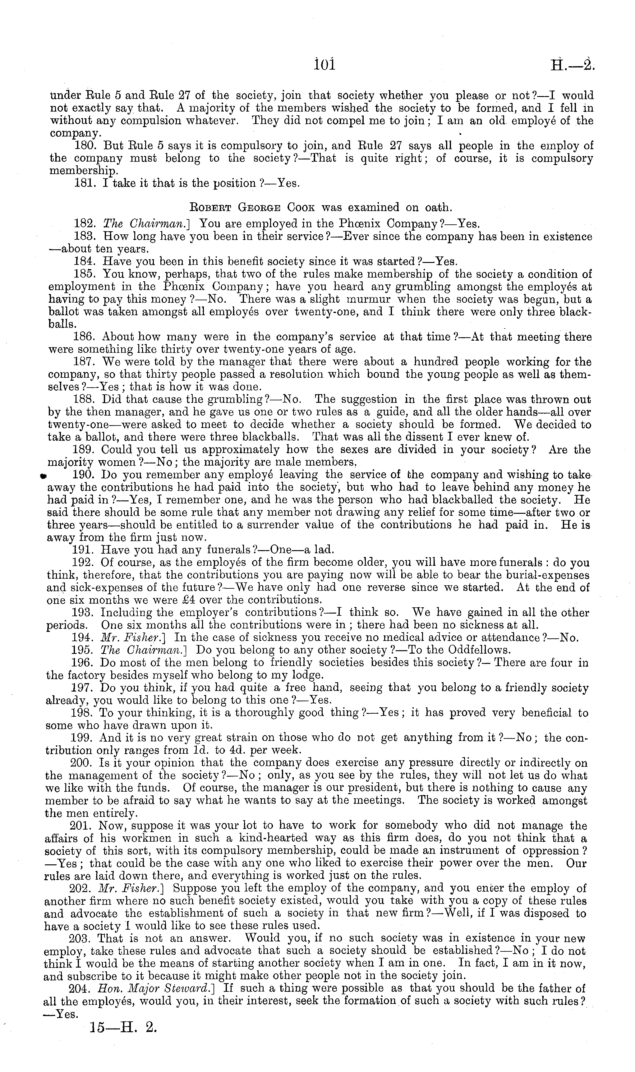 under Eule 5 and Eule 27 of the society, join that society whether you please or not ?—I would not exactly say that. A majority of the members wished the society to be formed, and I fell in without any compulsion whatever. They did not compel me to join ; lam an old employe of the company. 180. But Eule 5 says it is compulsory to join, and Eule 27 says all people in the employ of the company must belong to the society ? —That is quite right; of course, it is compulsory membership. 181. I take it that is the position ?—Yes. Eobert George Cook was examined on oath. 182. The Chairman.] You are employed in the Phcenix Company?— Yes. 183. How long have you been in their service ?—-Ever since the company has been in existence —about ten years. 184. Have you been in this benefit society since it was started ? —Yes. 185. You know, perhaps, that two of the rules make membership of the society a condition of employment in the Phoenix Company; have you heard any grumbling amongst the employes at having to pay this money ?—No. There was a slight murmur when the society was begun, but a ballot was taken amongst all employes over twenty-one, and I think there were only three blackballs. 186. About how many were in the company's service at that time ?—At that meeting there were something like thirty over twenty-one years of age. 187. We were told by the manager that there were about a hundred people working for the company, so that thirty people passed a resolution which bound the young people as well as themselves?— Yes ; that is how it was done. 188. Did that cause the grumbling? —No. The suggestion in the first place was thrown out by the then manager, and he gave us one or two rules as a guide, and all the older hands—all over twenty-one—were asked to meet to decide whether a society should be formed. We decided to take a ballot, and there were three blackballs. That was all the dissent I ever knew of. 189. Could you tell us approximately how the sexes are divided in your society ? Are the majority women ? —No ; the majority are male members. , 190. Do you remember any leaving the service of the company and wishing to take away the contributions he had paid into the society, but who had to leave behind any money he had paid in ?—Yes, I remember one, and he was the person who had blackballed the society. He said there should be some rule that any member not drawing any relief for some time—after two or three years —should be entitled to a surrender value of the contributions he had paid in. He is away from the firm just now. 191. Have you had any funerals?— One—a lad. 192. Of course, as the employes of the firm become older, you will have more funerals : do you think, therefore, that the contributions you are paying now will be able to bear the burial-expenses and sick-expenses of the future ?—We have only had one reverse since we started. At the end of one six months we were £4 over the contributions. 193. Including the employer's contributions ? —I think so. We have gained in all the other periods. One six months all the contributions were in ; there had been no sickness at all. 194. Mr. Fisher.] In the case of sickness you receive no medical advice or attendance ? —No. 195. The Chairman.] Do you belong to any other society ? —To the Oddfellows. 196. Do most of the men belong to friendly societies besides this society ?— There are four in the factory besides myself who belong to my lodge. 197. Do you think, if you had quite a free hand, seeing that you belong to a friendly society already, you would like to belong to this one ?—Yes. 198. To your thinking, it is a thoroughly good thing ?■—Yes; it has proved very beneficial to some who have drawn upon it. 199. And it is no very great strain on those who do not get anything from it ?—No; the contribution only ranges from Id. to 4d. per week. 200. Is it your opinion that the company does exercise any pressure directly or indirectly on the management of the society ? —No ; only, as you see by the rules, they will not let us do what we like with the funds. Of course, the manager is our president, but there is nothing to cause any member to be afraid to say what he wants to say at the meetings. The society is worked amongst the men entirely. 201. Now, suppose it was your lot to have to work for somebody who did not manage the affairs of his workmen in such a kind-hearted way as this firm does, do you not think that a society of this sort, with its compulsory membership, could be made an instrument of oppression ? —Yes ; that could be the case with any one who liked to exercise their power over the men. Our rules are laid down there, and everything is worked just on the rules. 202. Mr. Fisher.] Suppose you left the employ of the company, and you enter the employ of another firm where no such benefit society existed, would you take with you a copy of these rules and advocate the establishment of such a society in that new firm ? —Well, if I was disposed to have a society I would like to see these rules used. 203. That is not an answer. Would you, if no such society was in existence in your new employ, take these rules and advocate that such a society should be established?—No ; I do not think I would be the means of starting another society when lam in one. In fact, lamin it now, and subscribe to it because it might make other people not in the society join. 204. Hon. Major Steward.] If such a thing were possible as that you should be the father of all the employes, would you, in their interest, seek the formation of such a society with such rules ? —Yes. 15— H. 2.