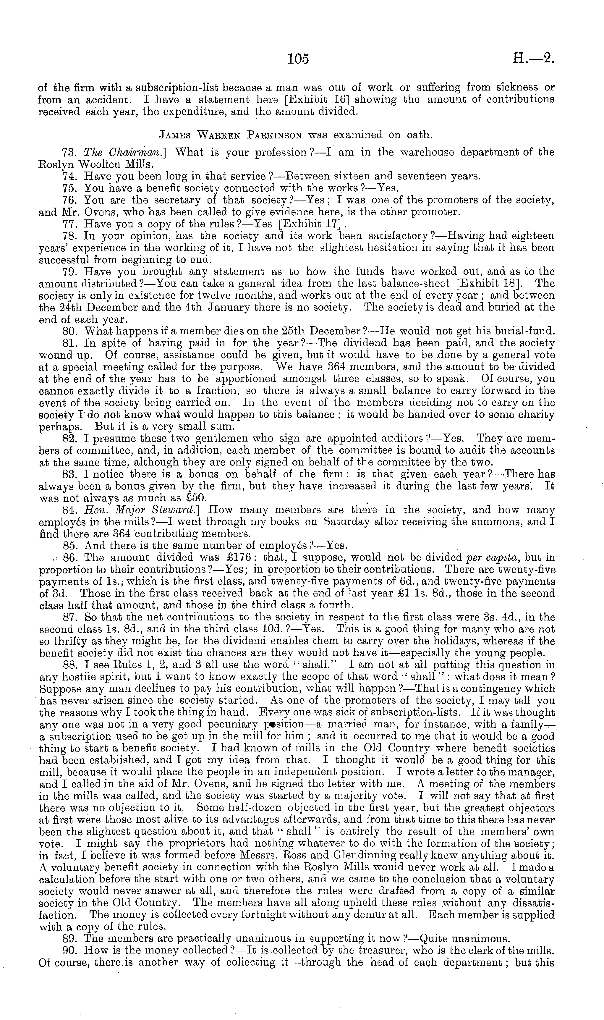 of the firm with a subscription-list because a man was out of work or suffering from sickness or from an accident. I have a statement here [Exhibit 16] showing the amount of contributions received each year, the expenditure, and the amount divided. James Warren Parkinson was examined on oath. 73. The Chairman.] What is your profession ? —I am in the warehouse department of the Eoslyn Woollen Mills. 74. Have you been long in that service ? —Between sixteen and seventeen years. 75. You have a benefit society connected with the works?— Yes. 76. You are the secretary of that society ?—Yes; I was one of the promoters of the society, and Mr. Ovens, who has been called to give evidence here, is the other promoter. 77. Have you a copy of the rules?— Yes [Exhibit 17]. 78. In your opinion, has the society and its work been satisfactory ?—Having had eighteen years' experience in the working of it, I have not the slightest hesitation in saying that it has been successful from beginning to end. 79. Have you brought any statement as to how the funds have worked out, and as to the amount distributed?— You can take a general idea from the last balance-sheet [Exhibit 18]. The society is only in existence for twelve months, and works out at the end of every year ; and between the 24th December and the 4th January there is no society. The society is dead and buried at the end of each year. 80. What happens if a member dies on the 25th December ?—He would not get his burial-fund. 81. In spite of having paid in for the year?— The dividend has been paid, and the society wound up. Of course, assistance could be given, but it would have to be done by a general vote at a special meeting called for the purpose. We have 364 members, and the amount to be divided at the end of the year has to be apportioned amongst three classes, so to speak. Of course, you cannot exactly divide it to a fraction, so there is always a small balance to carry forward in the event of the society being carried on. In the event of the members deciding not to carry on the society I' do not know what would happen to this balance ; it would be handed over to some charity perhaps. But it is a very small sum. 82. I presume these two gentlemen who sign are appointed auditors ?—Yes. They are members of committee, and, in addition, each member of the committee is bound to audit the accounts at the same time, although they are only signed on behalf of the committee by the two. 83. I notice there is a bonus on behalf of the firm : is that given each year ?—There has always been a bonus given by the firm, but they have increased it during the last few years. It was not always as much as £50. 84. Hon. Major Steward.] How many members are there in the society, and how many employes in the mills ?—I went through my books on Saturday after receiving the summons, and I find there are 364 contributing members. 85. And there is the same number of employes ?—Yes. p 86. The amount divided was £176: that, I suppose, would not be divided per capita, but in proportion to their contributions?— Yes; in proportion to their contributions. There are twenty-five payments of Is., which is the first class, and twenty-five payments of 6d., and twenty-five payments of 3d. Those in the first class received back at the end of last year £1 Is. Bd., those in the second class half that amount, and those in the third class a fourth. 87. So that the net contributions to the society in respect to the first class were 3s. 4d., in the second class Is. Bd., and in the third class lOd. ?—Yes. This is a good thing for many who are not so thrifty as they might be, for the dividend enables them to carry over the holidays, whereas if the benefit society did not exist the chances are they would not have it—especially the young people. 88. I see Eules 1, 2, and 3 all use the word " shall." lam not at all putting this question in any hostile spirit, but I want to know exactly the scope of that word " shall " : what does it mean ? Suppose any man declines to pay his contribution, what will happen ?—That is a contingency which has never arisen since the society started. As one of the promoters of the society, I may tell you the reasons why I took the thing in hand. Every one was sick of subscription-lists. If it w x as thought any one was not in a very good pecuniary position —a married man, for instance, with a family— a subscription used to be got up in the mill for him ; and it occurred to me that it would be a good thing to start a benefit society. I had known of mills in the Old Country where benefit societies had been established, and I got my idea from that. I thought it would be a good thing for this mill, because it would place the people in an independent position. I wrote a letter to the manager, and I called in the aid of Mr. Ovens, and he signed the letter with me. A meeting of the members in the mills was called, and the society was started by a majority vote. I will not say that at first there was no objection to it. Some half-dozen objected in the first year, but the greatest objectors at first were those most alive to its advantages afterwards, and from that time to this there has never been the slightest question about it, and that " shall " is entirely the result of the members' own vote. I might say the proprietors had nothing whatever to do with the formation of the society; in fact, I believe it was formed before Messrs. Eoss and Glendinning really knew anything about it. A voluntary benefit society in connection with the Eoslyn Mills would never work at all. I made a calculation before the start with one or two others, and we came to the conclusion that a voluntary society would never answer at all, and therefore the rules were drafted from a copy of a similar society in the Old Country. The members have all along upheld these rules without any dissatisfaction. The money is collected every fortnight without any demur at all. Eac