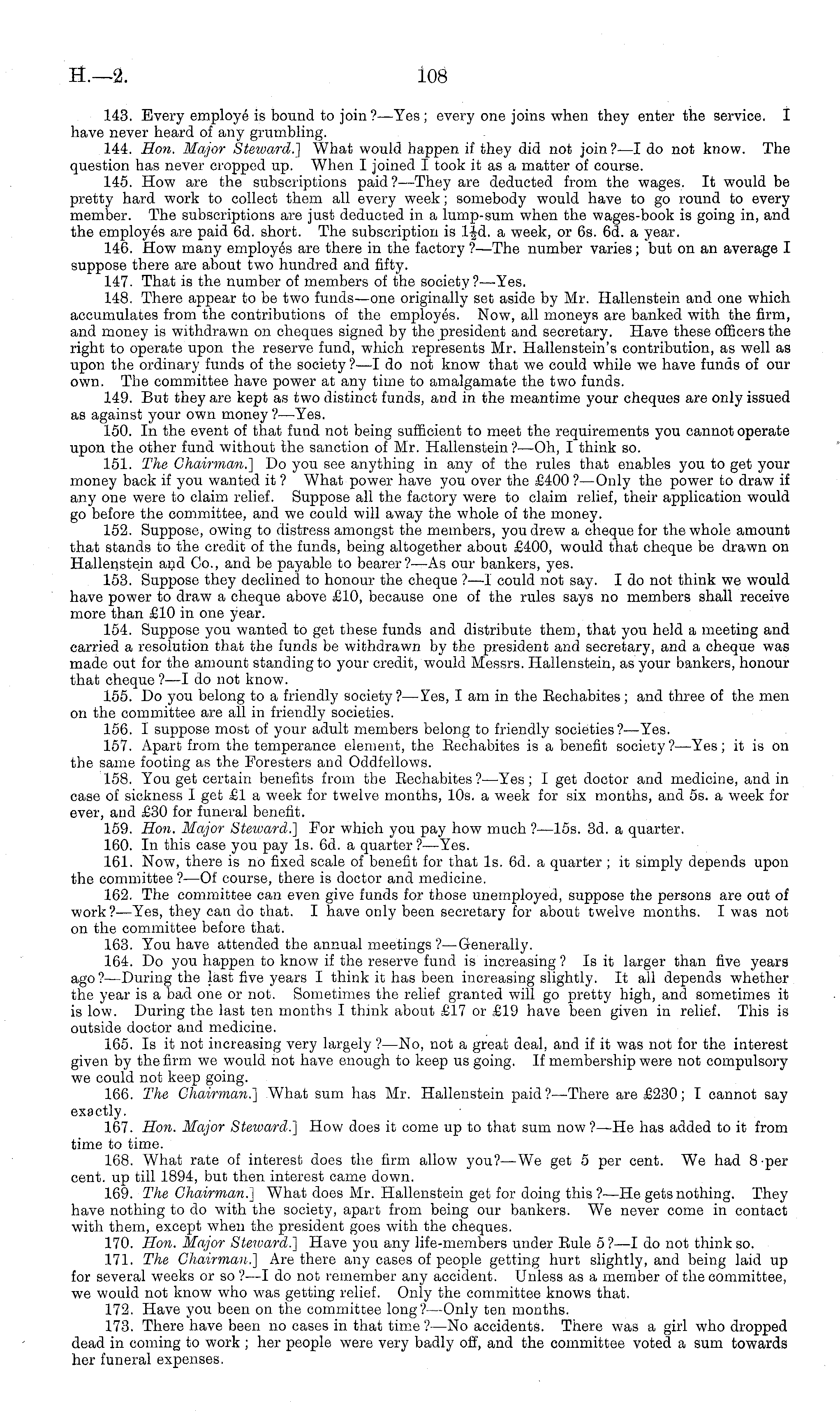 143. Every employe is bound to join?—Yes; every one joins when they enter the service. I have never heard of any grumbling. 144. Hon. Major Steward.] What would happen if they did not join ?—I do not know. The question has never cropped up. When I joined I took it as a matter of course. 145. How are the subscriptions paid? —They are deducted from the wages. It would be pretty hard work to collect them all every week; somebody would have to go round to every member. The subscriptions are just deducted in a lump-sum when the wages-book is going in, and the employes are paid 6d. short. The subscription is lid. a week, or 6s. 6d. a year. 146. How many employes are there in the factory ?—The number varies; but on an average I suppose there are about two hundred and fifty. 147. That is the number of members of the society?— Yes. 148. There appear to be two funds—one originally set aside by Mr. Hallenstein and one which accumulates from the contributions of the employes. Now, all moneys are banked with the firm, and money is withdrawn on cheques signed by the president and secretary. Have these officers the right to operate upon the reserve fund, which represents Mr. Hallenstein's contribution, as well as upon the ordinary funds of the society ?—I do not know that we could while we have funds of our own. The committee have power at any time to amalgamate the two funds. 149. But they are kept as two distinct funds, and in the meantime your cheques are only issued as against your own money ?—Yes. 150. In the event of that fund not being sufficient to meet the requirements you cannot operate upon the other fund without the sanction of Mr. Hallenstein ?—Oh, I think so. 151. The Chairman.] Do you see anything in any of the rules that enables you to get your money back if you wanted it ? What power have you over the £400 ?—Only the power to draw if any one were to claim relief. Suppose all the factory were to claim relief, their application would go before the committee, and we could will away the whole of the money. 152. Suppose, owing to distress amongst the members, you drew a cheque for the whole amount that stands to the credit of the funds, being altogether about £400, would that cheque be drawn on Hallenstein and Co., and be payable to bearer? —As our bankers, yes. 153. Suppose they declined to honour the cheque ?—I could not say. Ido not think we would have power to draw a cheque above £10, because one of the rules says no members shall receive more than £10 in one year. 154. Suppose you wanted to get these funds and distribute them, that you held a meeting and carried a resolution that the funds be withdrawn by the president and secretary, and a cheque was made out for the amount standing to your credit, would Messrs. Hallenstein, as your bankers, honour that cheque ? —I do not know. 155. Do you belong to a friendly society?— Yes, lam in the Eechabites; and three of the men on the committee are all in friendly societies. 156. I suppose most of your adult members belong to friendly societies?— Yes. 157. Apart from the temperance element, the Eechabites is a benefit society? —Yes; it is on the same footing as the Foresters and Oddfellows. 158. You get certain benefits from the Eechabites ?—Yes; I get doctor and medicine, and in case of sickness I get £1 a week for twelve months, 10s. a week for six months, and ss. a week for ever, and £30 for funeral benefit. 159. Hon. Major Steward.] For which you pay how much ?—lss. 3d. a quarter. 160. In this case you pay Is. 6d. a quarter? —Yes. 161. Now, there is no fixed scale of benefit for that Is. 6d. a quarter ; it simply depends upon the committee ?—Of course, there is doctor and medicine. 162. The committee can even give funds for those unemployed, suppose the persons are out of work ?—Yes, they can do that. I have only been secretary for about twelve months. I was not on the committee before that. 163. You have attended the annual meetings ?—Generally. 164. Do you happen to know if the reserve fund is increasing ? Is it larger than five years ago ?—During the last five years I think it has been increasing slightly. It all depends whether the year is a bad one or not. Sometimes the relief granted will go pretty high, and sometimes it is low. During the last ten months I think about £17 or £19 have been given in relief. This is outside doctor and medicine. 165. Is it not increasing very largely ? —No, not a great deal, and if it was not for the interest given by the firm we would not have enough to keep us going. If membership were not compulsory we could not keep going. 166. The Chairman.] What sum has Mr. Hallenstein paid?— There are £230; I cannot say exactly. 167. Hon. Major Steioard.] How does it come up to that sum now ?—He has added to it from time to time. 168. What rate of interest does the firm allow you?—We get 5 per cent. We had 8 per cent, up till 1894, but then interest came down. 169. The Chairman.] What does Mr. Hallenstein get for doing this? —He gets nothing. They have nothing to do with the society, apart from being our bankers. We never come in contact with them, except when the president goes with the cheques. 170. Hon. Major Steward.] Have you any life-members under Eule 5 ?—I do not think so. 171. The Chairman.] Are there any cases of people getting hurt slightly, and being laid up for several weeks or so ? —I do not remember any accident. Unless as a member of the committee, we would not know who was getting relief. Only the committee knows that. 172. Have you been on the committee long? —Only ten months. 173. There have been no cases in that time ?—No accidents. There was a girl who dropped dead in coming to work ; her people were very badly off, and the committee voted a sum towards her funeral expenses.