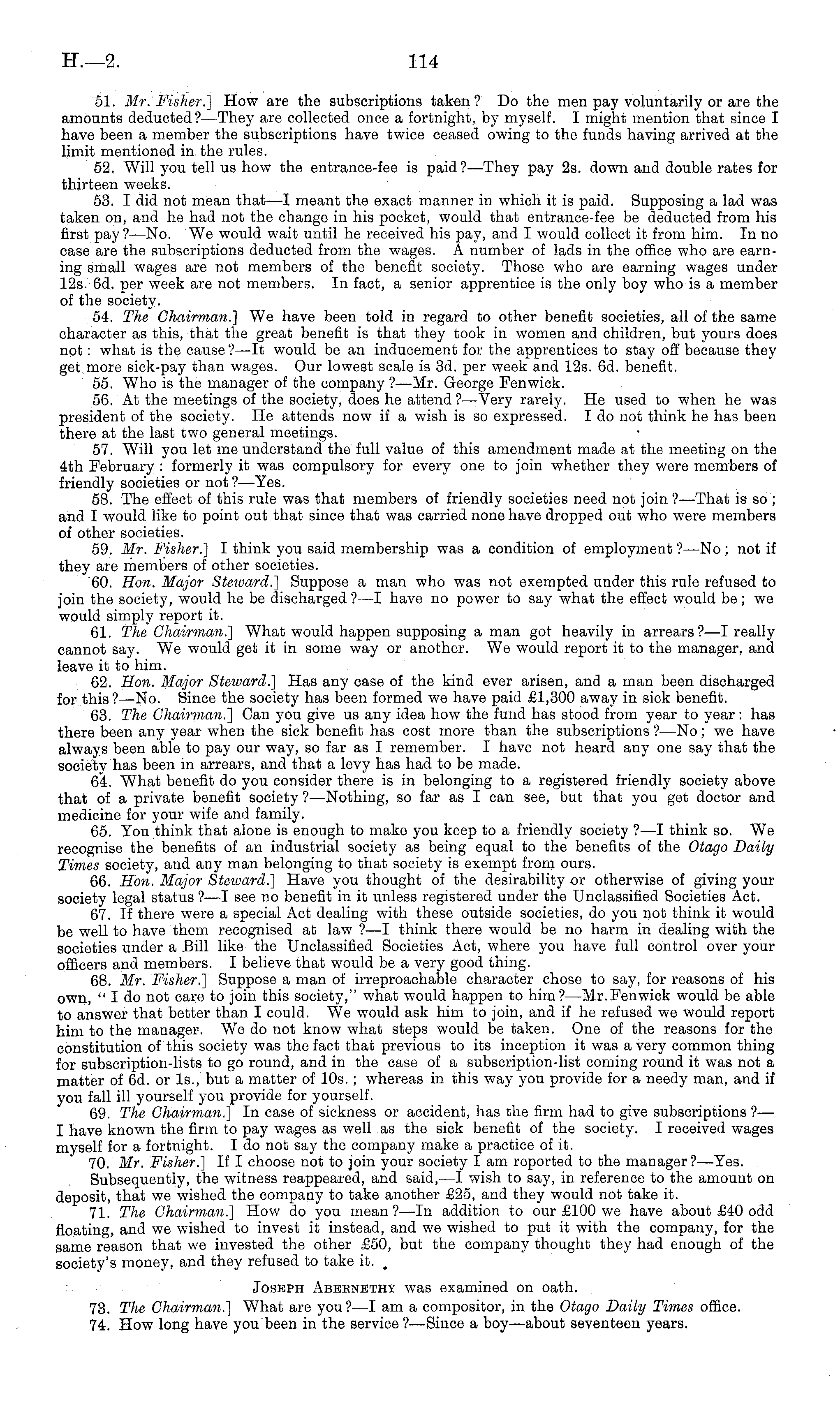 51. Mr. Fisher.] How are the subscriptions taken? Do the men pay voluntarily or are the amounts deducted?— They are collected once a fortnight, by myself. I might mention that since I have been a member the subscriptions have twice ceased owing to the funds having arrived at the limit mentioned in the rules. 52. Will you tell us how the entrance-fee is paid?— They pay 2s. down and double rates for thirteen weeks. 53. I did not mean that —I meant the exact manner in which it is paid. Supposing a lad was taken on, and he had not the change in his pocket, would that entrance-fee be deducted from his first pay ?—No. We would wait until he received his pay, and I would collect it from him. In no case are the subscriptions deducted from the wages. A number of lads in the office who are earning small wages are not members of the benefit society. Those who are earning wages under 12s. 6d. per week are not members. In fact, a senior apprentice is the only boy who is a member of the society. 54. The Chairman.] We have been told in regard to other benefit societies, all of the same character as this, that the great benefit is that they took in women and children, but yours does not: what is the cause ?—lt would be an inducement for the apprentices to stay off because they get more sick-pay than wages. Our lowest scale is 3d. per week and 12s. 6d. benefit. 55. Who is the manager of the company ? —Mr. George Fenwick. 56. At the meetings of the society, does he attend ?—Very rarely. He used to when he was president of the society. He attends now if a wish is so expressed. Ido not think he has been there at the last two general meetings. 57. Will you let me understand the full value of this amendment made at the meeting on the 4th February : formerly it was compulsory for every one to join whether they were members of friendly societies or not ?—Yes. 58. The effect of this rule was that members of friendly societies need not join ?—That is so ; and I would like to point out that since that was carried none have dropped out who were members of other societies. 59. Mr. Fisher.] I think you said membership was a condition of employment ? —No; not if they are members of other societies. 60. Hon. Major Steward.] Suppose a man who was not exempted under this rule refused to join the society, would he be discharged ? —I have no power to say what the effect would be; we would simply report it. 61. The Chairman.] What would happen supposing a man got heavily in arrears? —I really cannot say. We would get it in some way or another. We would report it to the manager, and leave it to him. 62. Hon. Major Steward.] Has any case of the kind ever arisen, and a man been discharged for this? —No. Since the society has been formed we have paid £1,300 away in sick benefit. 63. The Chairman.] Can you give us any idea how the fund has stood from year to year: has there been any year when the sick benefit has cost more than the subscriptions ?—No; we have always been able to pay our way, so far as I remember. I have not heard any one say that the society has been in arrears, and that a levy has had to be made. 64. What benefit do you consider there is in belonging to a registered friendly society above that of a private benefit society ?—Nothing, so far as I can see, but that you get doctor and medicine for your wife and family. 65. You think that alone is enough to make you keep to a friendly society ? —I think so. We recognise the benefits of an industrial society as being equal to the benefits of the Otago Daily Times society, and any man belonging to that society is exempt from ours. 66. Hon. Major Steward.] Have you thought of the desirability or otherwise of giving your society legal status ?—I see no benefit in it unless registered under the Unclassified Societies Act. 67. If there were a special Act dealing with these outside societies, do you not think it would be well to have them recognised at law ?—I think there would be no harm in dealing with the societies under a Bill like the Unclassified Societies Act, where you have full control over your officers and members. I believe that would be a very good thing. 68. Mr. Fisher.] Suppose a man of irreproachable character chose to say, for reasons of his own, " I do not care to join this society," what would happen to him?—Mr.Fenwick would be able to answer that better than I could. We would ask him to join, and if he refused we would report him to the manager. We do not know what steps would be taken. One of the reasons for the constitution of this society was the fact that previous to its inception it was a very common thing for subscription-lists to go round, and in the case of a subscription-list coming round it was not a matter of 6d. or Is., but a matter of 10s.; whereas in this way you provide for a needy man, and if you fall ill yourself you provide for yourself. 69. The Chairman.] In case of sickness or accident, has the firm had to give subscriptions ?— I have known the firm to pay wages as well as the sick benefit of the society. I received wages myself for a fortnight. Ido not say the company make a practice of it. 70. Mr. Fisher.] If I choose not to join your society I am reported to the manager?— Yes. Subsequently, the witness reappeared, and said, —I wish to say, in reference to the amount on deposit, that we wished the company to take another £25, and they would not take it. 71. The Chairman.] How do you mean ? —ln addition to our £100 we have about £40 odd floating, and we wished to invest it instead, and we wished to put it with the company, for the same reason that we invested the other £50, but the company thought they had enough of the society's money, and they refused to take it. m Joseph Abernethy was examined on oath. 73. The Chairman.] What are you ?—I am a compositor, in the Otago Daily Times office. 74. How long have you been in the service ?—Since a boy—about seventeen years.